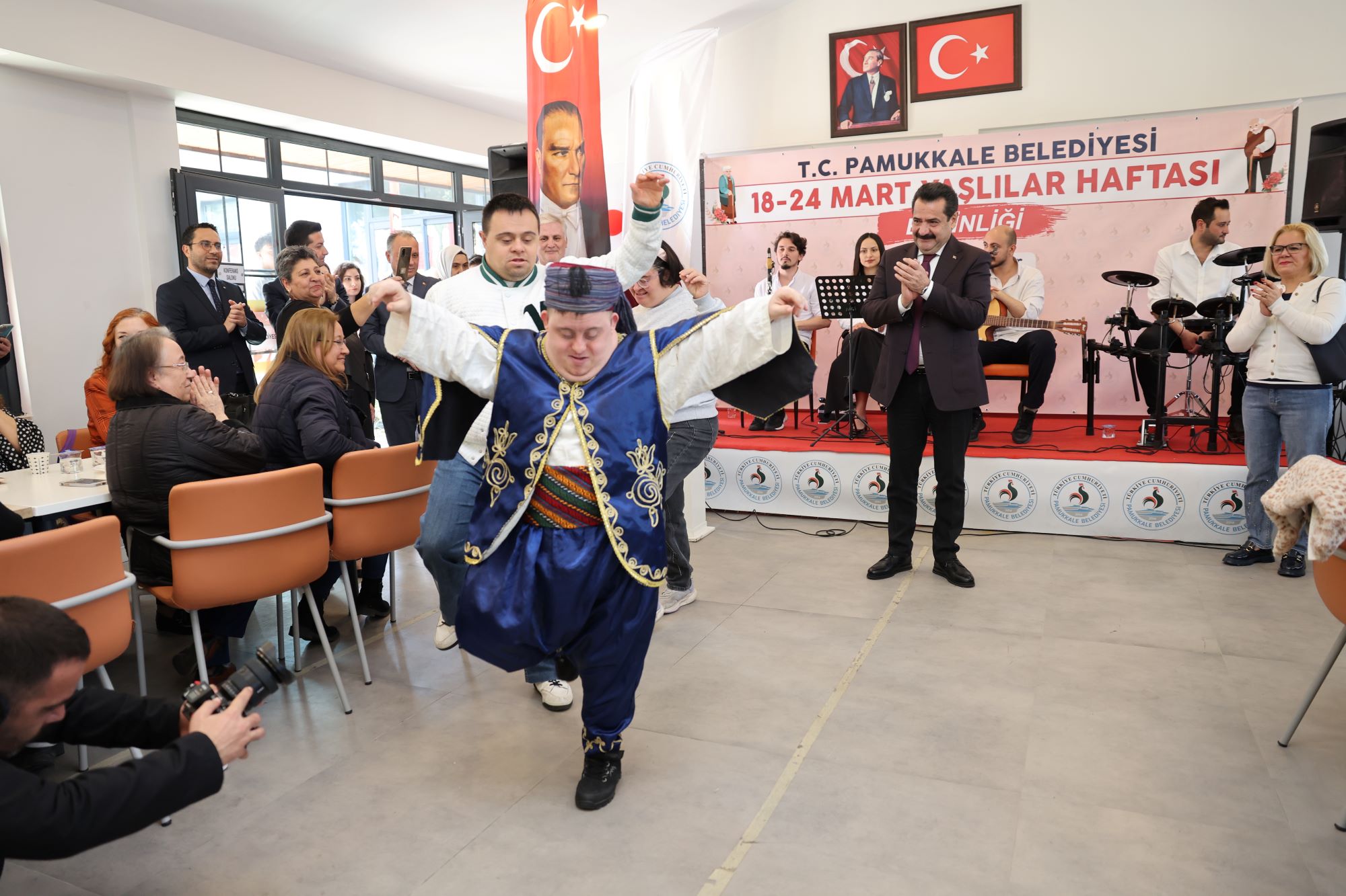 Pamukkale Belediyesi’nce Yaşlılara Saygı Haftası kapsamında düzenlenen gönülleri fetheden etkinlik, İbrahim Kabasoluk, Ramazan Mert Erok ve Hacer Altınoluk’un sergilediği Zeybek gösterisi ile başladı. Geleneksel motiflerle sahne alan özel bireyler, izleyenlerden büyük alkış toplarken; Pamukkale Belediye Başkanı Ali Rıza Ertemur gösteri sonrası performans sergileyen isimleri tek tek tebrik etti.
