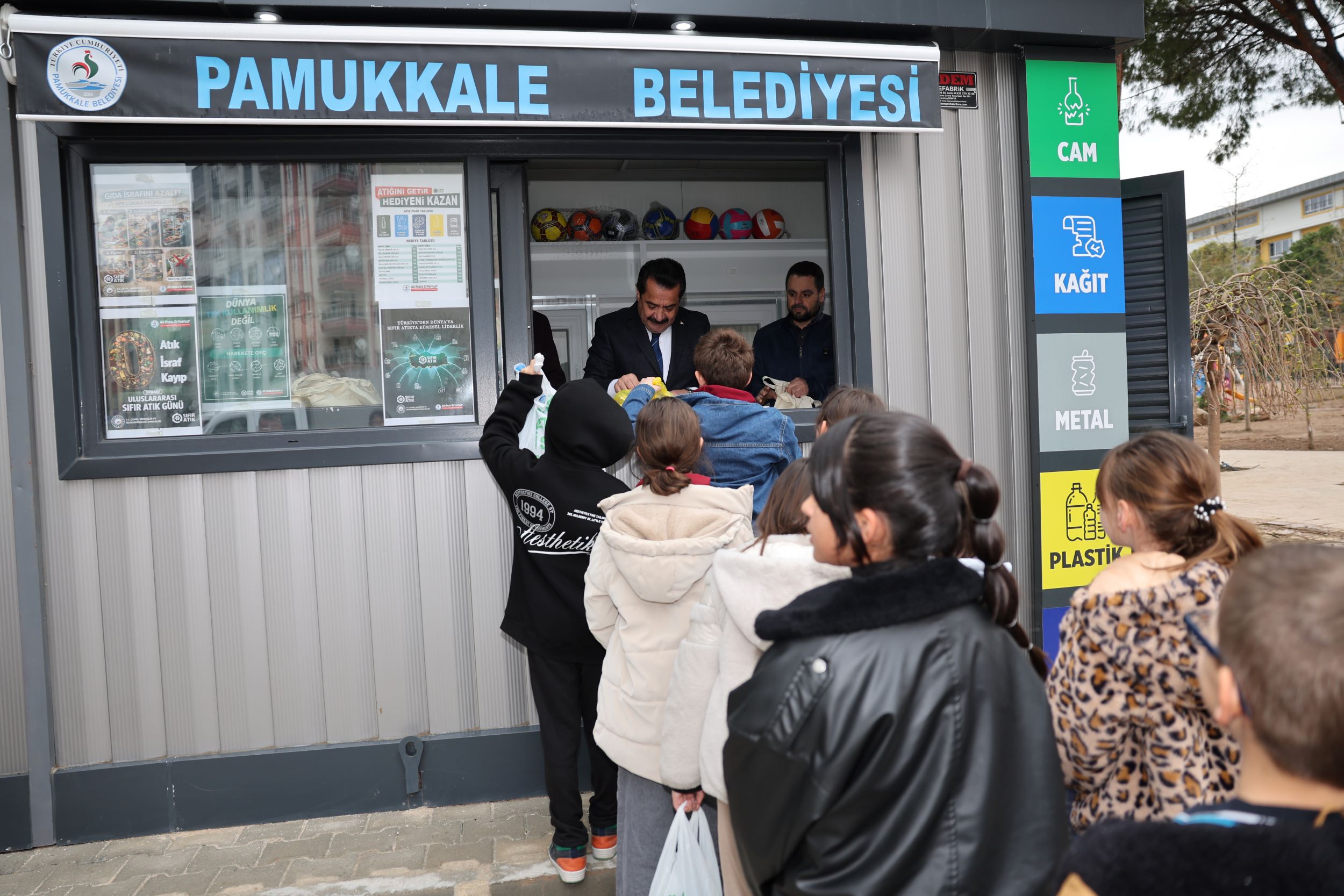 Evlerinde ve okullarında titizlikle biriktirdikleri atıklarla merkeze gelen minik çevrecileri, Pamukkale Belediye Başkanı Ali Rıza Ertemur karşıladı. “Atığını Getir, Hediyeni Kazan” sloganıyla hayata geçirilen sistemde öğrenciler, teslim ettikleri atıklar karşılığında puan topladı. Biriken puanlar; futbol toplarından Jenga setlerine, oyuncaklardan çeşitli kırtasiye ürünlerine kadar pek çok hediyeye dönüştü. Hediyelerini bizzat Başkan Ertemur’un elinden alan çocukların mutluluğu, sıfır atık bilincinin en güzel meyvesi oldu.