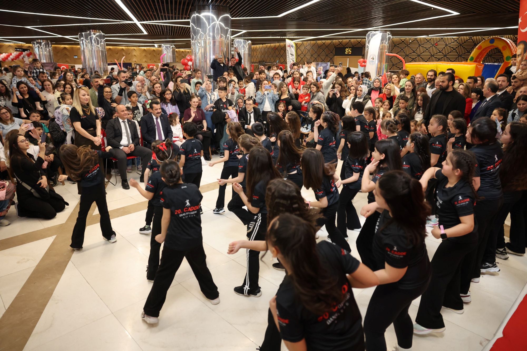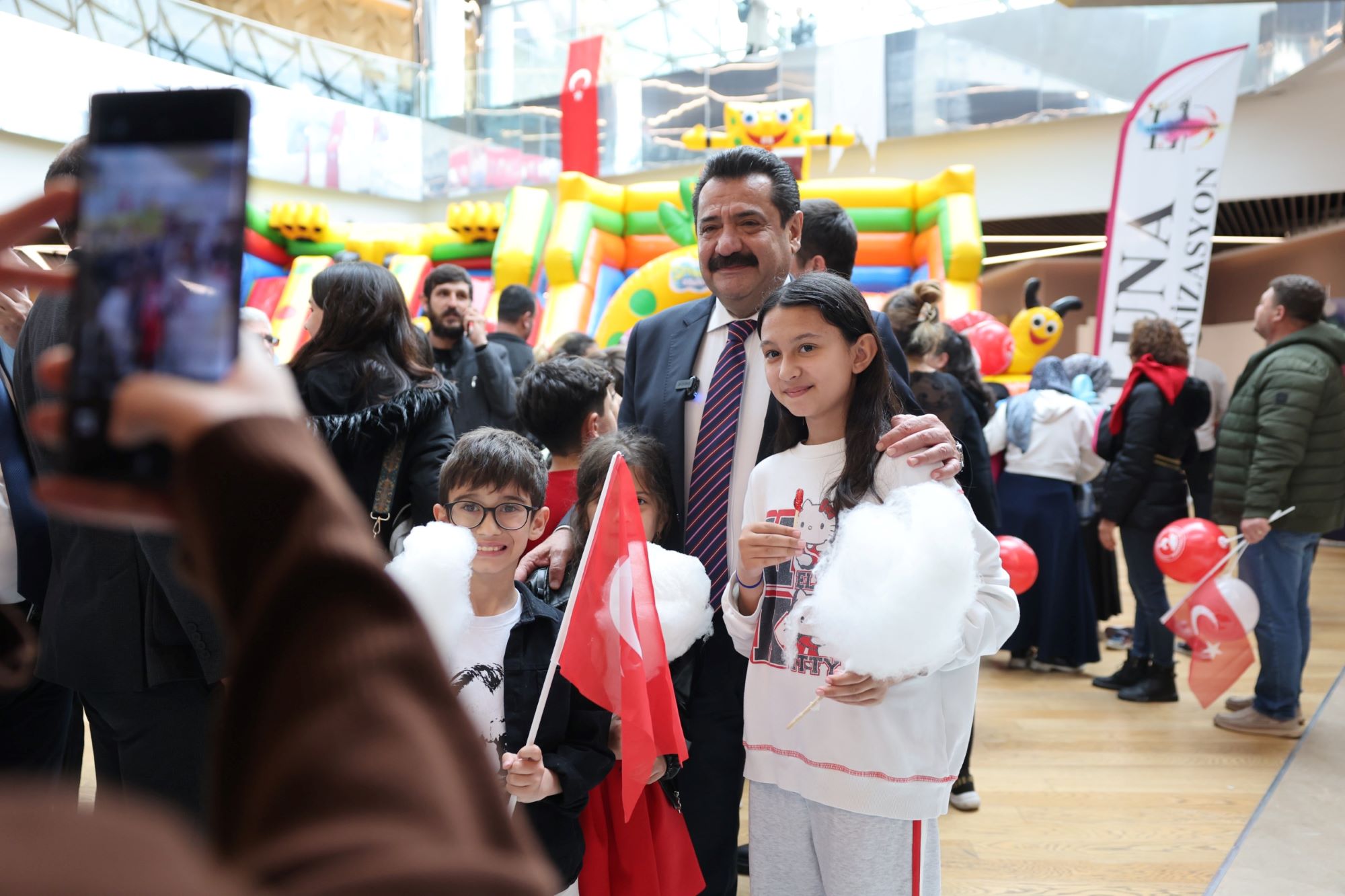 Alanı dolduran binlerce çocuğa dağıtılan Türk bayrakları ve renkli balonlar, merkezi adeta kırmızı-beyaz bir görsel şölene çevirerek bayram ruhunu doruğa çıkardı. Bu coşkuya eşlik eden taze pamuk şeker, popcorn ve geleneksel Osmanlı macunu gibi ücretsiz ikramlar ise minik misafirlerin bayram sevincine tatlı bir dokunuş kattı.