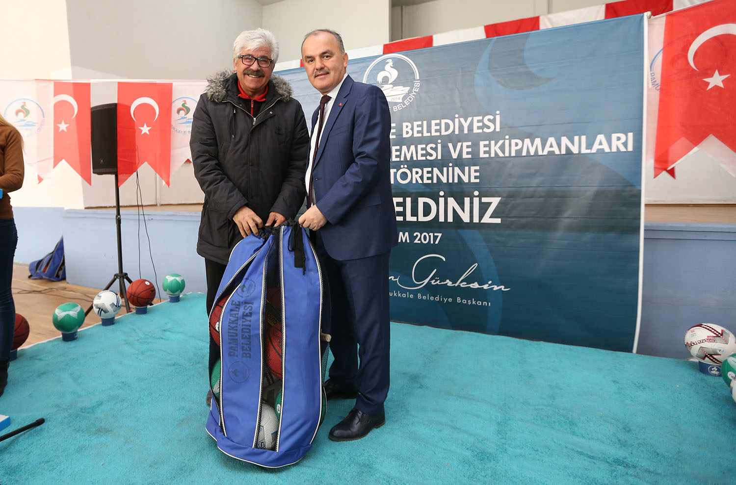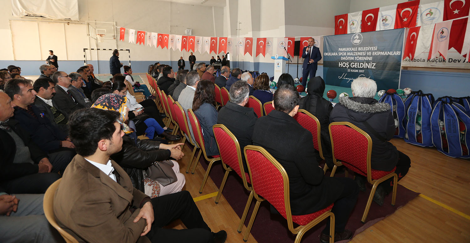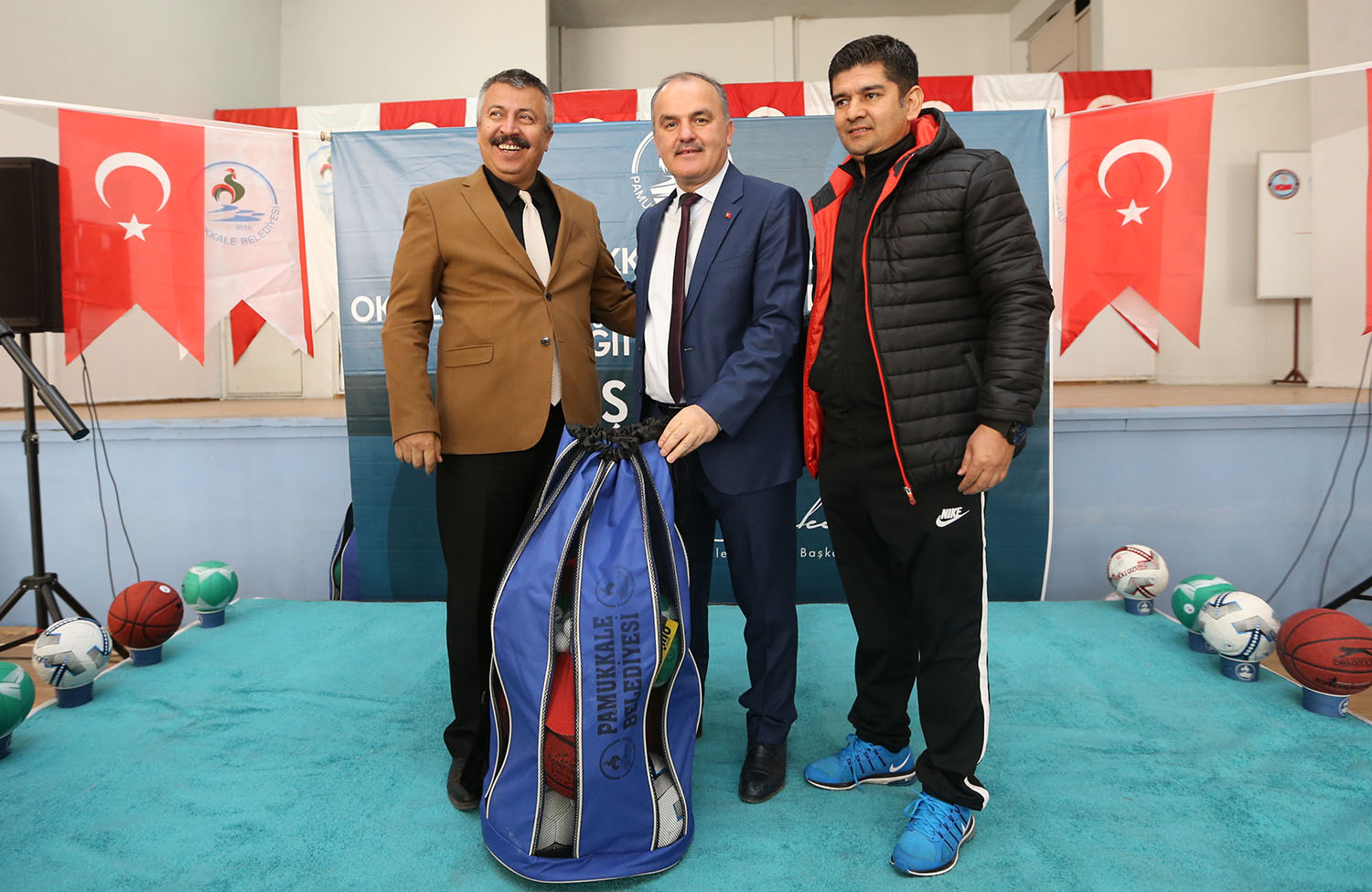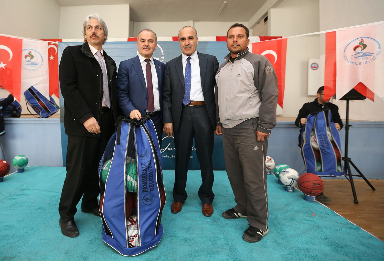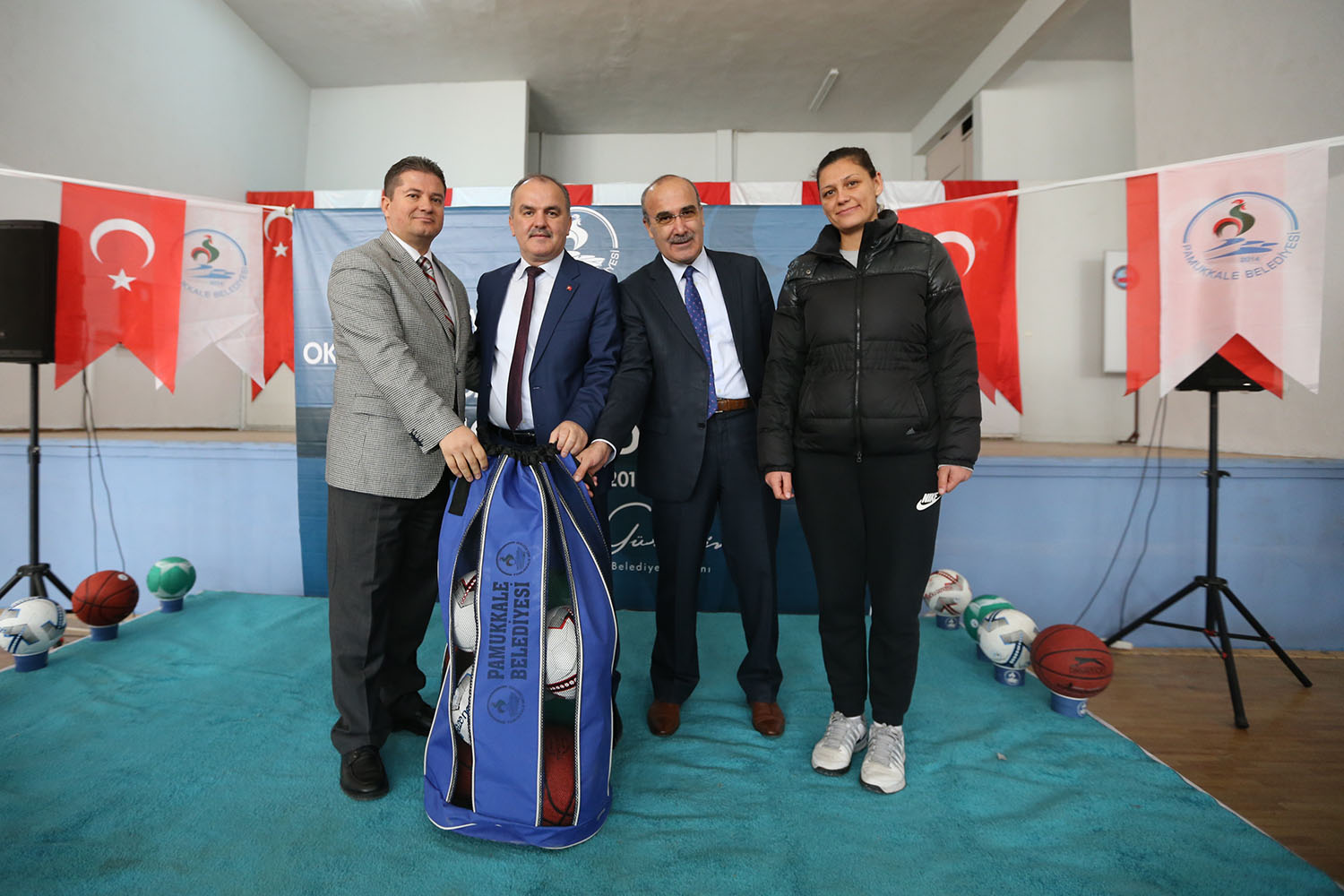 Pamukkale Belediye Başkanı Hüseyin Gürlesin, Pamukkale Belediyesi olarak okullara gerçek anlamda katkı vermeye çalıştıklarını söyledi. Eğitimde kaliteyi artırmak için tüm gayreti sarf etiklerini belirten Başkan Gürlesin, “Okullarımızda fiziki şartlardan tutun da, konferans salonlarına, spor komplekslerinden, halı sahalara, çöp kutularına kadar okullarımıza küçük dokunuşlarla eğitimdeki kaliteye katkı vermek için elimizden gelen bütün gayreti gösteriyoruz. Sporun da çok önemli olduğunun bilincindeyiz. Sağlıklı nesillerin yetişmesine katkıda bulunmak için sporunda bütün branşlarını dikkate almaya çalışıyoruz. Yapmış olduğumuz bir araştırmada okullarımızın malzeme eksikliğinden dolayı öğrencilerimizin bazı spor dallarını yapamadığını gördük. Biz de bu eksikliği gözeterek bütün okullarımıza basketbol, voleybol, futbol ve masa tenisi malzeme eksikliğini giderelim istedik. Bütün okullarımıza 3’er tane bu saymış olduğum malzemeleri hediye ediyoruz. Ki okullarımızda bundan sonra malzeme eksikliğinden dolayı spor yapılamamazlık olmasın istiyoruz” diye konuştu.