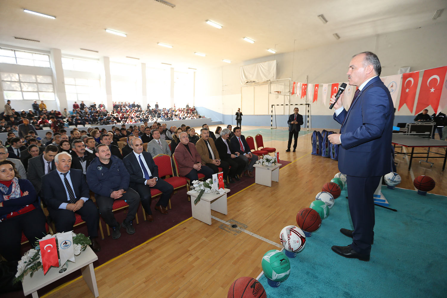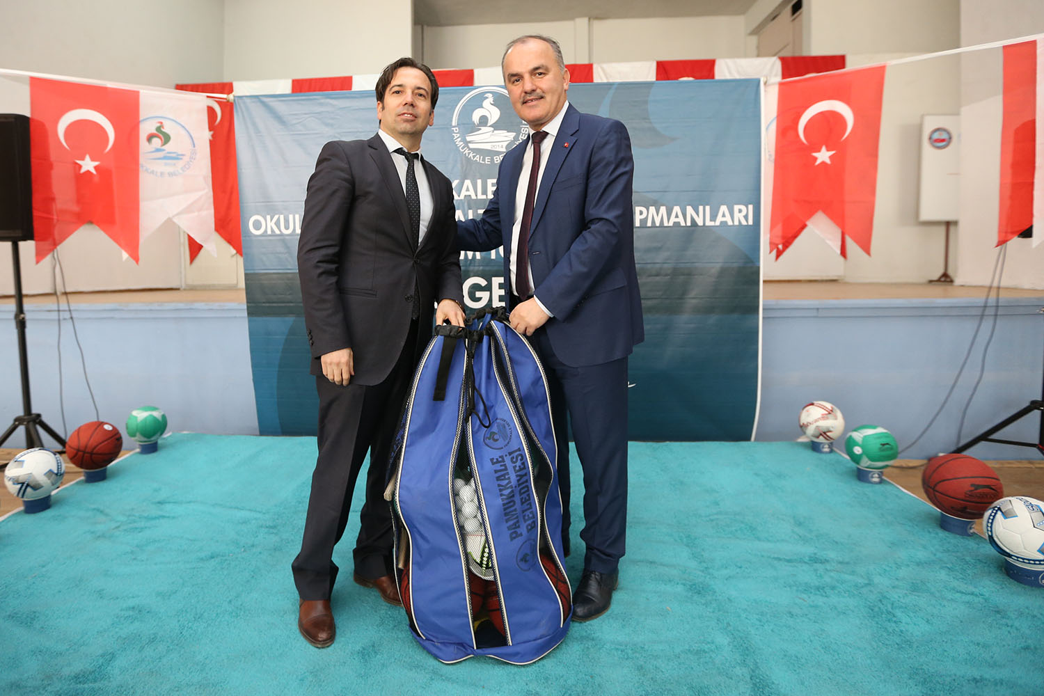 Atatürk Endüstri Meslek ve Teknik Anadolu Lisesi’nde düzenlenen törende konuşan Pamukkale İlçe Milli Eğitim Müdürü Reşat Erdoğan, Pamukkale Belediye Başkanı Hüseyin Gürlesin’in okullardaki banklardan, çöp kutularına, halı sahlardan, konferans salonlarına kadar her konuda eğitime destek verdiğini söyleyerek, kendisine teşekkür etti. Erdoğan, “Güçlü bir nesil istiyorsak, mutlakla ailemizin de desteğine ihtiyacımız var, mahalli yönetimlerinde desteğine ihtiyacımız var. Başkanımızın birçok desteği yanında bugünde, 132 okulumuzun tamamının spor malzemesi eksikliğini gideriyor. Ben bu konuda eğitime verdiği katkıdan dolayı sayın başkanımız Hüseyin Gürlesin başta olmak üzere tüm ekibine teşekkür ediyorum” dedi.
