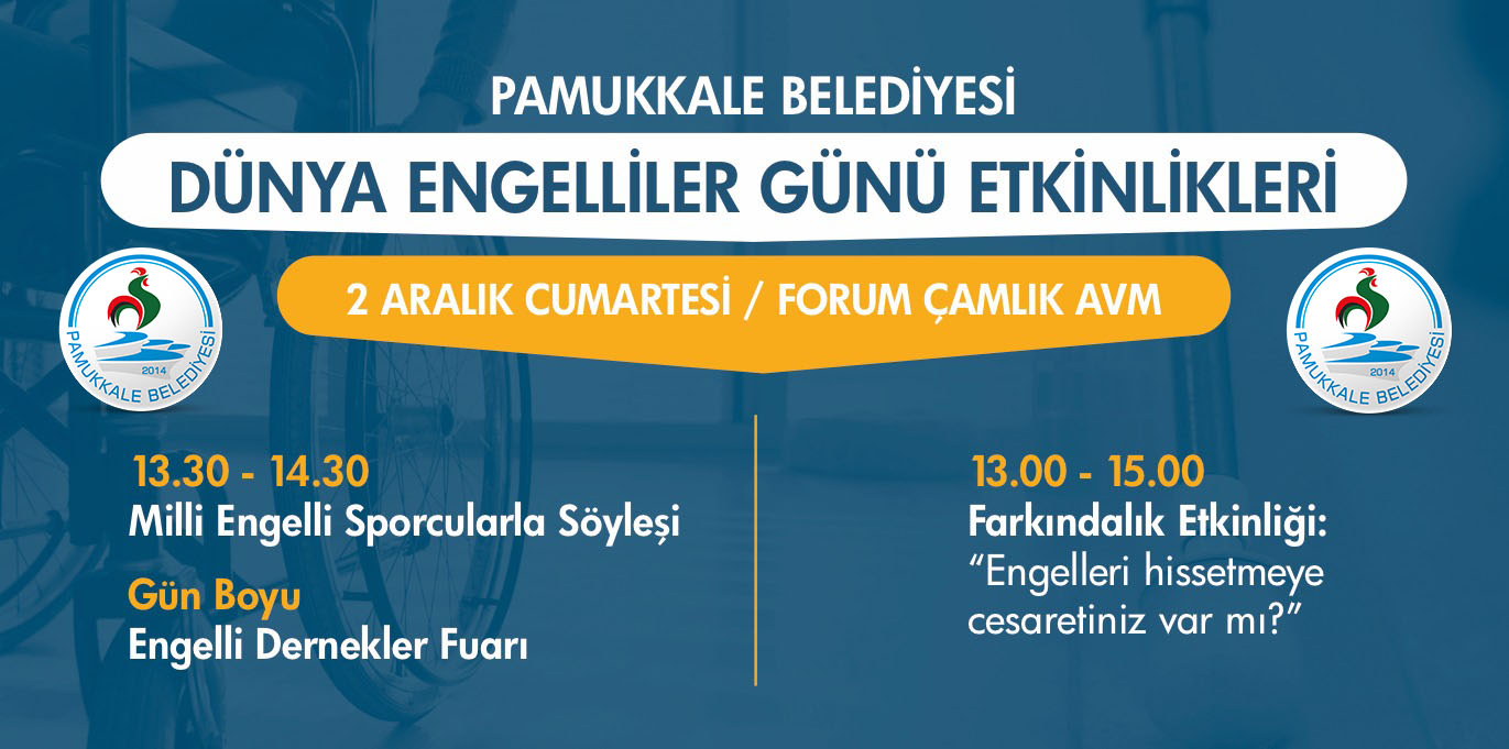 Pamukkale Belediyesi, Dünya Engelliler Günü dolayısıyla 2 Aralık Cumartesi günü Forum Çamlık’ta ‘Engelleri Hissetmeye Cesaretiniz Var Mı?’ adlı program düzenledi. 13.00 ile 15.00 saatleri arasında ‘Engelleri Hissetmeye Cesaretiniz Var Mı?’ programı yapılırken, Saat 13.30-14.30 saatleri arasında da Milli Engelli Sporcularla Söyleşi gerçekleştirilecek. Farkındalık etkinliği, gün boyu devam ederken, Engelli Dernekler Fuarı da açılacak. Pamukkale Belediye Başkanı Hüseyin Gürlesin, tüm duyarlı vatandaşları bu önemli etkinliğe davet ederek, “Hepimiz engelli olmaya adayız. Pamukkale Belediyesi olarak, engelli vatandaşlarımızın sosyal yaşamlarında yaşadıkları zorlukları hep birlikte görelim, deneyimleyelim istedik. Bu amaçla, hep birlikte engelleri aşmak için ne yapabiliriz, engelli olmak mı engelli olmamak mı öğrenmemiz gereken gibi birçok sorunun da cevabını bulabileceğimiz ücretsiz olan etkinliğimize tüm vatandaşlarımızı bekliyoruz. ‘Engelleri Hissetmeye Cesaretiniz Var Mı?’ programında engellilerin gündelik yaşamda yaşadıkları sıkıntıları engelli olmayan kişilerin hissetmesi programın amacı ” dedi.