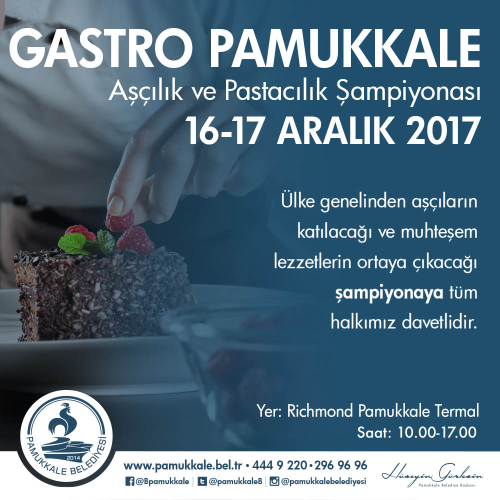 Pamukkale’de yaşamanın bir ayrıcalık olduğunu, tek bir alanda değil her alanda göstermeye devam eden Pamukkale Belediyesi, ilçenin adını spordan, sanata her alanda duyurmak için farklı projelere imza atmaya devam ediyor. Pamukkale Belediye Başkanı Hüseyin Gürlesin, 16-17 Aralık 2017 tarihleri arasında Richmond Pamukkale Termal Otel’de düzenlenecek olan ‘Gastro Pamukkale Aşçılık ve Pastacılık Şampiyonası’nın ilçe tanıtımı için yapılan renkli ve farklı etkinliklerden biri olacağını belirtti. Dünyaca ünlü aşçıların eğitimler vereceği, workshop çalışmalarının düzenleneceği ‘Gastro Pamukkale Aşçılık ve Pastacılık Şampiyonası’ 2 gün boyunca butik pastacılık alanında figür eğitimleri, animasyon modelleme, artistik teknikler, balık, et, tavuk yemekleri üzerine yarışmalar düzenlenecek.
