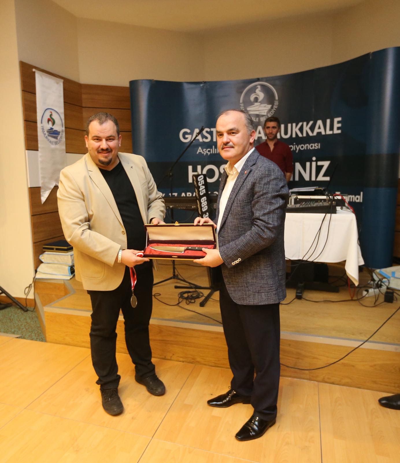 ‘Gastro Pamukkale Aşçılık ve Pastacılık Şampiyonası’nın galası yoğun katılımla gerçekleşti. Gün boyu yapılan yemekler ve pastalar beğeniye sunuldu. Dereceye girenlerin ödüllendirildiği galada konuşan Gastro Derneği Başkanı Köksal Zengin Köksal, Pamukkale Belediyesi’nin verdiği destek için teşekkür ederek, “Biz böyle bir etkinliği yapacağımız zaman sayın başkan ile görüşmeler yaptık. Pamukkale Belediyesi’nin verdiği destekle bu etkinliği yaptık. Türkiye’nin en önemli isimleri buraya geldi. Katılan herkese teşekkür ederim” diye konuştu. Pamukkale Belediye Başkanı Hüseyin Gürlesin ise Pamukkale adının her platformda duyulmasını istediklerini belirterek, “Pamukkale sadece turizm ile tanınmayacak. Aşçılık çok önemli bir sektör. Bu sektörün önemli isimlerinin Pamukkale’ye gelmesi de güzel. Biz Pamukkale’nin adını her şekilde duyurmak istiyoruz. Termal sağlık ile birlikte Pamukkale Spor Oyunları ile spor alanında ilçemizi tanıttık. Şimdi de bu etkinlikle ülkemizin dikkatini gastronomi ile çektik. Gerçekten çok önemli isimlerin jüri üyeliği yaptığı yarışmalarda ortaya çıkan eserler de çok değerli. Biz Pamukkale Belediyesi olarak bu tür etkinliklerde yer almaya devam edeceğiz” dedi. Konuşmaların ardından Gastro Derneği Başkanı Köksal Zengin Köksal, desteklerinden dolayı Pamukkale Belediye Başkanı Hüseyin Gürlesin’e teşekkür plaketi verdi. Törenin devamında ‘Gastro Pamukkale Aşçılık ve Pastacılık Şampiyonası’na sponsorluk desteği veren kişi ve kuruluşlara da çeşitli plaketler verildi.