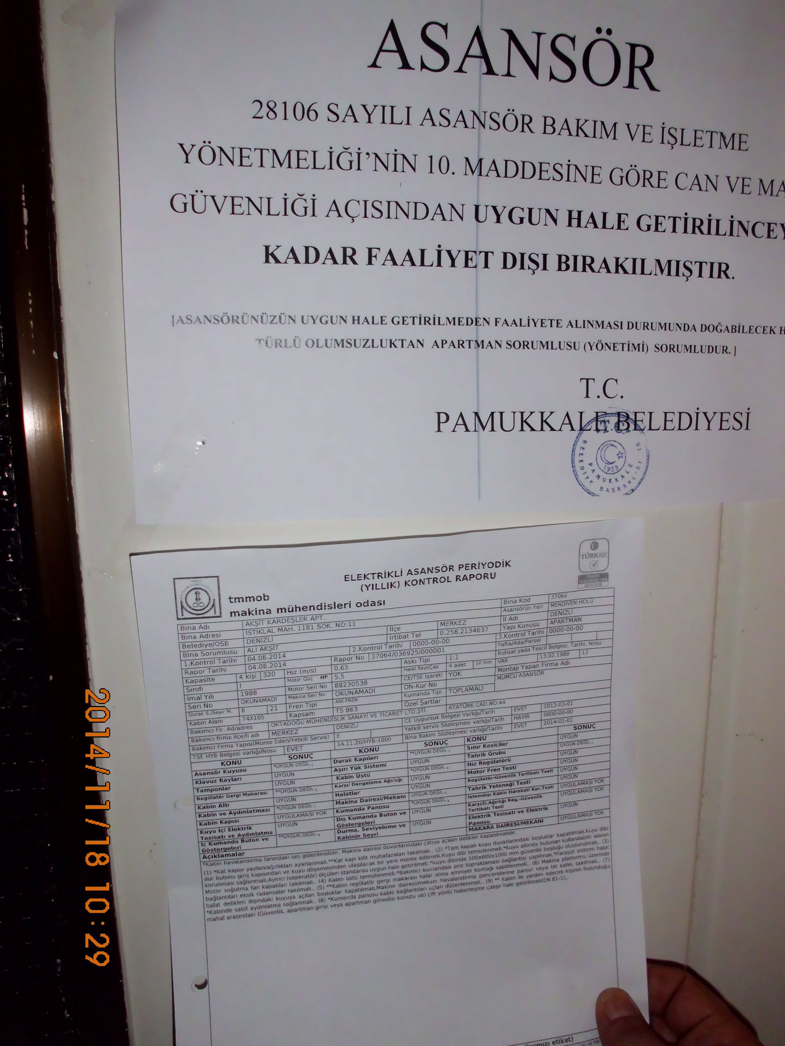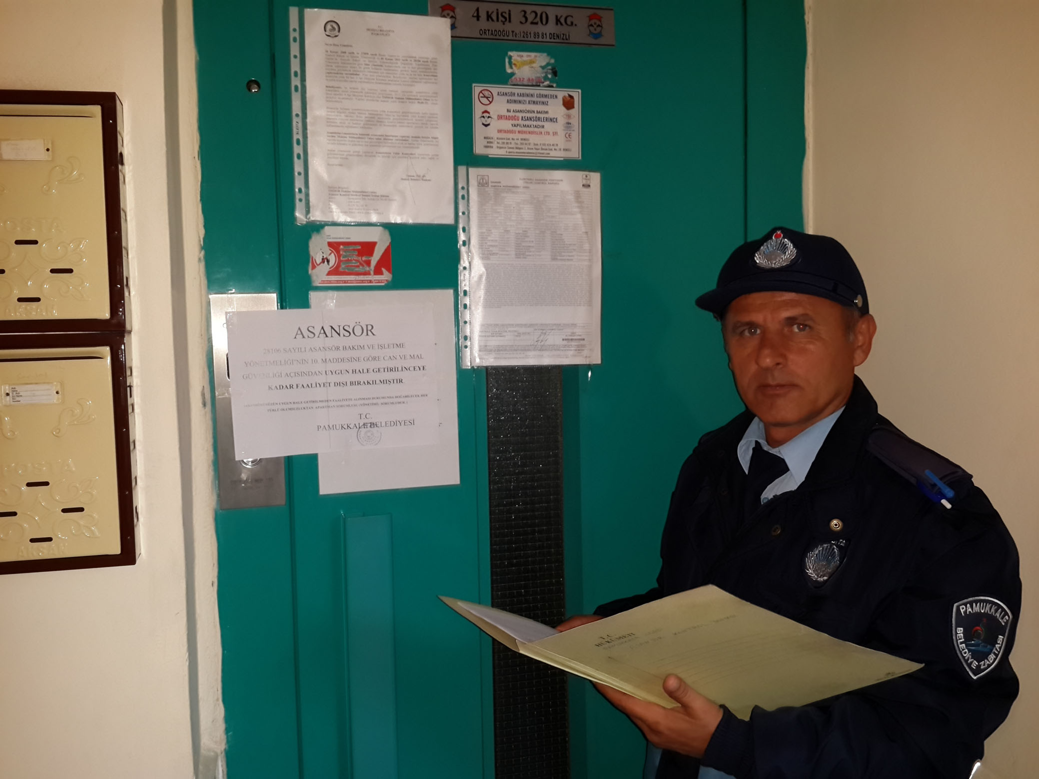 05 Kasim 2011 tarihli ve 28106 sayili Resmi Gazetede yayimlanan ‘Asansör Bakim ve Isletme Yönetmeligi’nde Degisiklik yapilmasina iliskin yönetmelik’ hükümleri geregince Pamukkale Belediyesi ile Türkiye Mühendisler Mimarlar Odasi Birligi (TMMOB) Makine Mühendisleri Odasi Denizli Subesi protokol imzalanarak isbirligi yapildi. Buna göre, Makine Mühendisleri Odasi Denizli Subesi yillik bakimi yapilma zamani gelen asansörleri Pamukkale Belediyesi’ne bildiriyor. Belediye ise söz konusu denetim ekibiyle bildirilen tüm asansörlerin yillik bakimlarini kontrol ediyor. Bir haftadir devam eden denetimlerde 180 asansörün yasaya uygun sekilde hizmet verip vermedigi denetlendi. Denetimlerde, can ve mal kaybina yol açabilecek sekilde güvenli olmadan ve yillik bakimi gelip bakimi yaptirilmayan 37 asansör tespit edildi. Ekipler, 37 asansörü yillik bakimlari yapilincaya kadar hizmet disi birakti.