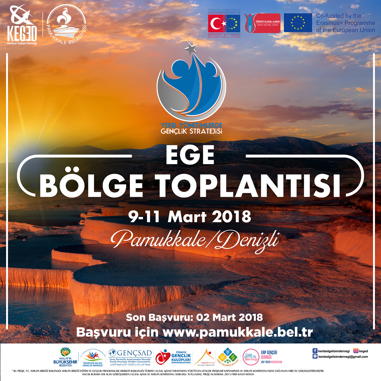 Kentsel Gelişim Derneği KEGED tarafından yürütülen Yerel Yönetimlerde Gençlik Stratejisi Projesi, T.C. Avrupa Birliği Bakanlığı AB Eğitim ve Gençlik Programları Merkezi Başkanlığı Türkiye Ulusal Ajansı tarafından yürütülen Gençlik Projeleri kapsamında ve Avrupa Komisyonundan sağlanan hibe ile düzenlenen programın Ege Bölgesi toplantısı için son başvuru tarihi 2 Mart 2018. Ege Bölge Koordinatörlüğü Pamukkale Belediyesi tarafından yürütülen projeye seçilen katılımcılara Youthpass sertifikası da verilecek. Katılımcılar 4 Mart 2018 günü seçilerek ve www.pamukkale.bel.tr ve www.facebook.com/kentselgelisimdernegi adreslerinden ilan edilecek. Ayrıca kişiler ile telefonla iletişime geçilecek. Toplantıya seçilenlerin konaklama ve ulaşım masrafları proje kapsamında karşılanacak. Toplantının teknik detayları ile ilgili bilgiler seçilen katılımcılara ayrıca paylaşılacak. Başvuru ve detaylı bilgi için www.pamukkale.bel.tr adresini ziyaret edebilirsiniz.