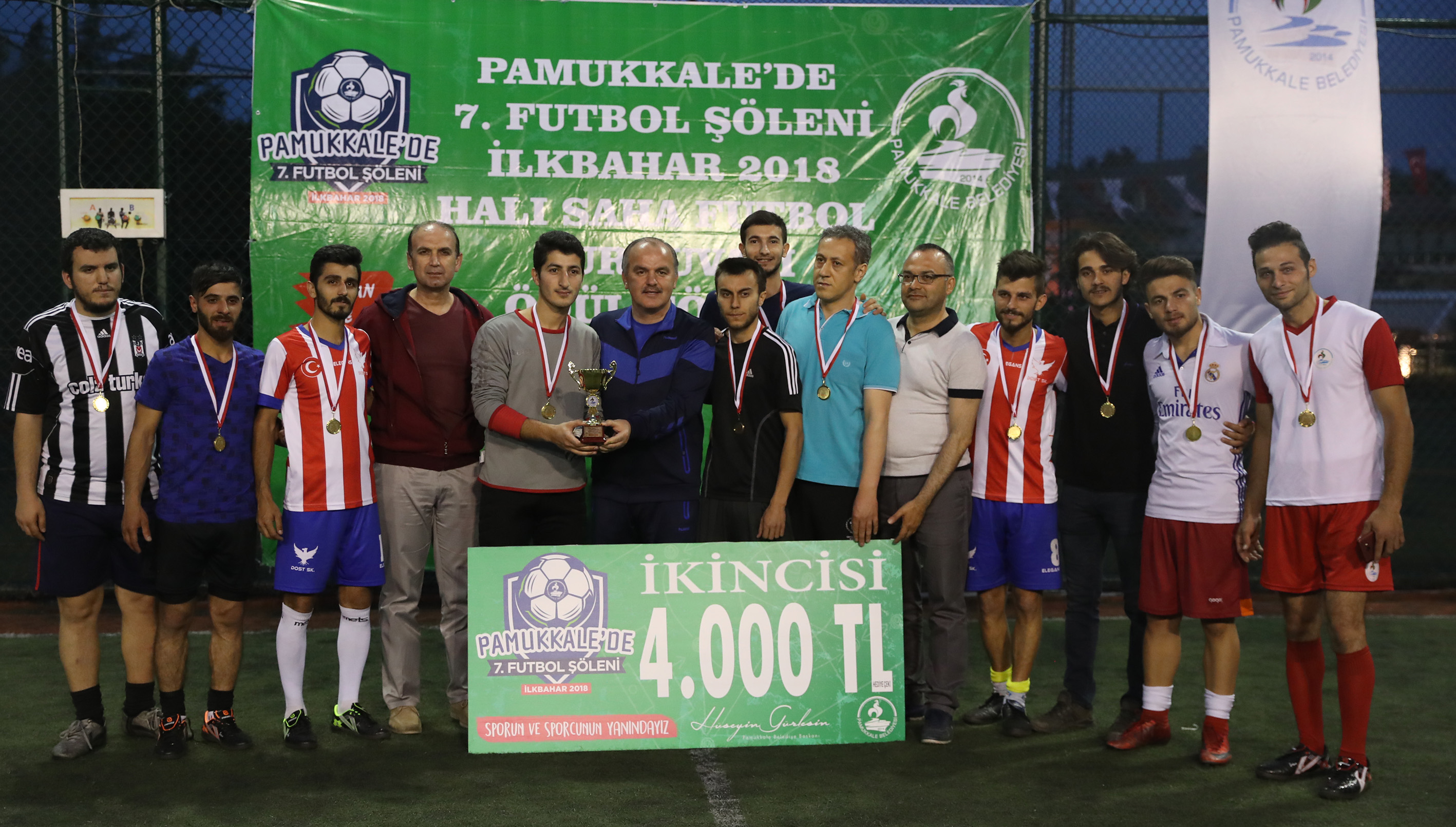 “Pamukkale’de 7. Futbol Şöleni İlkbahar 2018 Halı Saha Futbol Turnuvası”nın final maçının ardından ödüller düzenlenen törenle verildi. Üçüncü olan Karşıyaka Gençlergücü’nün kupa, madalya ve 3000 TL’lik hediye çekini Gençlik Hizmetleri Spor Pamukkale İlçe Müdürü Zafer Akçay verdi. İkinci olan İstiklal Dost İstiklalgücü’nün 4000 TL’lik hediye çeki ve ödüllerini ise Pamukkale Belediye Başkan Yardımcıları Türkay Gözlükaya ve Abdullah Sevinçli tarafından verildi. Müsabakalarda görev yapan hakemlerin bağlı bulunduğu Türkiye Faal Futbol Hakemleri ve Gözlemcileri Derneği Denizli Şubesi’nin plaketini maçı da yöneten Denizli’nin FİFA kokartlı hakemi Sedef Aktan’a Pamukkale Belediye Başkanı Hüseyin Gürlesin verdi. Başkan Gürlesin, turnuvada attığı 13 golle gol kralı unvanını alan Zümrüt Zeytinköy Zümrütspor’dan Hakan Şahin’e gol krallığı kupasını verdi. Müsabakalarda sağlıkçı olarak görev yapan Serkan Güleçyüz de Başkan Gürlesin tarafından teşekkür plaketi alan isimlerden oldu.