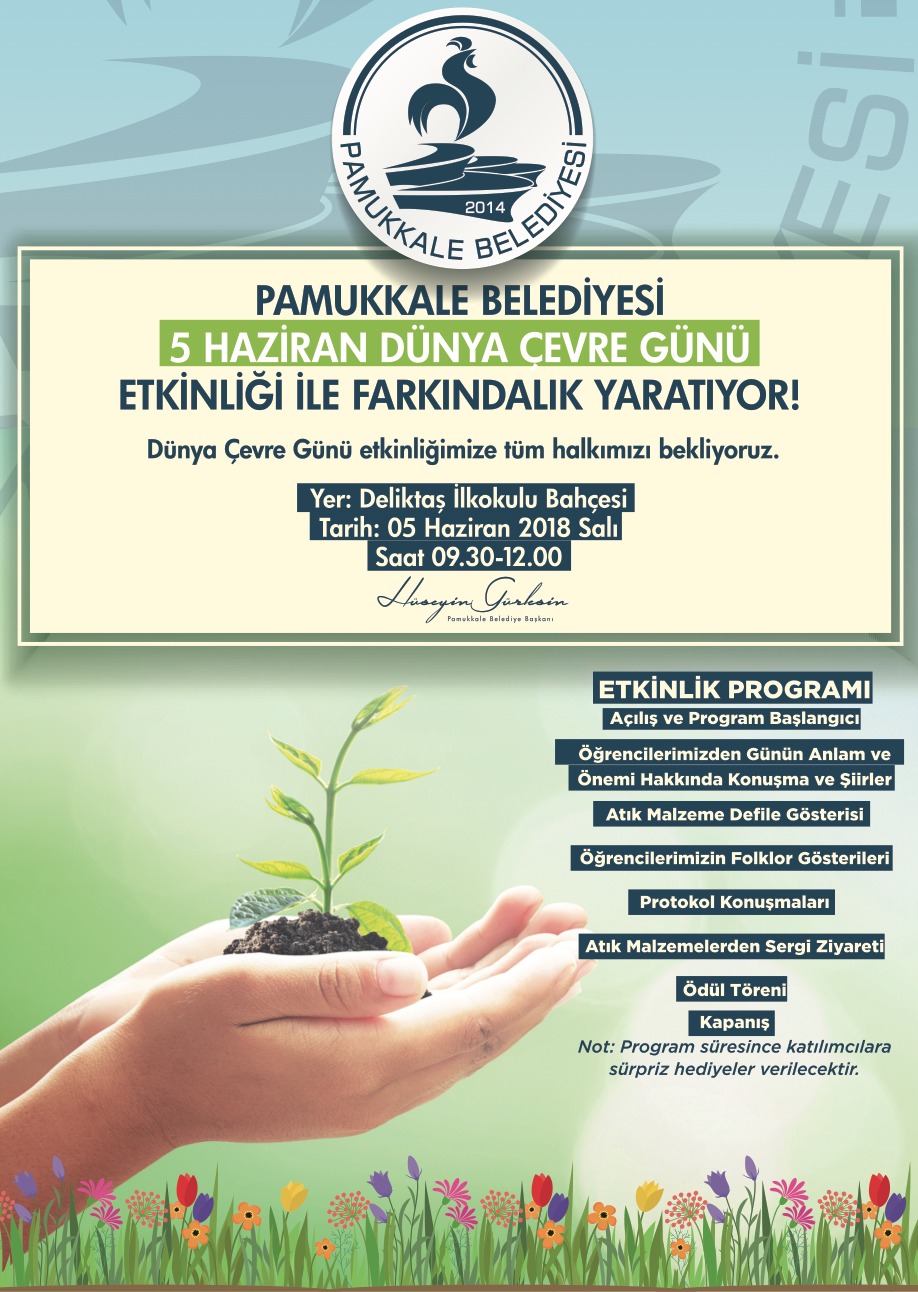 Pamukkale Belediye Başkanı Hüseyin Gürlesin, 5 Haziran 2018 Salı günü Deliktaş İlkokulu Bahçesi’nde gerçekleşecek olan programda çevre konusunda farkındalık yaratacaklarını ifade etti. Saat 09.30’da öğrencilerin günün anlam ve önemine dair konuşmaları ile başlayacak olan programda, öğrenciler tarafından folklor gösterisi de olacak. Atık malzemelerden oluşturulan giysilerin defilesinin de yapılacağı etkinlikte, atık malzemeler ve çevre konulu resimlerin sergisi de yer alacak. Başkan Gürlesin, Deliktaş İlkokulu bahçesinde gerçekleşecek 5 Haziran Dünya Çevre Günü etkinlik programında sürprizlerinde olduğunu ifade ederek, tüm çevre gönüllülerini etkinliğe davet etti.