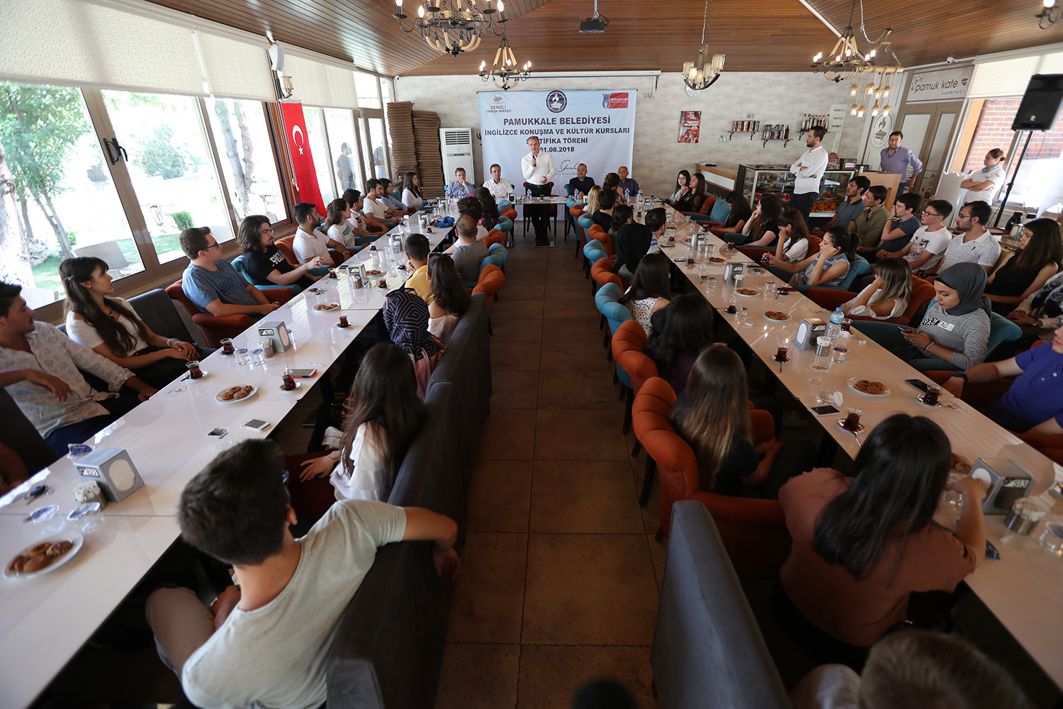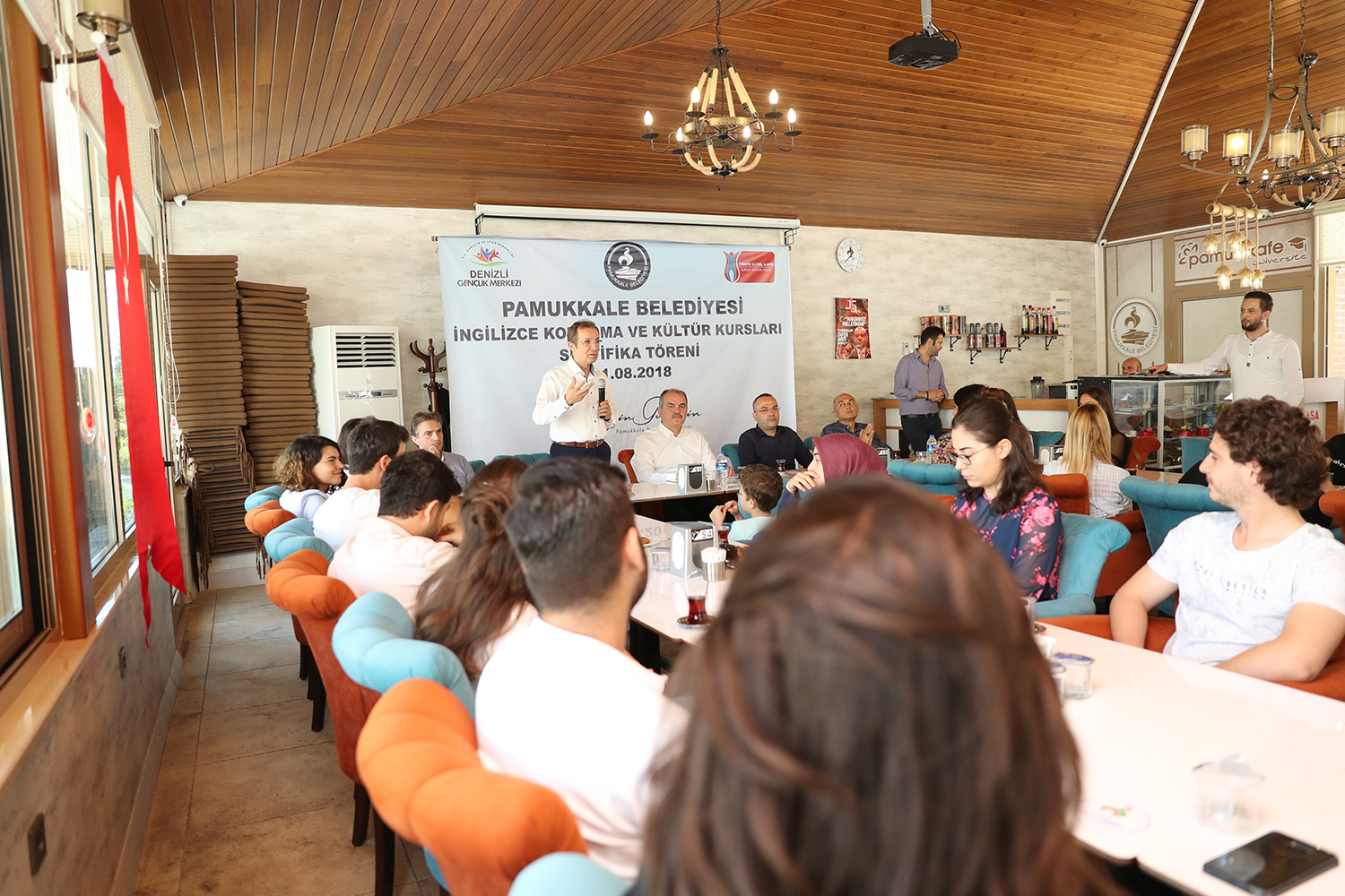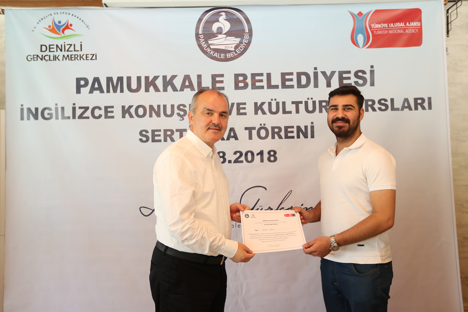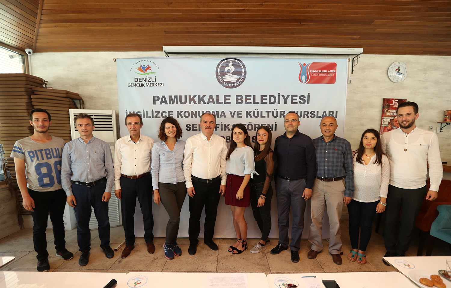 Kurulduğu günden bu yana hayata geçirdiği projelerle dikkat çeken ve özellikle eğitim alanında gençlere yönelik gerçekleştirilen çalışmalarla öncülük eden Pamukkale Belediyesi’nin ücretsiz İngilizce kursları aralıksız devam ediyor. Pamukkale Belediyesi-Gençlik Hizmetleri Spor İl Müdürlüğü işbirliği ile yürütülen ve Avrupa Birliği Projesi kapsamında düzenlenen “Ücretsiz İngilizce Konuşma ve Kültür Kursları”nı tamamlayan kursiyerlere sertifikaları törenle verildi. Pamuk Kafe Üniversite’de gerçekleşen sertifika törenine Pamukkale Belediyesi Başkanı Hüseyin Gürlesin, Belediye Başkan Yardımcısı Türkay Gözlükaya, Gençlik Hizmetleri Spor İl Müdürü Ahmet İbanoğlu, Gençlik Merkezi Müdürü Hasan Sarı ile yurtdışından gelen gönüllü eğitmenler ile kursiyerler katıldı.