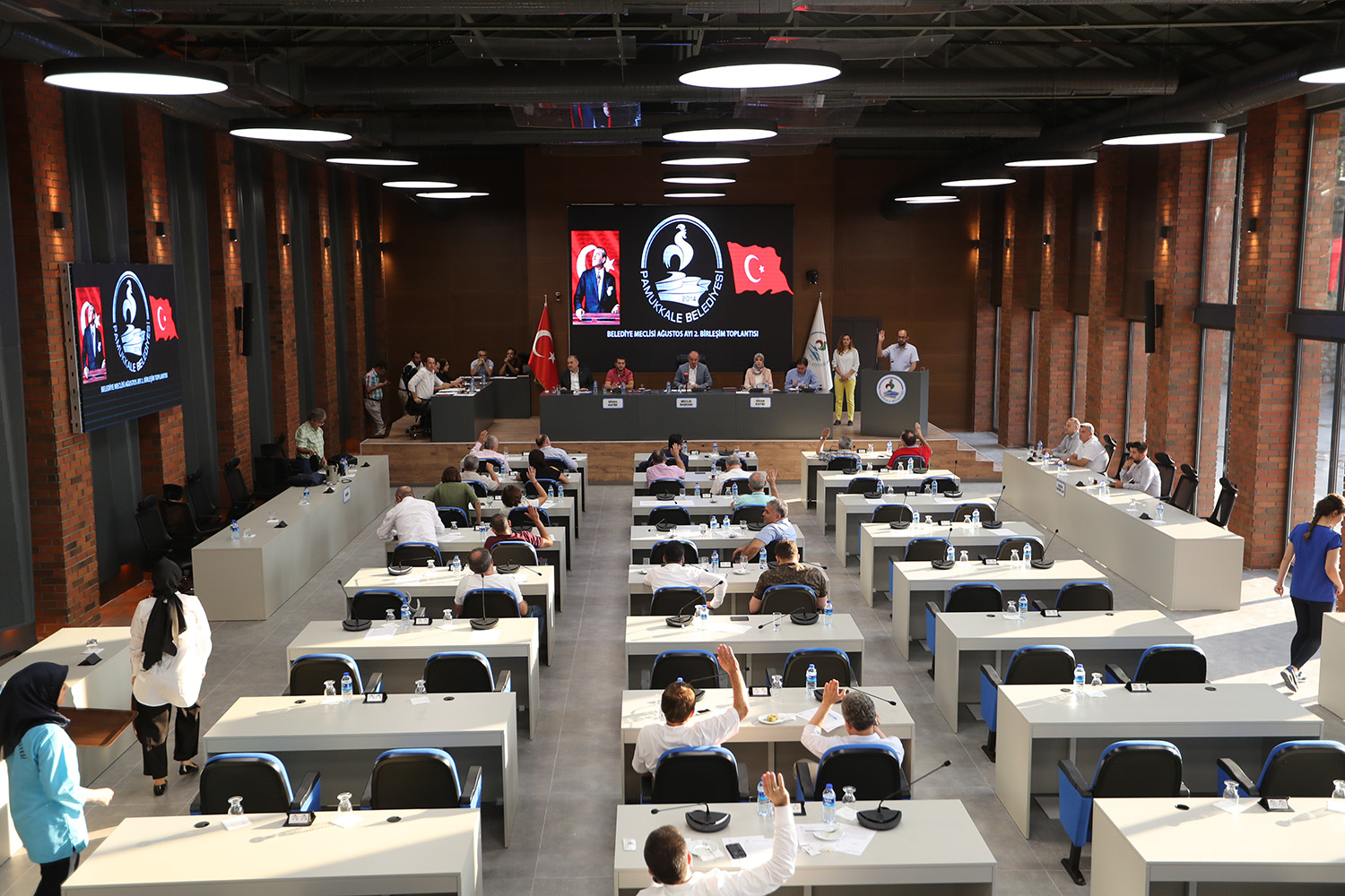 Pamukkale Belediyesi, büyükşehir kanunuyla 2014 yılında kurulmasının ardından geçen 52 aylık süre sonunda, yepyeni modern, doğa dostu olduğunu gösteren, birçok güzel ve özel özelliği ile dikkat çeken Pamukkale Belediyesi Meclis Salonu’na kavuştu. Belediye kurulmadan önceki dönemde, Özel İdare’nin YSE binası olarak bakım atölyesi olarak kullanılan alan, Pamukkale Belediyesi kurulduktan sonra Fen İşleri Müdürlüğü’nün deposu olarak hizmet verdi. Pamukkale Belediyesi’nin ana hizmet veren bina alanında bulunan yapının inşasına Mayıs ayının ortalarında başlanmıştı. Yeni meclis salonu bin m2’lik kapalı alanda, toplam 2 milyon 400 bin TL’lik maliyetle, 72 günlük gibi kısa bir sürede yapımı tamamlandı. Salonda, meclis üyeleri için 60 kişilik, başkan yardımcıları, birim müdürleri, basın için 30 kişilik oturma alanları mevcut. İçerisinde, meclis salonu, sergi ve fuaye alanı, parti grup toplantıları için odalar, mutfak, bay-bayan-engelli tuvaletleri bulunuyor. Toplantıları vatandaşların anlaşılır bir şekilde takip edebilmeleri için 12 m2’lik led ekranla birlikte, yan duvarlarda 4 m2’lik 2 adet led ekran bulunuyor. 2 adet harekete duyarlı kamera ile birlikte delege masalarına kartlı oylama butonları, söz isteme butonları ve mikrofonlu delege sistemleri montajı yapıldı. Meclis Salonunda akustik duvar panelleri kullanılarak daha net, doğal bir ses ortamı yakalanması sağlandı. Sistemin sürdürülebilir olması için özellikle ses, delege sistemi ve yüzde 100 temiz hava dönüşümlü havalandırma ve klima sistemi bulunuyor. Bunlarla birlikte, tavanlarda göçmen kuşların doğal yuvalarına dokunulmadı.
