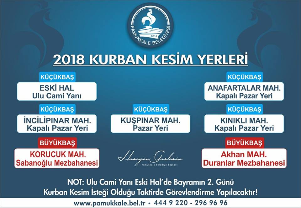 Pamukkale İlçesi’ndeki kurban kesim yerleri dışında kurban kesiminin yapılmasının yasak olduğunu hatırlatan Pamukkale Belediye Başkanı Hüseyin Gürlesin, belirlenen yerlerde sıkıntı yaşanmaması için gerekli tüm tedbirleri aldıklarını söyledi. Hayvan sağlığı ve halk sağlığı ile ilgili alınması gereken tüm tedbirlerin alındığı ifade eden Başkan Gürlesin, “İlçemiz sınırları içerisindeki Kurban kesim yerleri şöyledir: Küçükbaş hayvanlar için kurban kesim yerleri, Kuşpınar Mahallesi Pazar yeri, İncilipınar Mahallesi Pazar yeri, Kınıklı Mahallesi Pazar yeri, Anafartalar Mahallesi Pazar yeri ve Ulu Cami yanındaki eski halin oldu yer. Eğer Bayramın ikinci gününde Ulu Cami yanındaki eski halin olduğu yerde kurban kesim isteği olduğu takdirde görevlendirme yapılacak. Büyükbaş hayvanlar için ise Korucuk’taki Sabanoğlu Mezbahanesi ve Akhan’da Çayır Mevkii Duranlar Mezbahanesi” dedi.