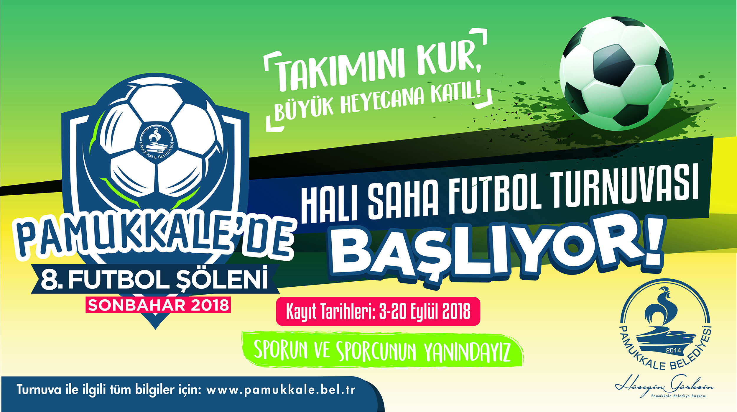 Pamukkale Belediyesi tarafından geleneksel hale getirilen halı saha futbol turnuvasının sekizincisi için hazırlıklar tamamlandı ve kayıtlar alınmaya başladı. “Pamukkale’de 8. Futbol Şöleni Sonbahar 2018 Halı Saha Futbol Turnuvası” kayıtları 3-20 Eylül tarihleri arasında yapılacak. Pamukkale Belediye Başkanı Hüseyin Gürlesin, mahalleler arasında kaynaşmayı amaçlayan futbol şölenine katılmak isteyenleri beklediklerini ifade ederek, “Gençlerin spor yapmasına imkan sağlamak için bu turnuvayı düzenliyoruz. Yılın ikinci turnuvasına katılmak isteyen gençleri takımlarını kurup bu büyük heyecana bekliyoruz” dedi.