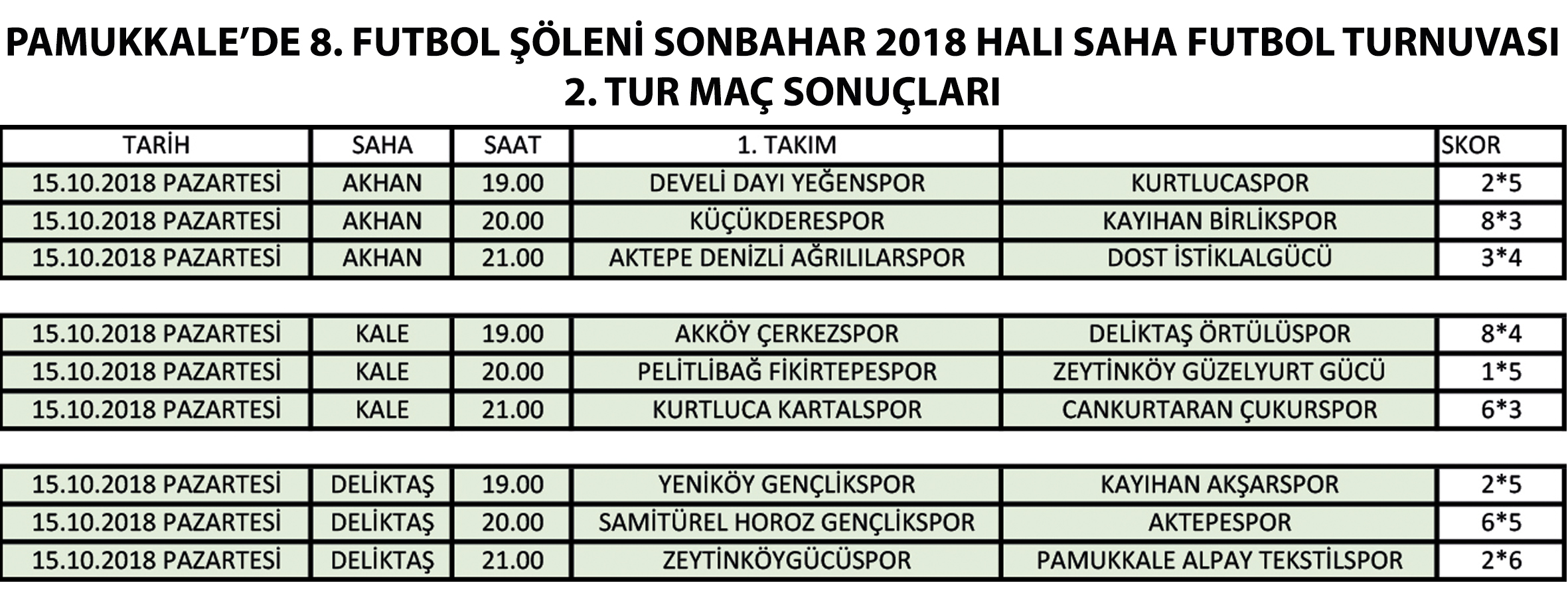 Akhan sahasında oynanan maçların ilkinde Kurlucaspor, Develi Dayı Yeğenspor takımını 5-2 yenerken, Küçükderespor Kayıhan Birlikspor’u 8-3 ve Dost İstiklalgücü ise Aktepe Denizli Ağrılılarspor’u 4-3 yenerek üçüncü tura çıkan takımlar oldu. Kale sahasında ise Akköy Çerkezspor takımı Deliktaş Örtülügücü’nü 8-4, Zeytinköy Güzelyurtspor Pelitlibağ Fikirtepespor’u 5-1 ve Krutluca Kartalspor da Cankurtaran Çukurspor’u 6-3 yenmeyi bildi. Deliktaş sahasında ise Kayıhan Akşarspor Yeniköy Gençlikspor’u 5-2, Sami Türel Horoz Gençlikspor Aktepespor’u 6-5 ve Pamukkale Alpay Tekstilspor ise Zeytinköygücü’nü 6-2 yenerek 3. Tura çıkan takımlar oldu. Toplam 9 maçta takımlar 78 gole imza attı.