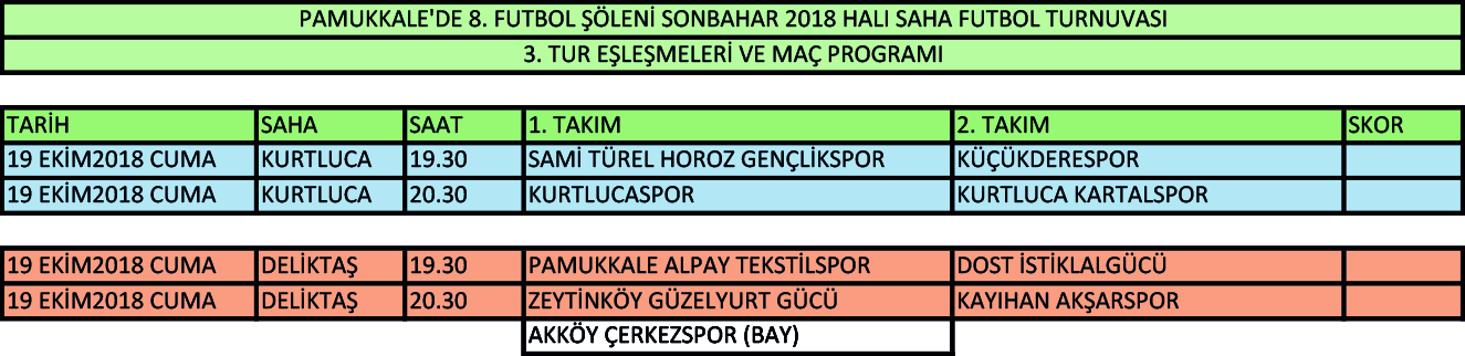 “Pamukkale’de 8. Futbol Şöleni Sonbahar 2018 Halı Saha Futbol Turnuvası”nda heyecan Cuma akşamı oynanacak olan 3. tur maçları ile devam edecek. Kurtluca sahasında saat 19.30’da Sami Türel Horoz Gençlikspor-Küçükderespor maçı oynanırken, 20.30’da da Kurtlucaspor ile Kurtluca Kartalspor karşılaşacak. Aynı gün Deliktaş sahasında 19.30’da Pamukkale Alpay Tekstilspor – Dost İstiklalgücü maçı yapılırken, 20.30’da da Zeytinköy Güzelyurtgücü – Kayıhan Akşarspor maçları yapılacak. Eleme usulü oynanacak olan 25’er dakikalık 2 devre halinde yapılıyor. Maçı kazanan takımlar yarıfinale çıkacak. Beraberlik halinde ise galip takımı penaltılar belirleyecek. Akköy Çerkezspor takımı fikstür gereği yarıfinal biletini almış oldu.