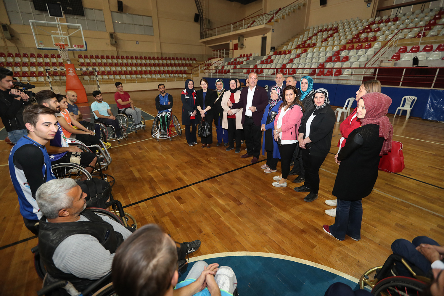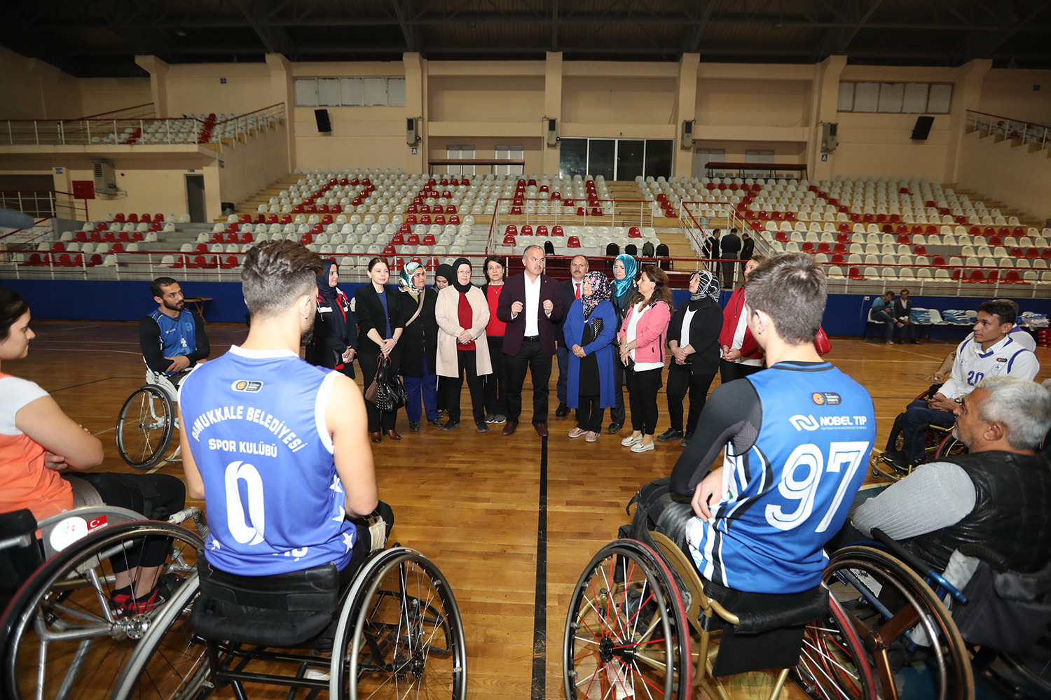 Pamukkale Belediyespor Tekerlekli Sandalye Basketbol Takımı antrenmanını Pamukkale Belediye Başkanı Hüseyin Gürlesin ile birlikte Pamukkale Ak Parti İlçe Kadın Kolları Başkanı Zehra Karabay ve ekibi de geldi. “En büyük engel sevgisizliktir” pankartı açan Ak Partili kadınlar, takıma moral verdi. Belediye Başkanı Hüseyin Gürlesin, “Sezon öncesi, takımımıza moral vermek için Pamukkale Ak Parti İlçe Kadın Kolları Başkanımız Zehra Karabay ve ekibi de geldi. Sayın Cumhurbaşkanımızın da engelli vatandaşlarımıza yönelik özel bir hassasiyeti var. Bizler de onun temsilcileri olarak, engelli vatandaşlarımızın her zaman yanındayız. Bizim derdimiz gönüllere dokunmak. Bugün de Zehra Hanım ve ekibi, takımımıza moral vermek, enerji vermek istediler. Ben kendilerine çok teşekkür ediyorum” dedi.