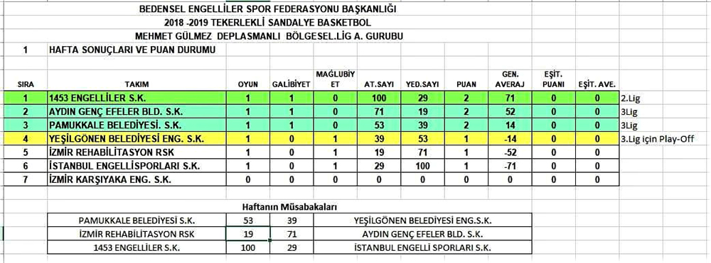 Tekerlekli Sandalye Basketbol Mehmet Gülmez Deplasmanlı Bölgesel A Ligi’nde ilk hafta maçları tamamlandı. Pamukkale Belediyespor- Yeşilgönen Belediyespor Engelliler Spor Kulübü maçı dışında 2 maç daha vardı. Aydın genç Efeler takımı deplasmanda İzmir RSK’yı 71-19 yenerken, İstanbul 1453 takımı konuk ettiği İstanbul Engelliler takımını 100-29 mağlup etmeyi bildi. İzmir Karşıyaka ise bu haftayı bay takım olarak geçirdi. İlk haftayı 2’şer puanla geçen İstanbul 1453, Aydın Genç Efeler ve Pamukkale Belediyesi takımları averajla ilk 3 sırayı alırken, ilk haftayı mağlup tamamlayan Yeşilgönen Belediyespor, İzmir RSK ve İstanbul Engelliler takımları 4, 5 ve 6. sıralarda yer aldı. Grubun son sırasında ise ilk haftayı bay takım olarak geçen İzmir Karşıyaka takımı yer aldı. Lig sonunda ilk sırayı alan takım 2. Lig’e yükselirken, 2 ve 3. Sıradaki takımlar 3. Lig’e çıkacak. Ligi dördünü bitiren takımlar ise diğer gruplardaki takımlarla 3. Lig’e çıkmak için Play-off oynayacak.