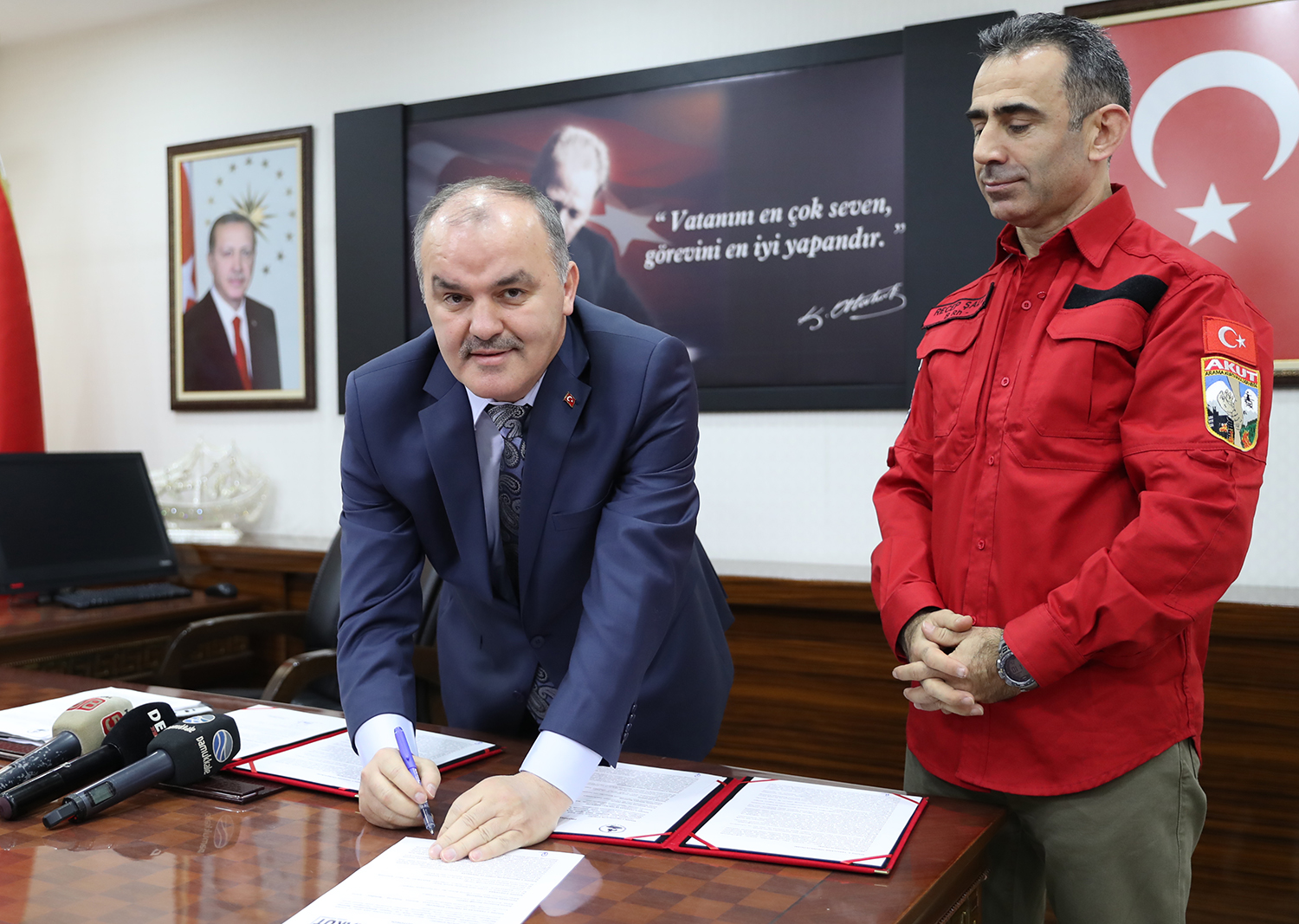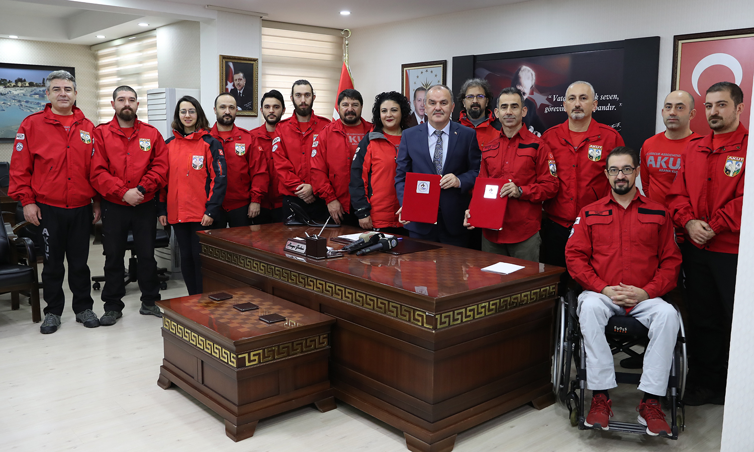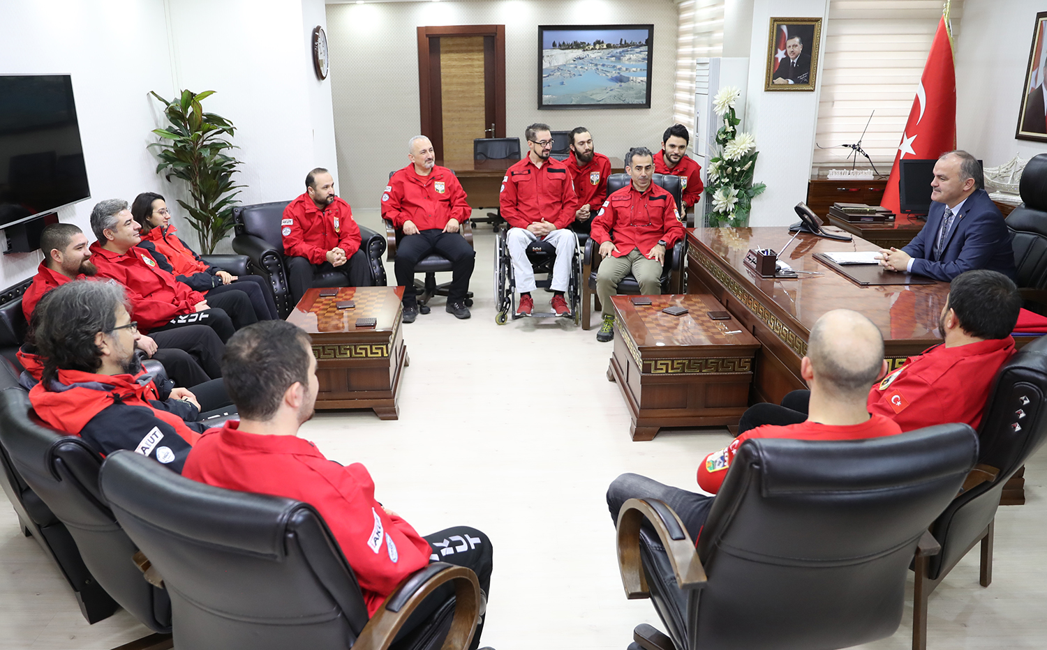Pamukkale Belediye Başkanlığı makamında Başkan Gürlesin’i ziyaret eden AKUT Denizli ekibi üyeleri yapılan çalışmalar hakkında bilgiler verdi. Daha sonra protokol imza altına alındı. AKUT Yönetim Kurulu Başkanı Recep Şalcı, acil afet durumlarında lojistik ve eğitimin şart olduğunu belirterek, Pamukkale Belediye Başkanı Hüseyin Gürlesin’e böyle önemli bir yer için teşekkür etti. Şalcı, “Pamukkale Belediyesi ve Hüseyin Gürlesin beye teşekkür ediyoruz. Uzun süredir önemli bir eksiğimizdi. Bu protokolle Hüseyin beyin vizyonu sayesinde önemli bir eksiğimiz kapattık. Şu an artık bizimde bir yerleşkemiz var. Bu yerleşke bizim için çok önemli. Çünkü arama kurtarma acil durumlarda afetleri yönetebilmek için lojistik ve eğitim şart. Bu yüzden de bu açığımızı kapattık. Bundan sonra bu alanda Denizli ve çevresine çok daha iyi ve kaliteli hizmet vereceğiz. Umuyoruz ki bize ihtiyaç olmayacak. Ama ihtiyaç olduğu zamanda ekibimizin her an hazır olması lazım. Bu protokolle de bu yere sahip olduk. Ve bundan sonra da çok daha hazır bir şekilde yolumuza devam edeceğiz. Vatandaşlarımızdan da, mutlaka parkımızı ziyaret etmeleri” dedi.