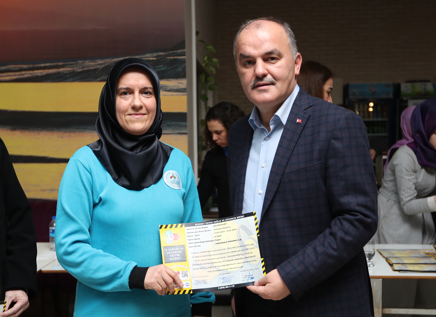 Kurulduğu 2014 yılından bu yana her konuda titiz çalışmalara imza atan Pamukkale Belediyesi, çalışanların iş sağlığı ve güvenliği ile ilgili de önemli çalışmalar yaptı. Pamukkale Belediyesi çatısı altında hizmet veren Pamukkale Personel A.Ş. çalışanlarına Bereket Ortak Sağlık ve Güvenlik Birimi tarafından “İş Sağlığı ve Güvenliği” konulu eğitim verildi. Aralık ayı içinde yapılan eğitimlerde yaklaşık 500 kişiye başta çalışma mevzuatları, çalışanların yasal hak ve sorumlulukları, iş kazası ve meslek hastalığından doğan hukuki sonuçları hakkında bilgiler verildi. Sağlık konuları başlığında meslek hastalıkları sebepleri, hastalıktan korunma yöntemleri, biyolojik ve psikososyal risk etmenleri, ilk yardım, tütün ürünlerinin zararları ile teknik konular eğitimde çalışanlara detaylı olarak anlatıldı. 8 saat süren eğitim sonunda sertifika almaya halk kazanan işçilere Pamuk Kafe’de düzenlenen törenle sertifikaları verildi. Pamukkale Belediye Başkanı Hüseyin Gürlesin’in de katıldığı törende başkan yardımcıları Adnan Kaya, Türkay Gözlükaya, Abdullah Sevinçli ile Pamukkale Belediye Meclisi Ak Parti Grup Başkanvekili Alparslan Albay, birim müdürleri ile çalışanlar yer aldı.