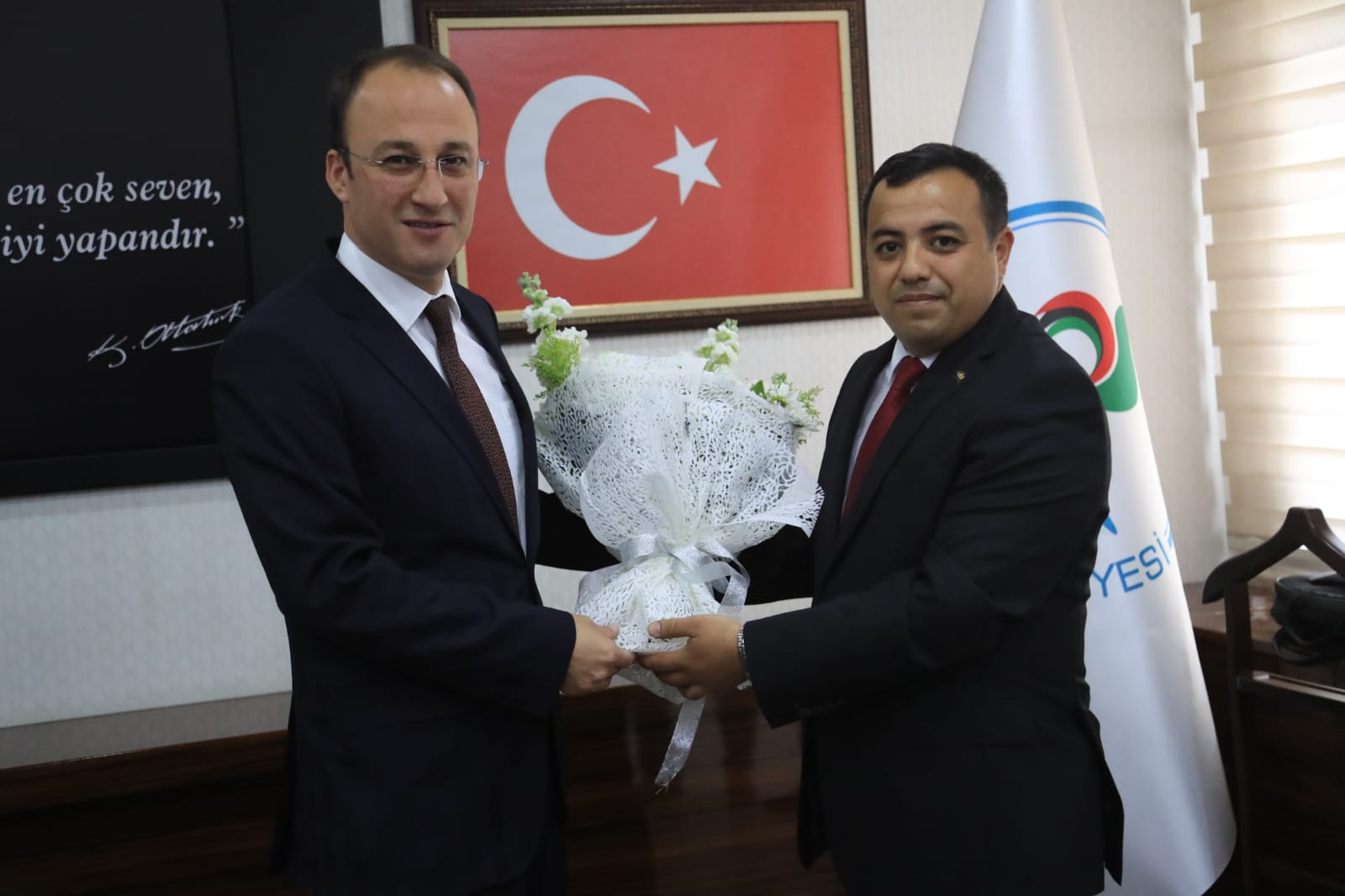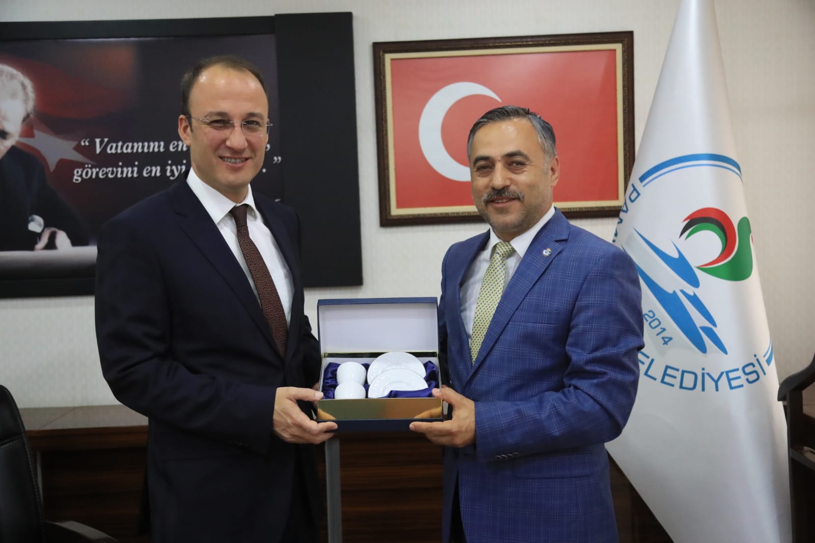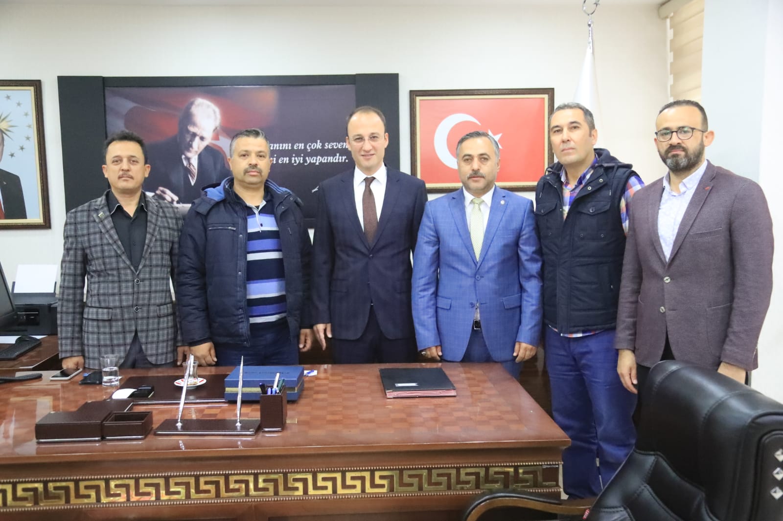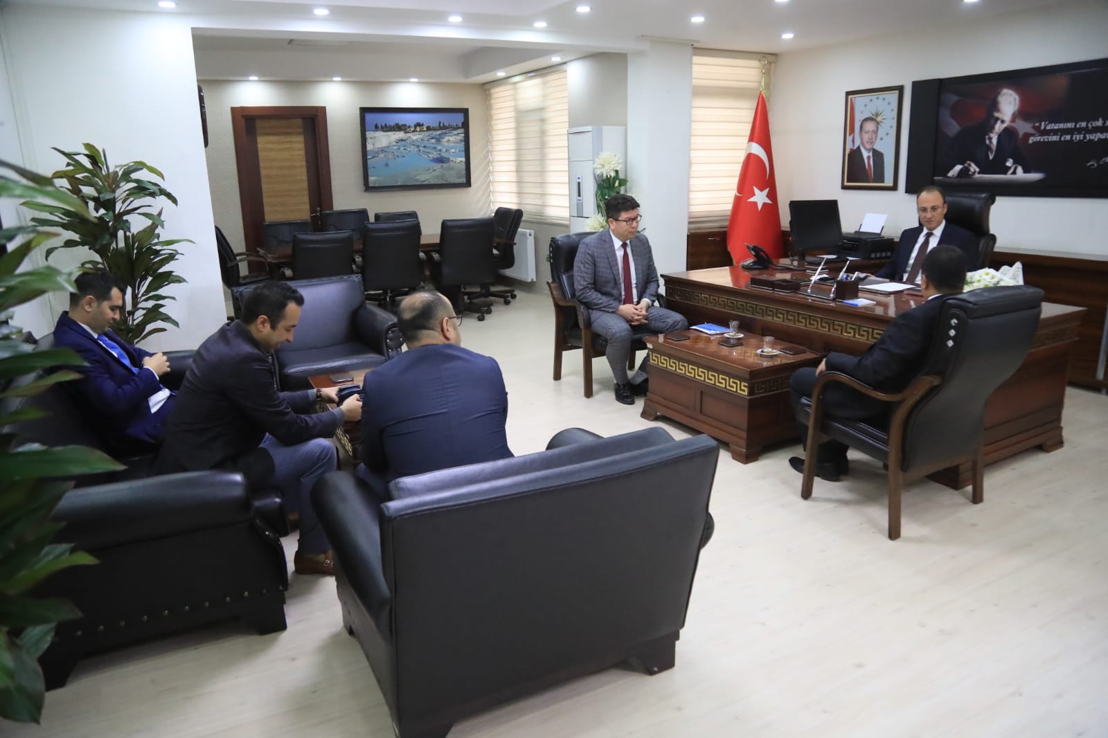 Başkanlık mazbatasını almasının ardından hızlı bir şekilde göreve başlayan Pamukkale Belediye Başkanı Avni Örki, bir yandan da makamında tebrik ve hayırlı olsun ziyaretlerini kabul ediyor. Başkan Avni Örki başkanlık makamında HAK-İŞ Konfederasyonu Denizli İl Başkanı Sezai Söylemez ve Yönetim Kurulu Üyeleri, BEM-BİR-SEN Denizli İl Başkanı Osman Kurt ve Yönetim Kurulu Üyesi misafirlerini ağırladı. Halkın yüksek çoğunuyla başkan seçilen Pamukkale Belediye Başkanı Örki’yi tebrik eden misafirler, Pamukkale’de 5 yıl boyunca yapacak oldukları hizmetlerde Başkan Örki’ye başarılar diledi. Başkan Örki nazik ziyaretlerinden dolayı katılımcılara teşekkür etti. Başkanlık makamında gerçekleşen görüşme toplu fotoğraf ile son buldu.