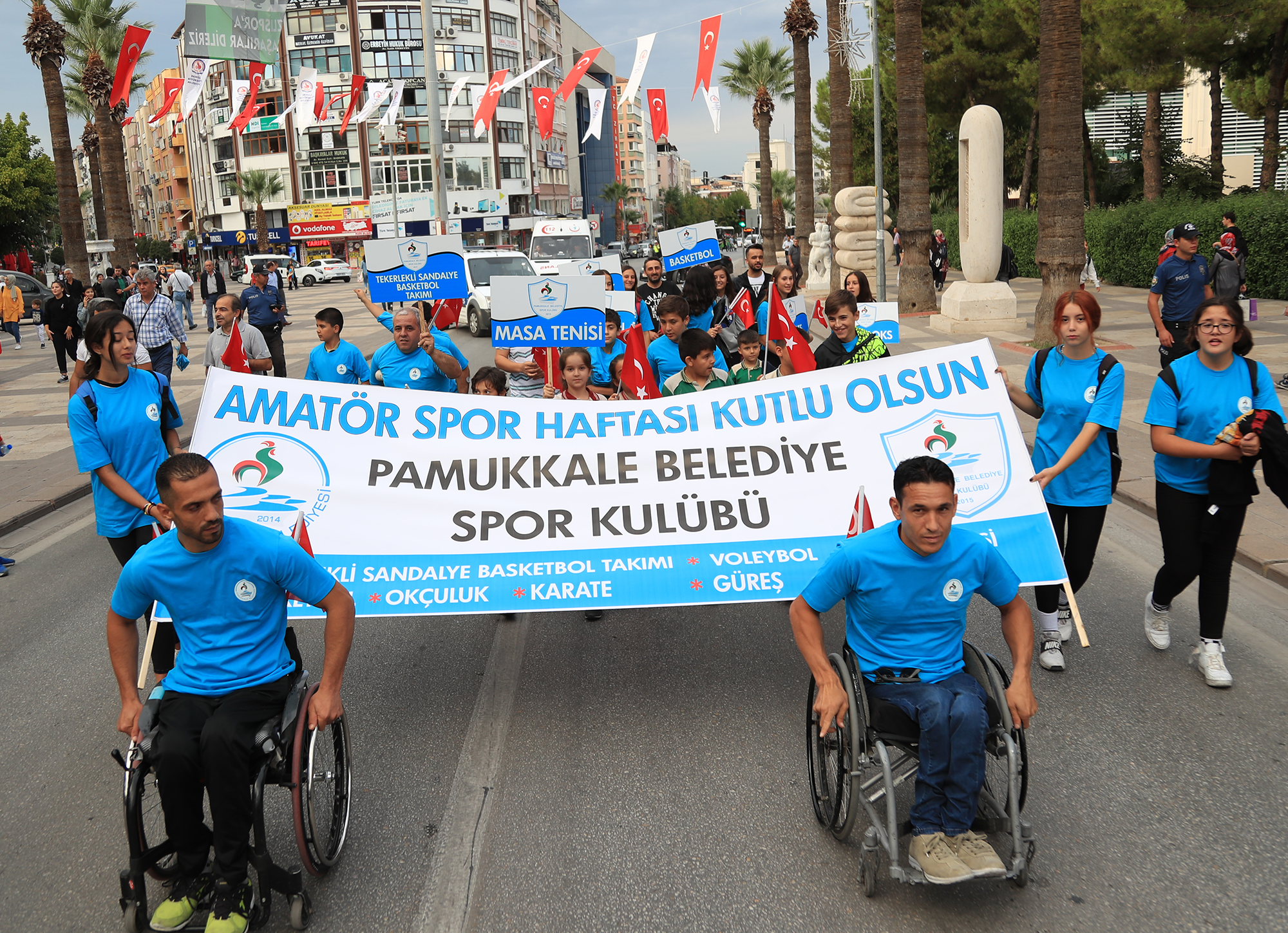Pamukkale Belediyesi, ilçenin adını her platformda duyurmaya devam ediyor. Belediye çatısı alında kurulan Pamukkale Belediye Spor Kulübü, 2019-2020 sezonu öncesi aktif olunan branş sayısını artırdı. 2015 yılında kurulan kulüp, tekerlekli sandalye basketbol, masa tenisi ve okçuluk branşında aktifken, yeni sezonda 5 yeni branşta daha faaliyetlere katılacak. 2019-2020 sezonunda Pamukkale Belediyespor, basketbol, voleybol, karate, kick boks ve güreş branşlarında müsabakalara katılacak. Pamukkale Belediyespor Kulübü, tekerlekli sandalye basketbol takımı bu sezon 3 . Lig’de yer alırken, voleybolda da bölgesel ligde boy gösterecek. Basketbol, karate, masa tenisi, okçuluk, güreş ve kick boksta ise il bazındaki müsabakalarda Pamukkale Belediyesporlu oyuncular mücadele edecek. Karate branşında Pamukkale Belediyesporlu sporcu Batuhan Özdemir, 36 ülkeden 1600 sporcunun katıldığı Uluslararası Turkish Open Karate Turnuvası’nda büyük erkekler kata dalında şampiyon olmayı başardı. Masa Tenisi’nde ise Yıldız Erkekler İl Birinciliği’nde Abdullah Kanat ve Furkan Reyhan’dan oluşan Pamukkale Belediyespor Masa Tenisi Takımı, 20 takım arasında Denizli birincisi olmayı başardı. Başarılı sporcular 18-19 Ekim’de Balıkesir yapılacak bölge şampiyonasında Denizli’yi temsil edecekler. Küçük kızlarda ise Elif Kanat ve Belinay Akdoğan, üçüncü olmayı başardı. Masa Tenisi’ndeki sporcular kazandıkları kupaları Kulüp Başkanı Birol Konak ve Antrenör Yaşar Dere ile birlikte Pamukkale Belediye Başkanı Avni Örki’ye getirdiler. Öte yandan bu sezon Bölgesel Bayanlar Voleybol Ligi’nde mücadele edecek olan takım çalışmalara başladı. Antrenör Mehmet Ali Ayhan gözetiminde Atatürk Ortaokulu Spor Salonu’ndaki çalışmaya mavi-beyazlı kulübün yönetimi de ziyaret ederek, takıma başarılar diledi. Ayrıca Pamukkale Belediye Spor Kulübü sporcuları her yıl 7-13 Ekim tarihleri arasında kutlanan Amatör Spor Haftası’nda gerçekleşen açılış törenine katıldı. Düzenlenen korteje katılan mavi-beyazlı kulübün sporcuları dikkatleri üzerlerine çekti. Pamukkale Belediyespor Kulübü Başkanı Birol Konak, mavi-beyazlı kulüpte yapılan son kongrede yeni yönetimin oluştuğunu ifade ederek, “Yeni sezon öncesi aktif olan branş sayımızı 3’den 8’e çıkardık. Bu branşlarda önemli çalışmalar yapmak istiyoruz. Bir taraftan hem takım hem de bireysel branşlarda mücadele ederken bir taraftan da branşların alt yapısına sporcu kazandırmak için ücretsiz kurslar açacağız. Bu sayede hem takımlarımıza sporcu yetiştirirken hem de gençlerin spora yönlendirmesini sağlamış olacağız. Kulüp olarak amacımız gençlerin kötü alışkanlıklardan spor sayesinde uzak kalması” dedi.