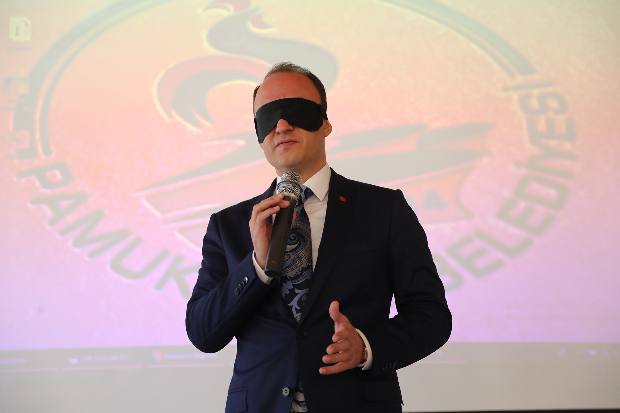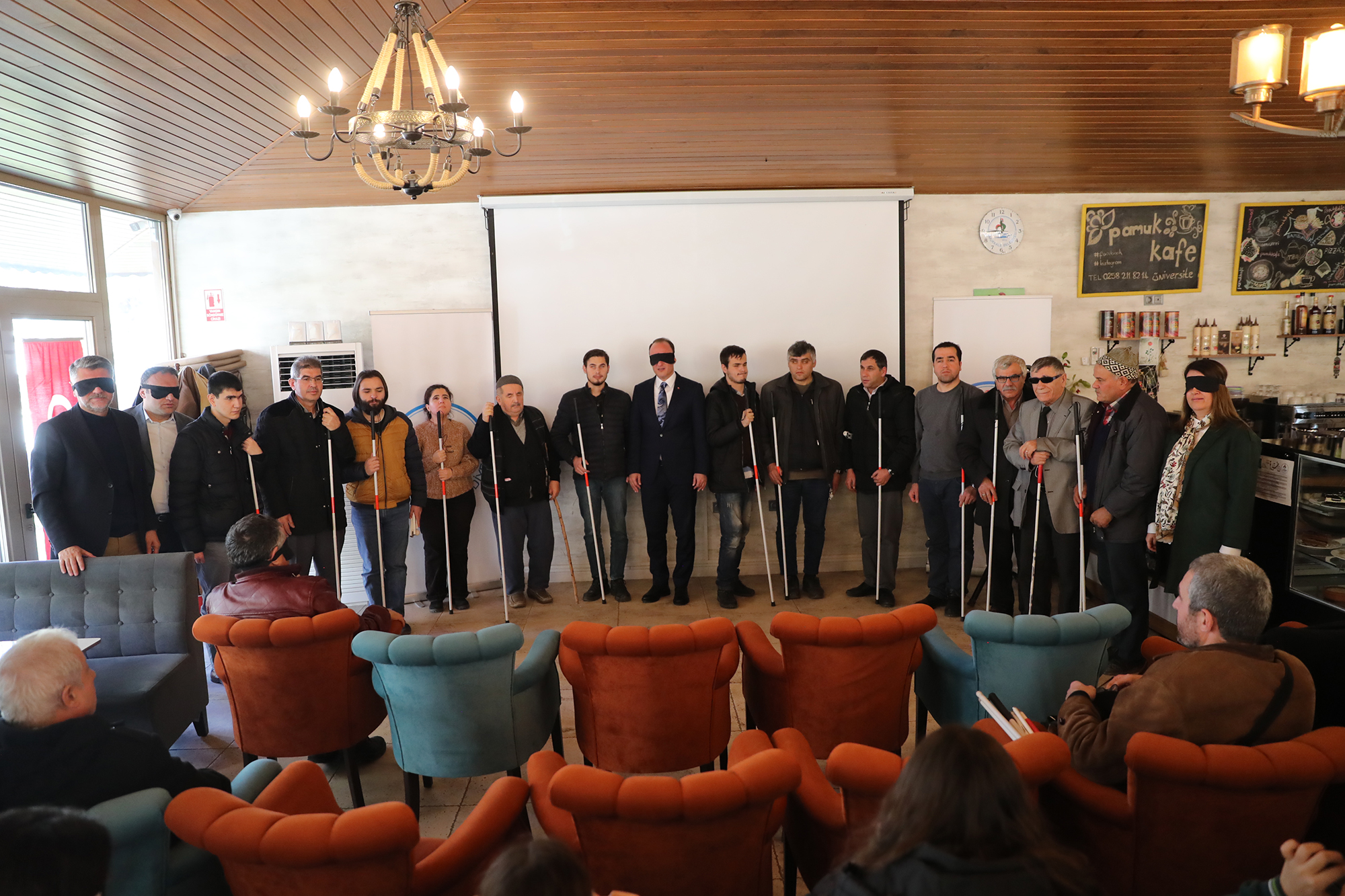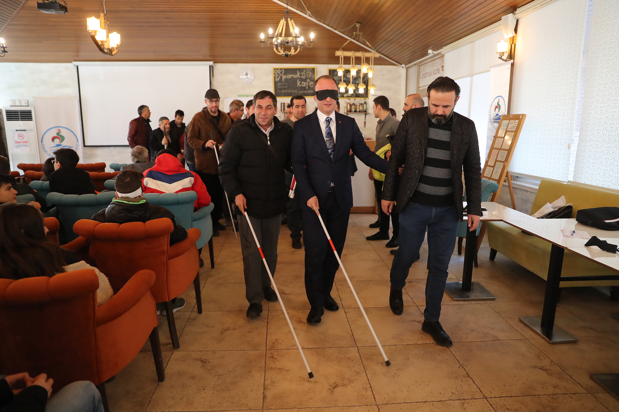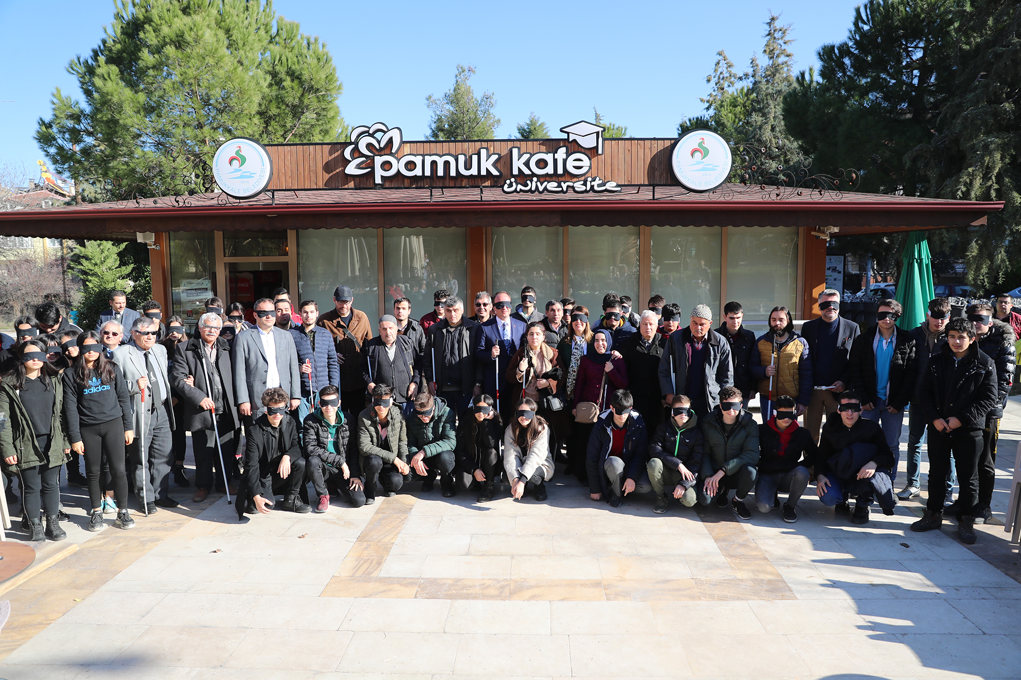 Törene katılan öğrencilerin gözlerine bant takılarak görmeyenlerin yaşadığı sıkıntıları hissetmeleri sağlandı. Pamukkale Belediye Başkanı Avni Örki de törene gözünde bantla katıldı. Konuşmasını da bu şekilde yapan Başkan Örki, “Burada yer alan görme engelli arkadaşlarımızın neler yaşadığını hissetmek için gözümü bantla kapatmak istedim. Aynı şekilde öğrenci arkadaşlarımın da gözünde bant var. Buradaki amacımız farkındalık oluşturmak. Sizleri anlamaya çalışmak ve belediyecilik hizmetini sizin hayatınızı kolaylaştıracak şekilde vermek istiyoruz. Belediyemizi ait binalarda görme engelli vatandaşlarımızın hayatını kolaylaştıracak uygulamalarımız mevcut. Şuan gözlerimiz kapalı konuşma yapmak belki çok bir şey ifade etmeyecek. Ama emin olunki bu birkaç dakikalık hissiyatımı ifade etmem gerekirse görmemek gerçekten çok zor. Bu şekilde yaşamak için gönül gözünün de açık olması gerekir. 1920’li yıllarda bu farkındalık çalışması başlatılmış. Beyaz baston adıyla yürünmüş, bugün gelinen noktada bir çok güzel adımlar da atılmış olduğunu görüyoruz. Ama bu yeter mi, yetmez. Hala atılması gereken adımların, yapılması gereken işlerin olduğunu biliyorum. Üstümüzdeki bu sorumluluğun bilincindeyiz. Belediyecilik hizmetini sunarken sizin hayatınızı kolaylaştıracak ne türlü adım var ise onları atmak için çalışacağız. Pamukkale Belediyesi olarak biz her vatandaşımızın olduğu gibi görme engelli olan vatandaşlarımızın da yanında olmaya devam edeceğiz” dedi. Konuşmanın ardından görme engellilere özel olarak hazırlanan filmi katılımcılar yine gözlerinde bantla takip ederek engellilerin yaşamlarındaki zorluklarını hissetmiş oldular. Pamukkale Belediyesi ihtayacı olan 15 görme engelli vatandaşa beyaz baston hediye etti. Pamukkale Belediye Başkanı Avni Örki, gözündeki bantla yürüyüş yapmayı da ihmal etmedi. Farkındalık programına katılanlar yine gözleri bantlı halde toplu fotoğraf çektirdiler.