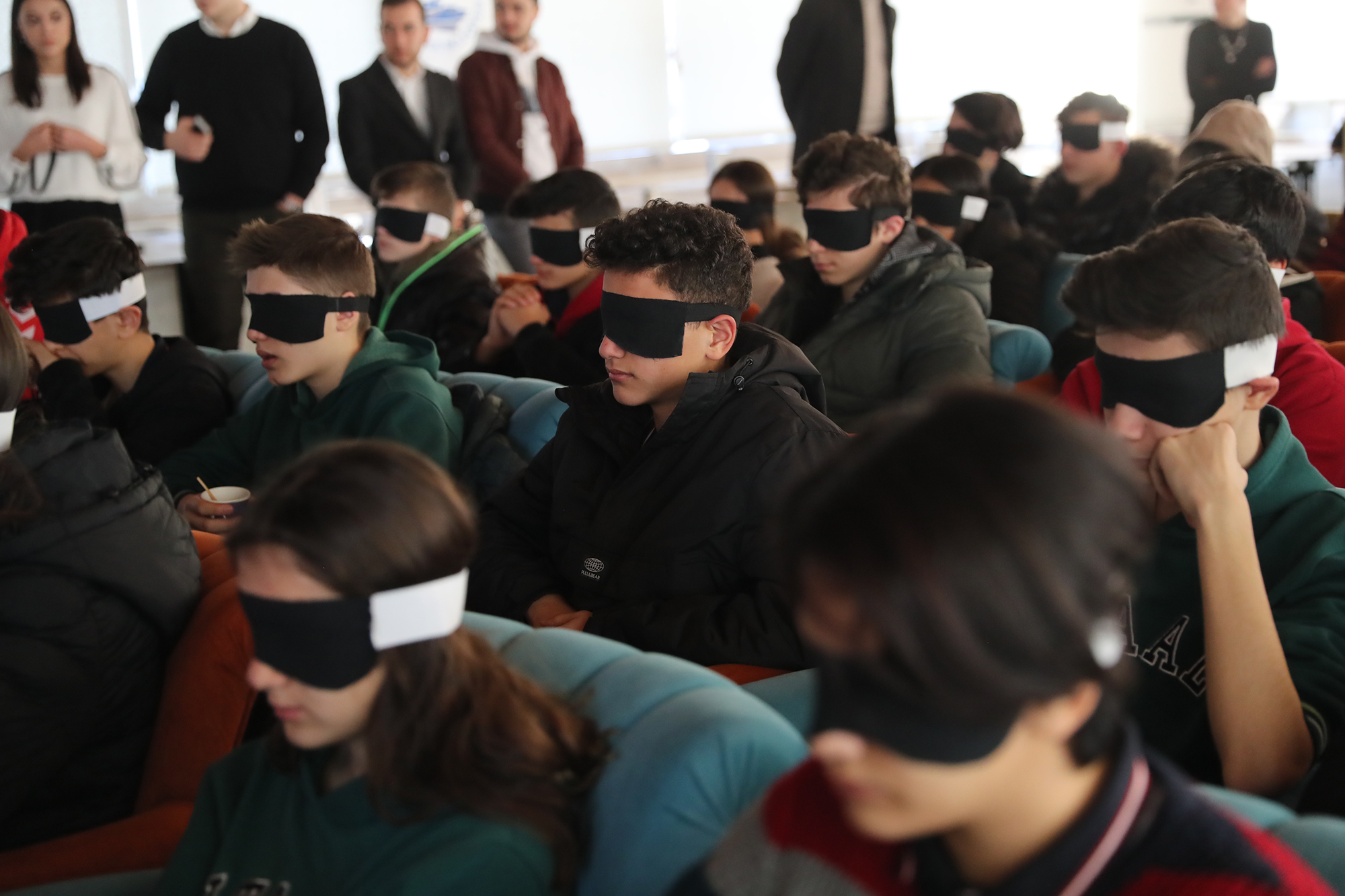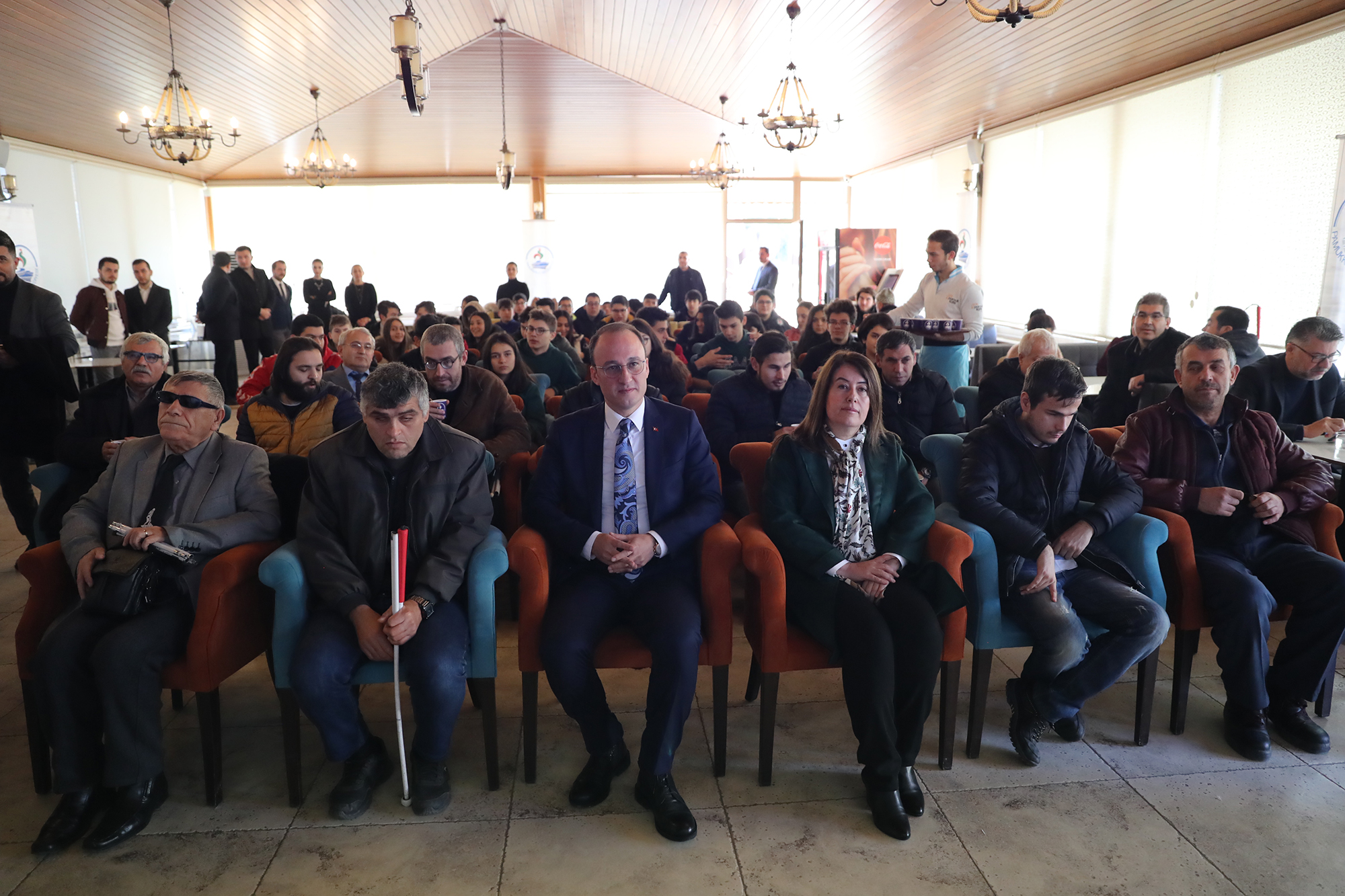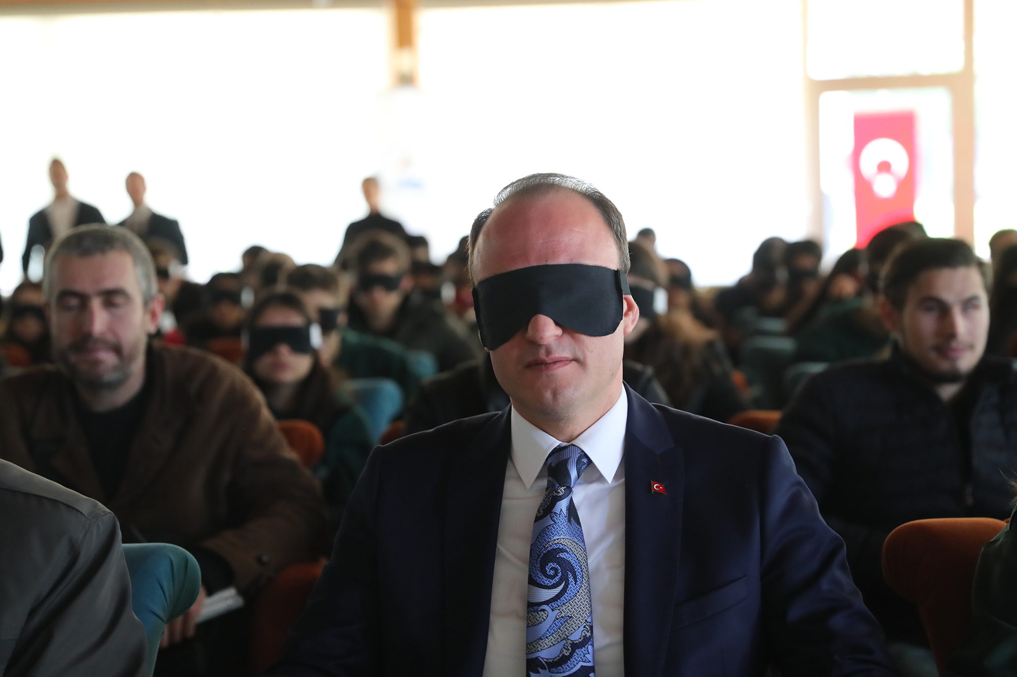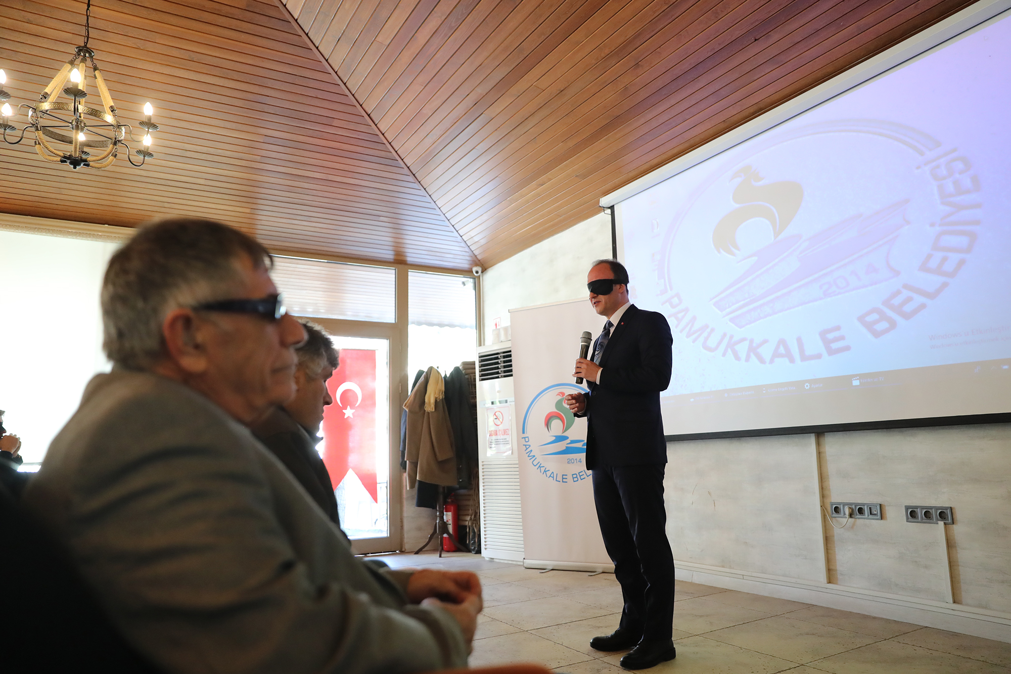 Törene katılan öğrencilerin gözlerine bant takılarak görmeyenlerin yaşadığı sıkıntıları hissetmeleri sağlandı. Pamukkale Belediye Başkanı Avni Örki de törene gözünde bantla katıldı. Konuşmasını da bu şekilde yapan Başkan Örki, “Burada yer alan görme engelli arkadaşlarımızın neler yaşadığını hissetmek için gözümü bantla kapatmak istedim. Aynı şekilde öğrenci arkadaşlarımın da gözünde bant var. Buradaki amacımız farkındalık oluşturmak. Sizleri anlamaya çalışmak ve belediyecilik hizmetini sizin hayatınızı kolaylaştıracak şekilde vermek istiyoruz. Belediyemizi ait binalarda görme engelli vatandaşlarımızın hayatını kolaylaştıracak uygulamalarımız mevcut. Şuan gözlerimiz kapalı konuşma yapmak belki çok bir şey ifade etmeyecek. Ama emin olunki bu birkaç dakikalık hissiyatımı ifade etmem gerekirse görmemek gerçekten çok zor. Bu şekilde yaşamak için gönül gözünün de açık olması gerekir. 1920’li yıllarda bu farkındalık çalışması başlatılmış. Beyaz baston adıyla yürünmüş, bugün gelinen noktada bir çok güzel adımlar da atılmış olduğunu görüyoruz. Ama bu yeter mi, yetmez. Hala atılması gereken adımların, yapılması gereken işlerin olduğunu biliyorum. Üstümüzdeki bu sorumluluğun bilincindeyiz. Belediyecilik hizmetini sunarken sizin hayatınızı kolaylaştıracak ne türlü adım var ise onları atmak için çalışacağız. Pamukkale Belediyesi olarak biz her vatandaşımızın olduğu gibi görme engelli olan vatandaşlarımızın da yanında olmaya devam edeceğiz” dedi. Konuşmanın ardından görme engellilere özel olarak hazırlanan filmi katılımcılar yine gözlerinde bantla takip ederek engellilerin yaşamlarındaki zorluklarını hissetmiş oldular. Pamukkale Belediyesi ihtayacı olan 15 görme engelli vatandaşa beyaz baston hediye etti. Pamukkale Belediye Başkanı Avni Örki, gözündeki bantla yürüyüş yapmayı da ihmal etmedi. Farkındalık programına katılanlar yine gözleri bantlı halde toplu fotoğraf çektirdiler.