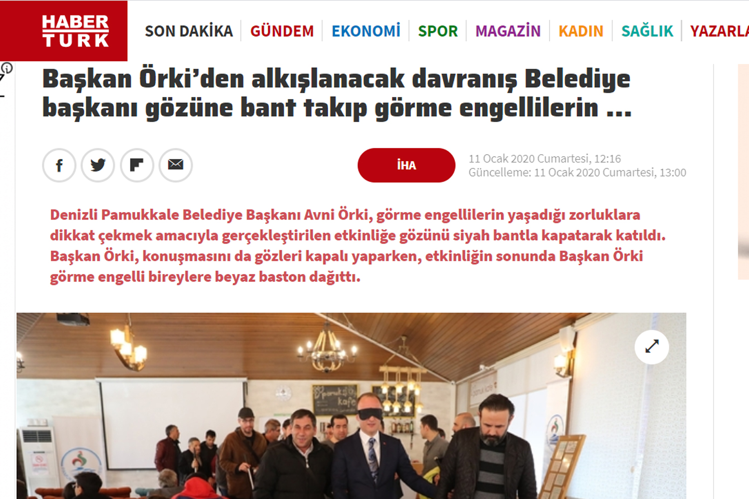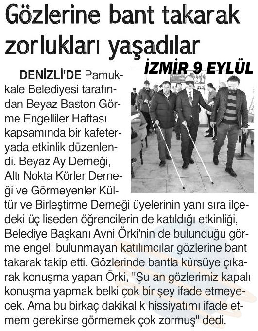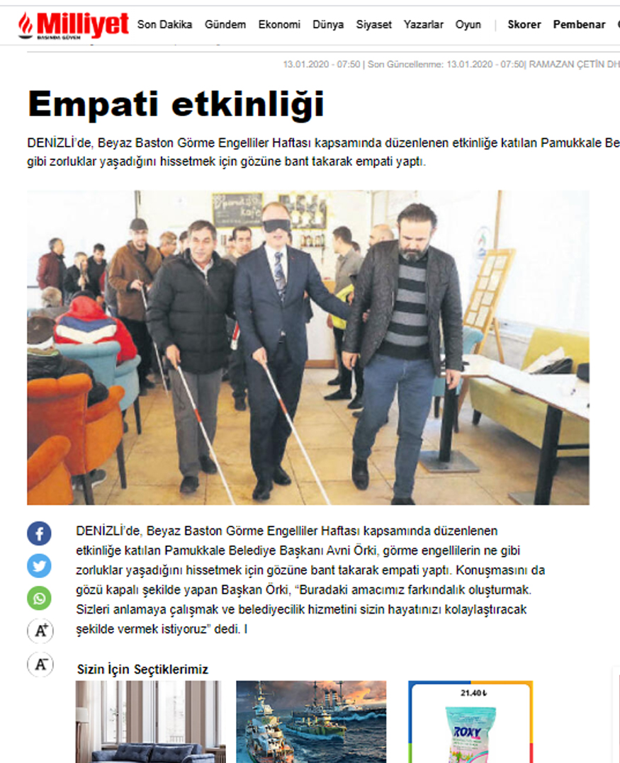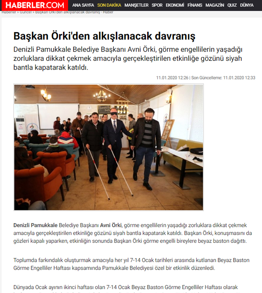 Toplumda farkındalık oluşturmak amacıyla her yıl 7-14 Ocak tarihleri arasında kutlanan Beyaz Baston Görme Engelliler Haftası kapsamında Pamukkale Belediyesi tarafından düzenlenen özel etkinlik ulusal medyanın dikkatinden kaçmadı. “Amacım sizleri daha iyi anlamaya çalışmak. Belediyecilik hizmetini sunarken sizin hayatınızı kolaylaştıracak ne türlü adım var ise onları atmak” diyen Pamukkale Belediye Başkanı Avni Örki’nin, görme engellilerin ne gibi zorluklar yaşadığını hissetmek için gözünde bantla gerçekleştirdiği etkinlik, yerel basınla birlikte, ulusal basınında ilgi odağı oldu. Haber ulusal basın ajanslarının ilk sıralarında yer aldı. Yerel Televizyon kanalları, yerel gazeteler haberi manşetlerinden verirken, ulusal medya ajanslarının servislediği haber tirajı milyonları bulan en çok gazetelerin sayfalarında yer aldı.