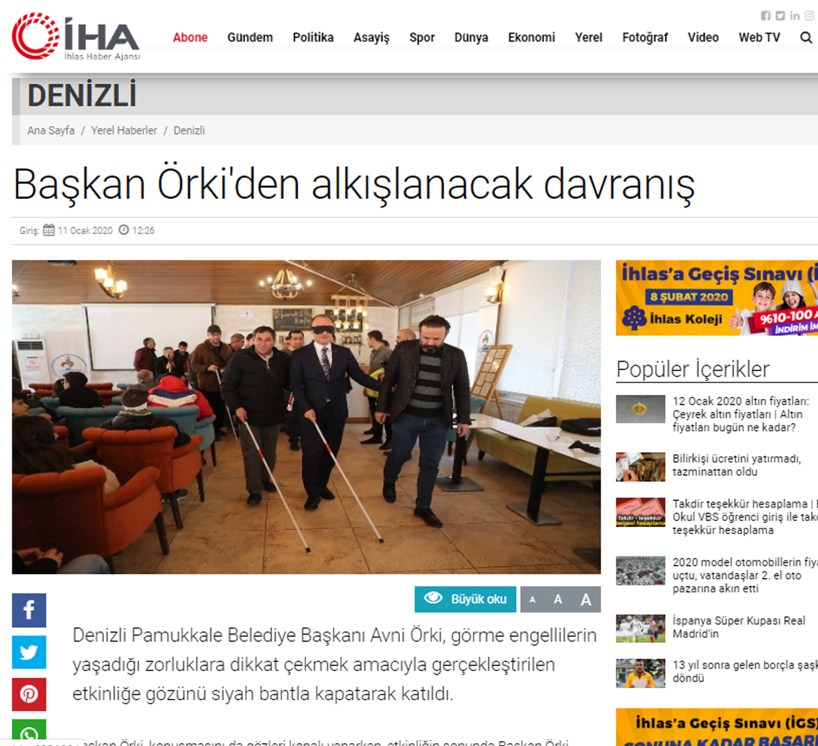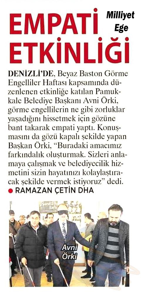 Pamukkale Belediye Başkanı Avni Örki’nin, toplumda farkındalık oluşturmak amacıyla Beyaz Baston Görme Engelliler Haftası kapsamında düzenlediği etkinlik yerel basınla birlikte, ulusal basının da ilgi odağı oldu. Başkan Örki’nin örnek davranışı tüm dünyaya örnek gösterildi.