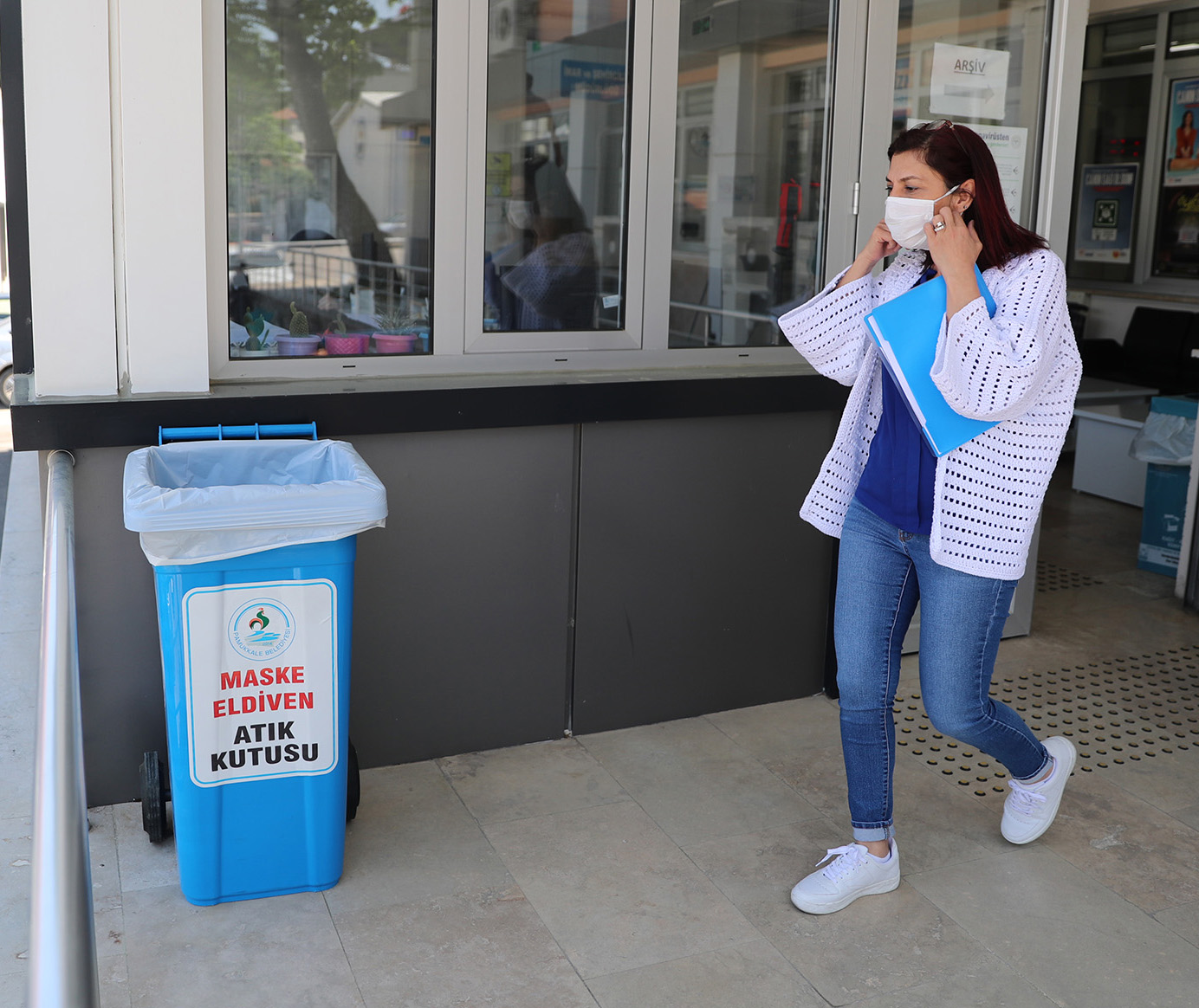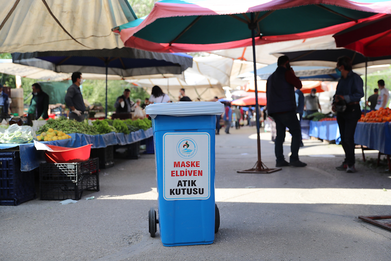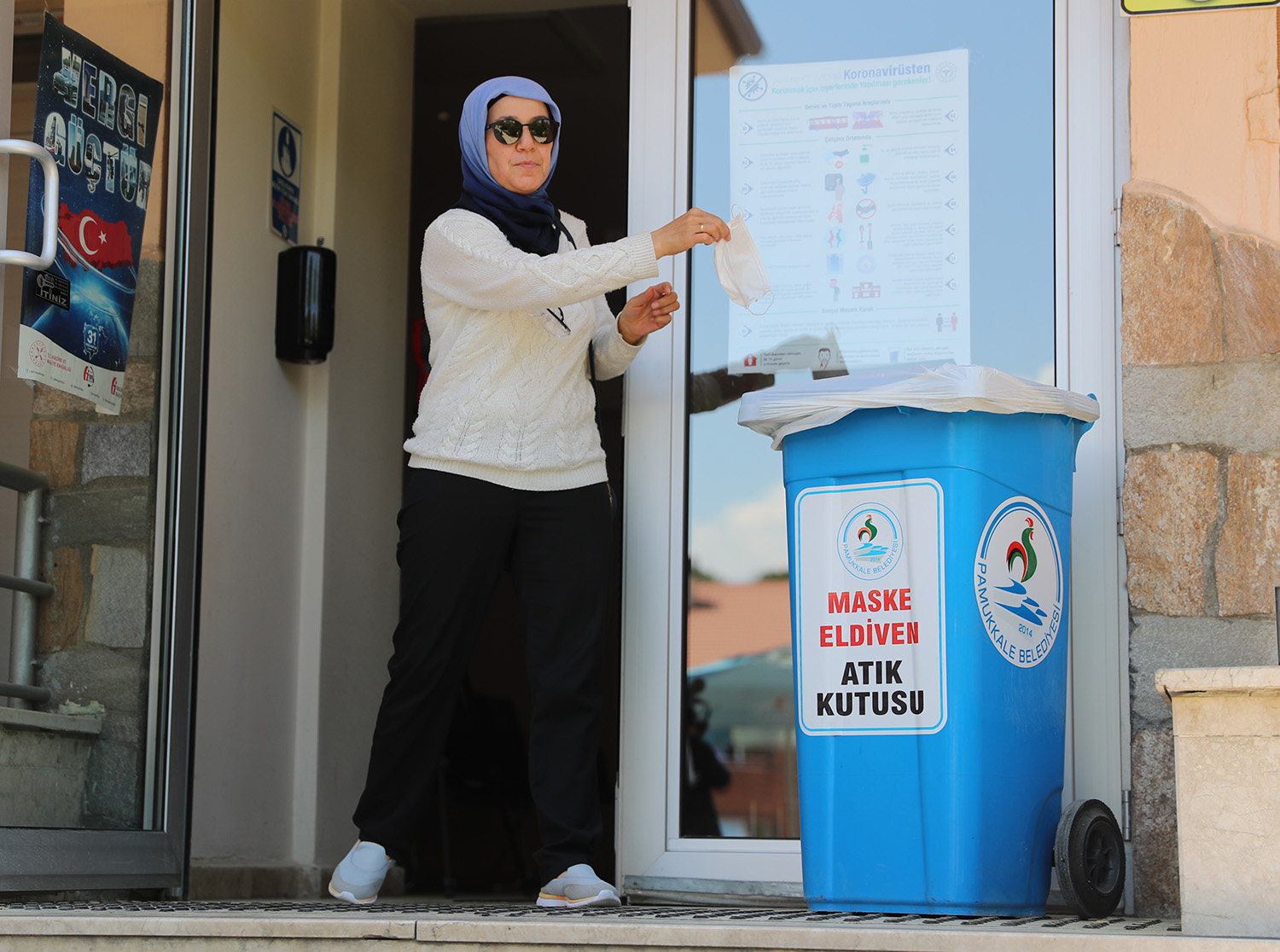 Pamukkale Belediyesi, koronavirüs salgını nedeniyle kullanımı artan maske ve eldivenlerin ayrı toplanması için özel atık kutuları pazaryerleri ve hizmet binalarında kullanıma sundu.