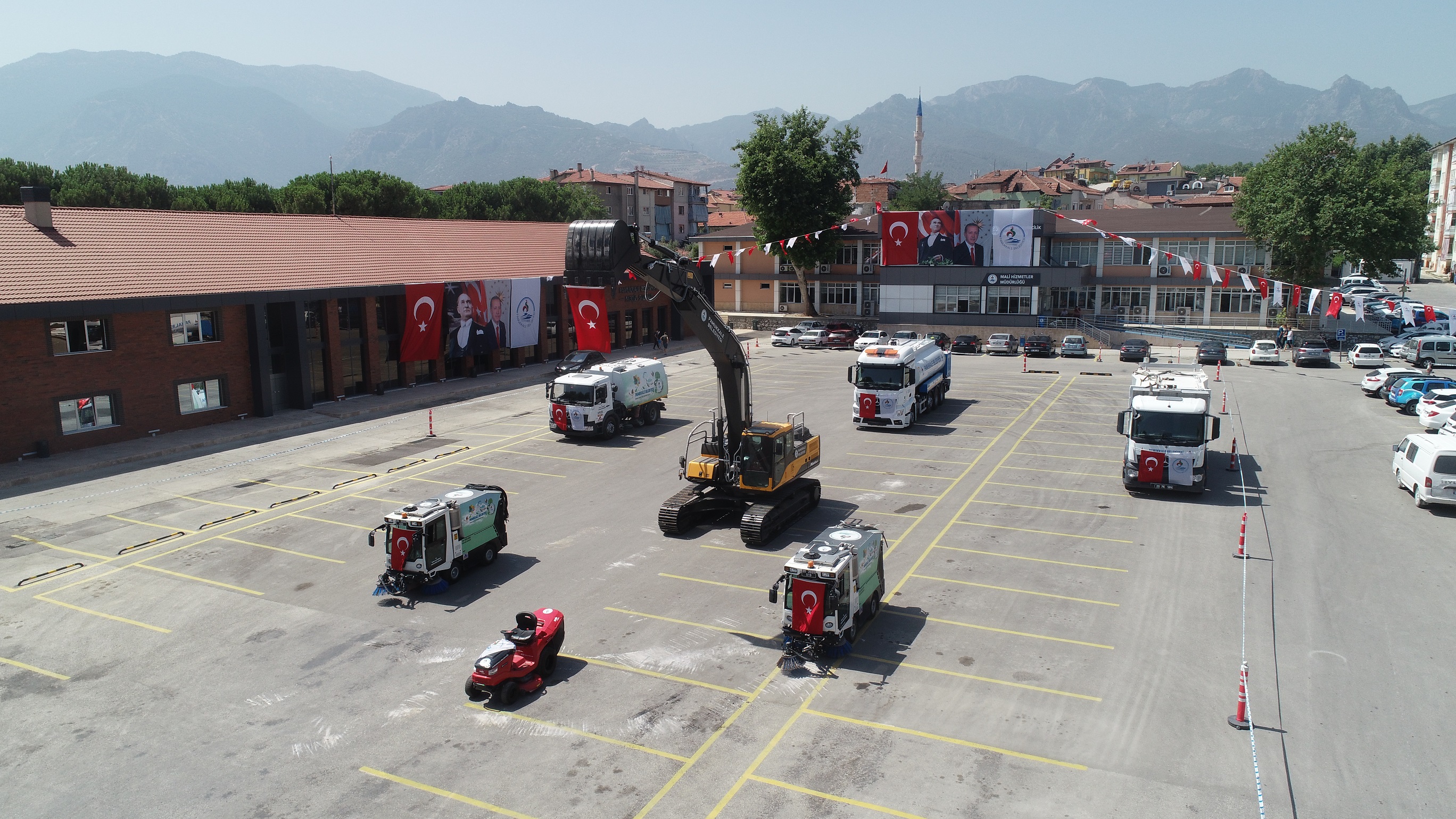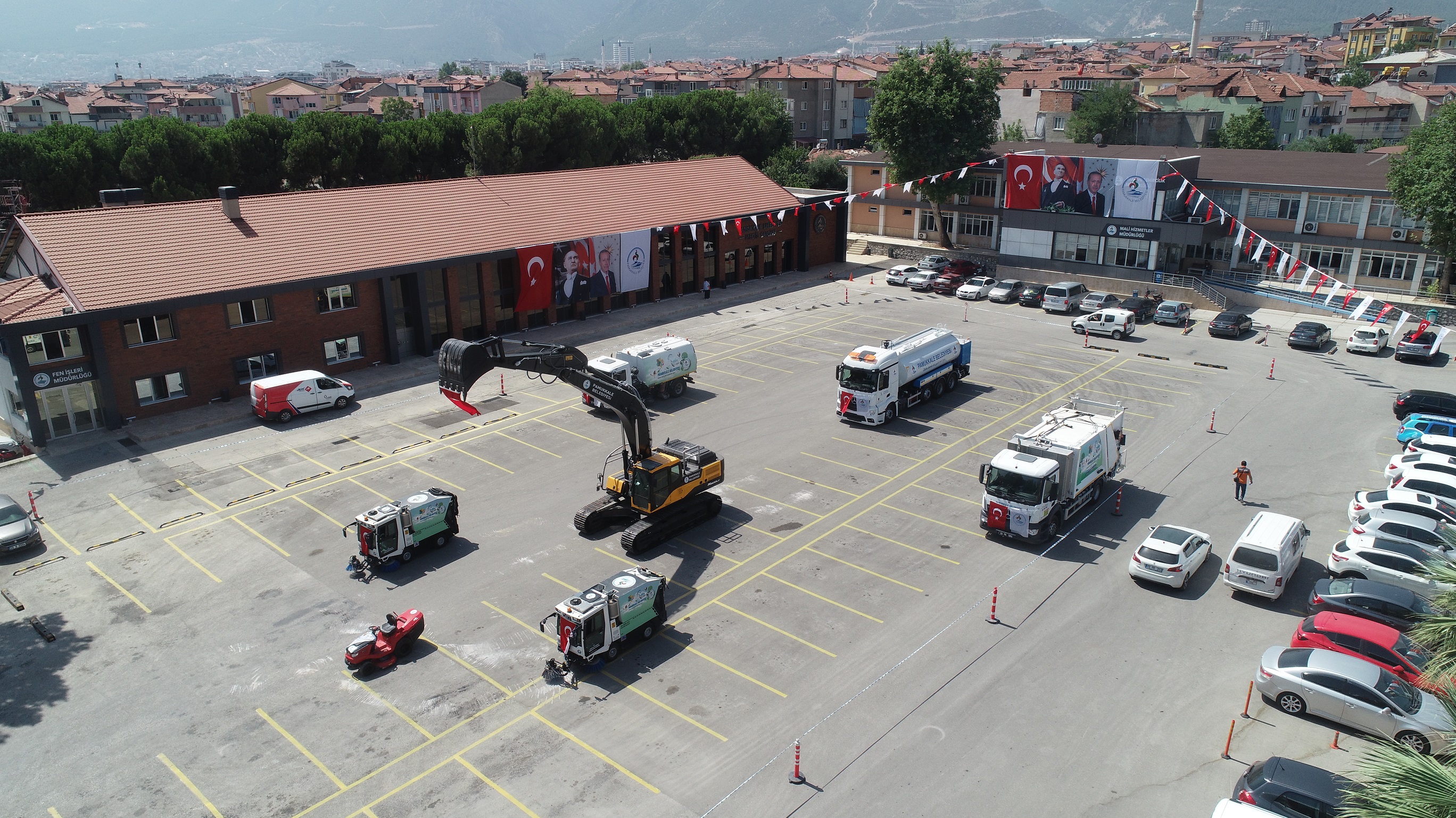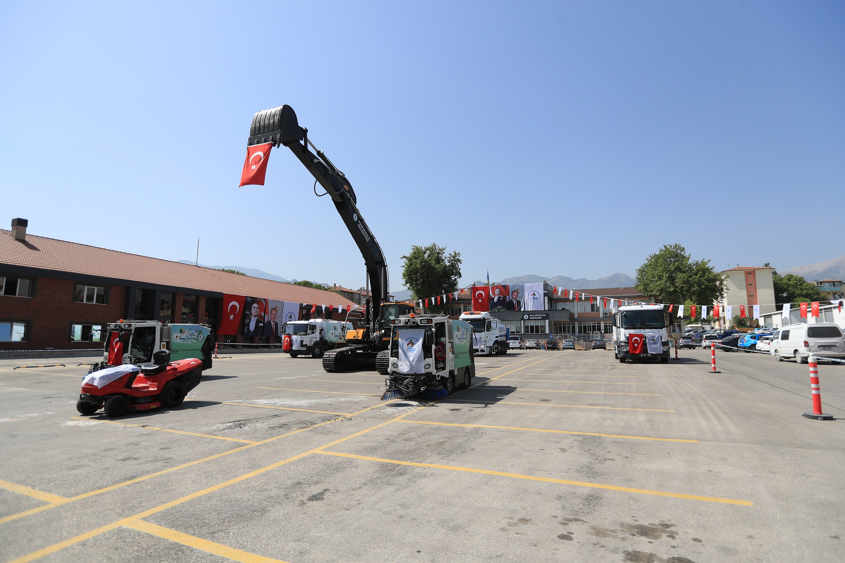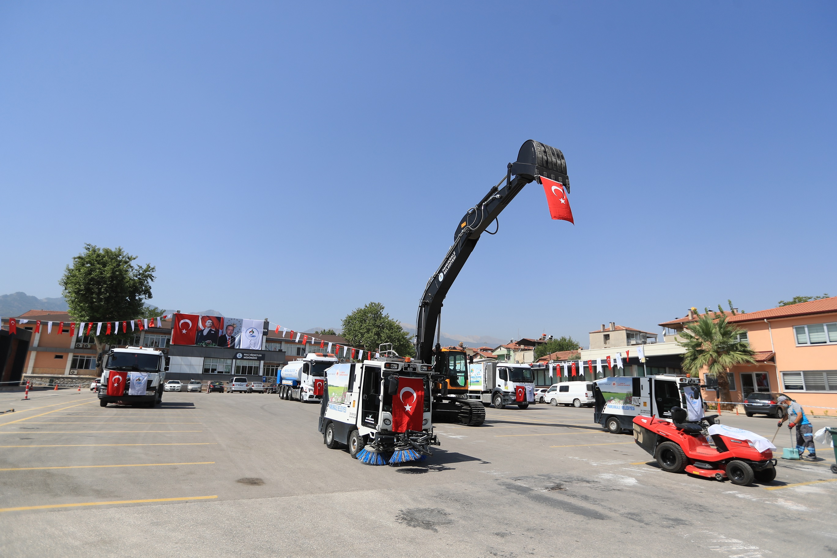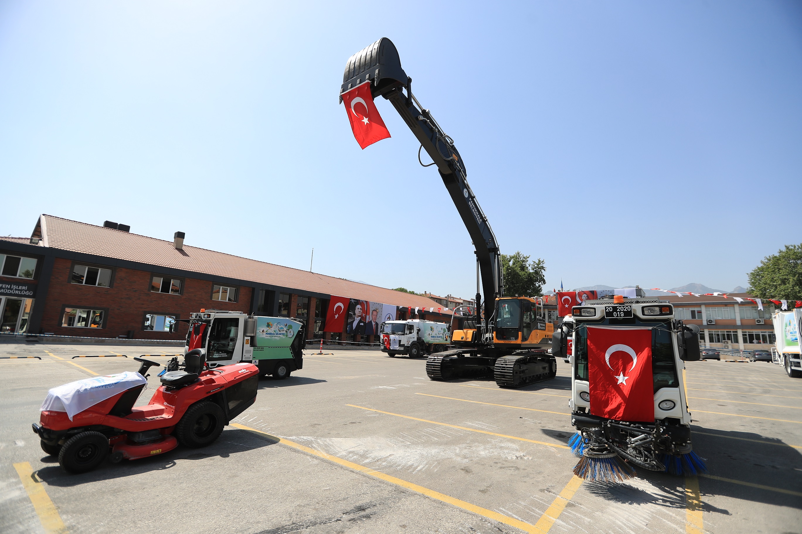 Her geçen gün araç filosunu daha da güçlendiren Pamukkale Belediyesi, geçtiğimiz yıl sonunda 65 milyon tasarrufla filosuna dahil ettiği 27 adet çöp toplama ve nakil aracının ardından filosuna 7 iş makinası daha ekledi. Temizlik işlerinde kullanılacak 1 adet 6 metreküp kapasiteli vakumlu yol süpürme aracı, 2 adet 2 metreküp yol süpürme aracı, 1 adet 13 metreküp kapasiteli çöp konteyneri yıkama ve dezenfekte aracı, 1 adet 18 tonluk sulama tankeri, 1 adet çim biçme traktörü ve arazi işlerinde kullanılacak 1 adet 30 ton yük kapasiteli paletli ekskavatör Pamukkale Belediyesinin araç filosuna dahil oldu. Yaklaşık 4 milyon 500 bin lira değerindeki yeni araçlar, Pamukkale Belediyesi YSE yerleşkesinde Ağustos ayı meclis toplantısı sonrasında belediye meclis üyelerinin de katılımıyla hizmete sunuldu.