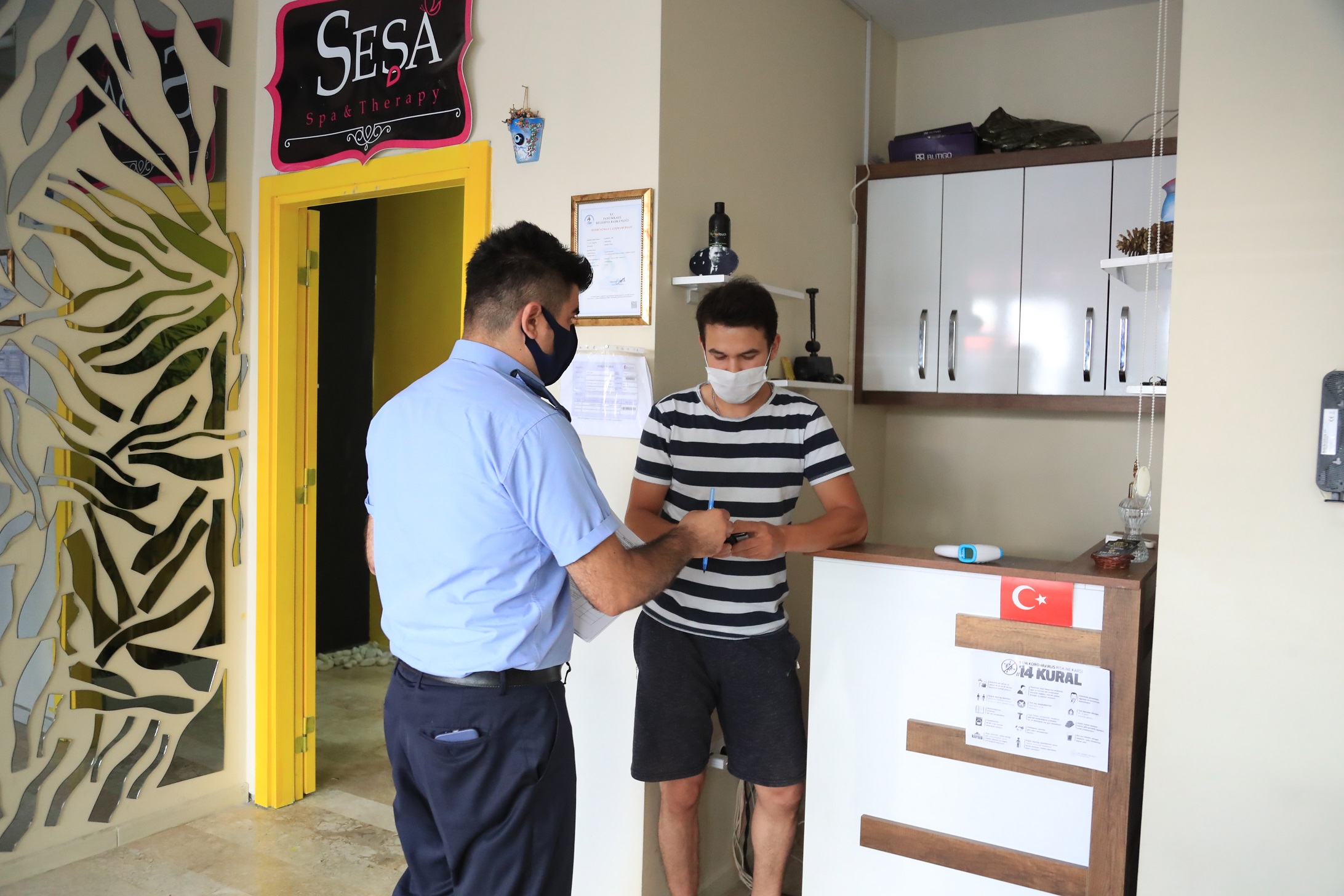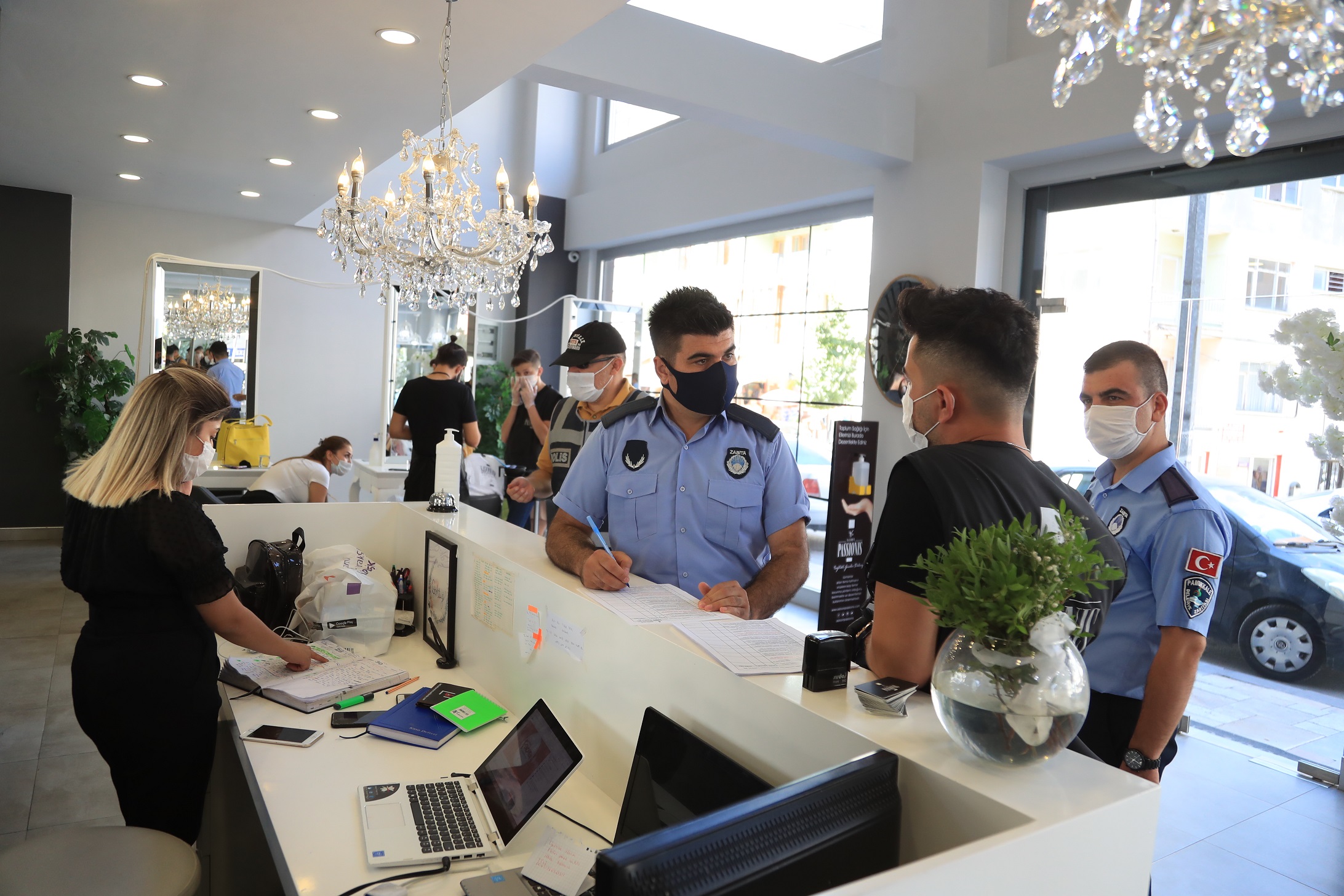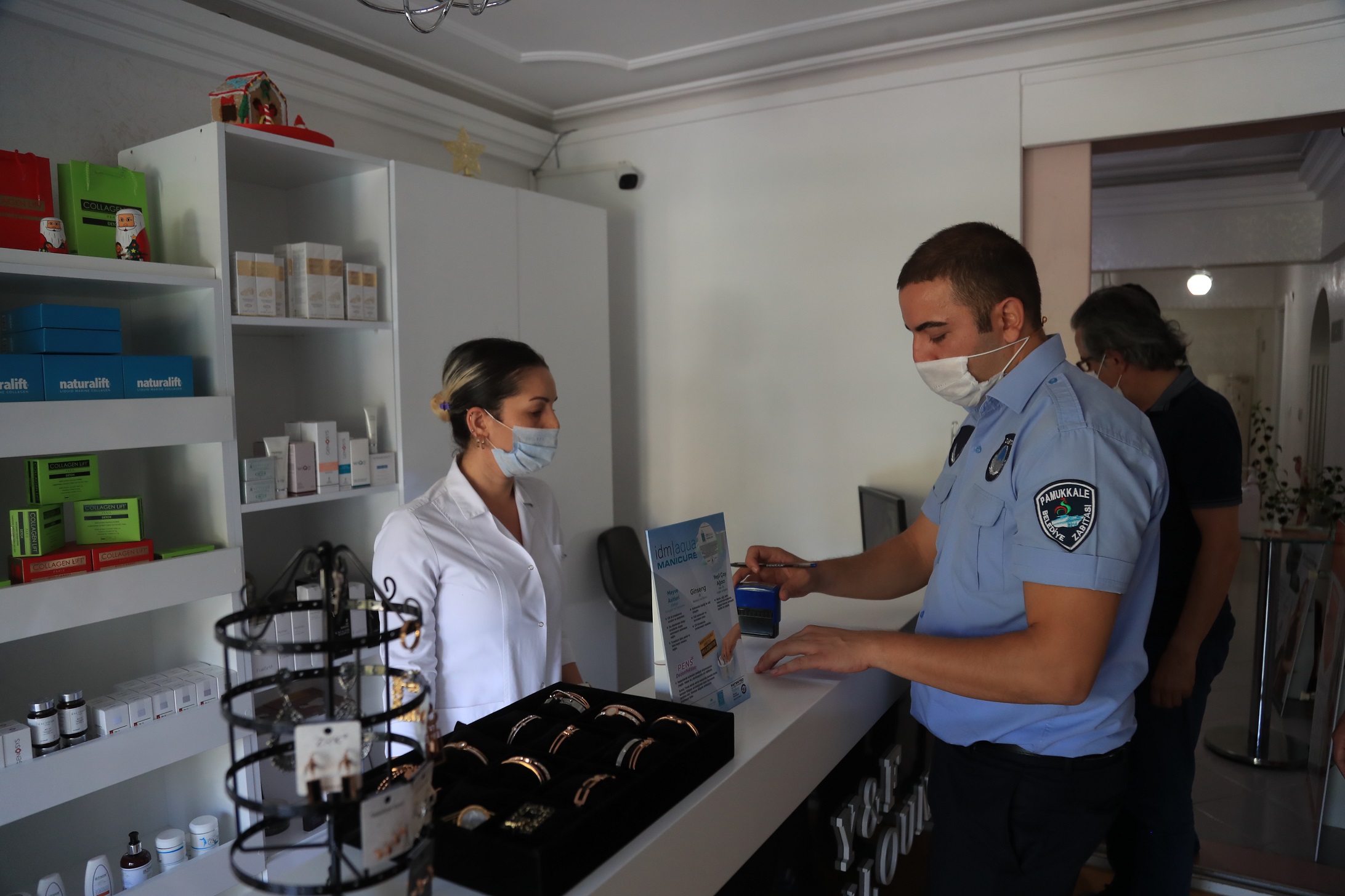 Koronavirüs salgınına karşı alınan tedbirler kapsamında rutin olarak denetimlerini sürdüren Pamukkale Belediyesi Zabıta Müdürlüğü ekipleri, geçtiğimiz hafta İçişleri Bakanlığı'nın 81 il valiliğine gönderdiği ‘Sağlık İçin Hepimiz İçin’ mottosunun ardından denetimlerini daha da sıklaştırdı. Pamukkale Belediyesi Zabıta Müdürlüğü, İlçe Emniyet Müdürlüğü, ilçe Jandarma Komutanlığı, İlçe Sağlık Müdürlüğü, ekipleriyle koordineli bir şekilde yaptığı denetimlerde, vatandaşların yoğun olarak kullandığı spor salonları, oyun salonları, berberler, kuaförler, güzellik merkezleri ve masaj salonlarını, düğün salonlarını ve sokak düğünlerini sıkı bir denetimden geçiriyor. Maske kullanımı, sosyal mesafe, dezenfektan kullanımı, tek kullanımlık ürünler bulundurulması ve temizliğe ilişkin denetim yapan ekipler, söz konusu mekanların ruhsat ve belgelerini de kontrol ettiler.