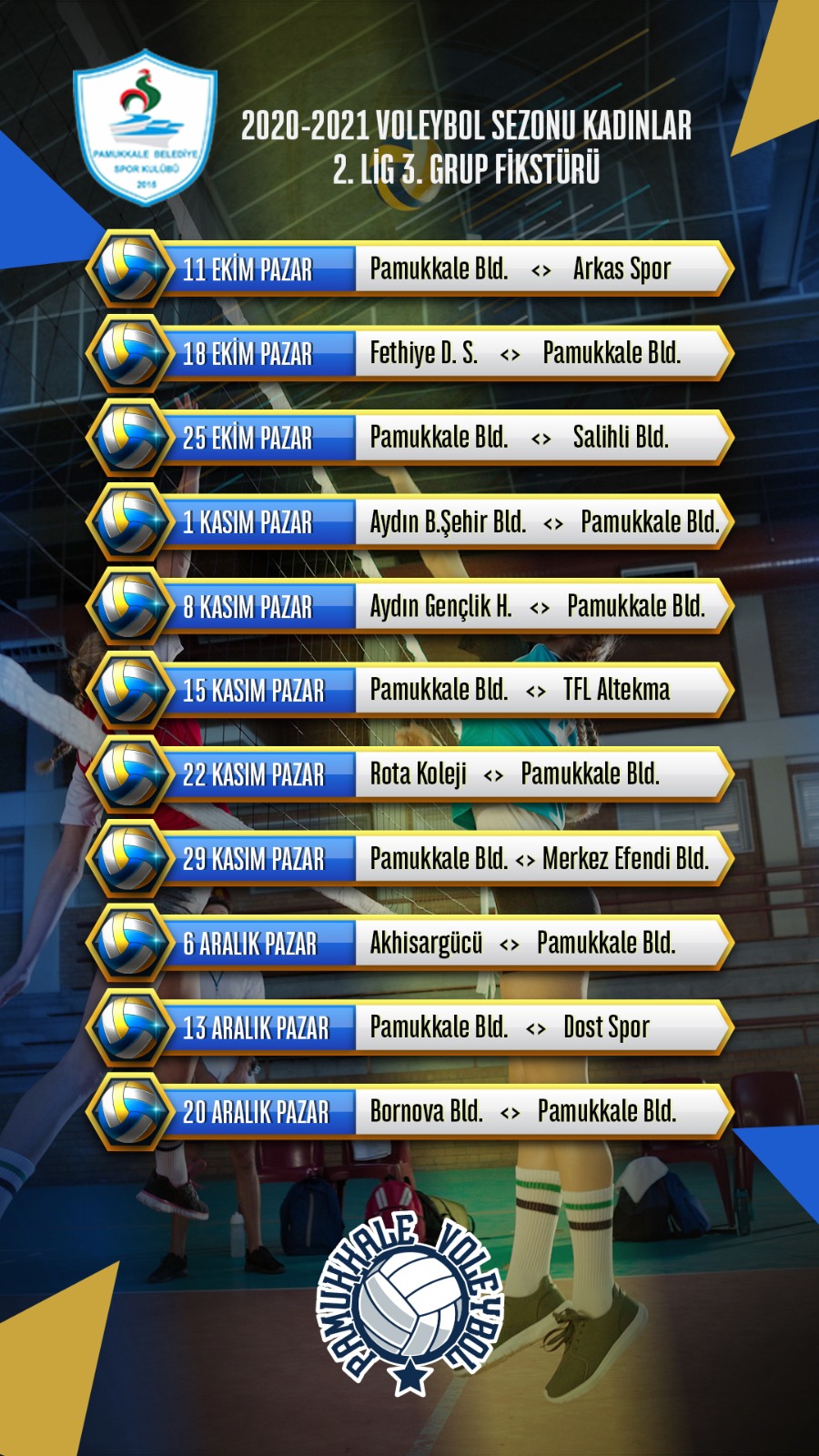 Pamukkale Belediye Spor Kulübü, 2020-2021 sezonunda Kadınlar 2. Voleybol Ligi 3. Grup’ta mücadele edecek. Tarihinde ilk kez 2. Lig’de yer alacak olan mavi-beyazlı takım sezon öncesi kadrosunu önemli transferlerle güçlendirmişti. Pamukkale Belediyespor Kadın Voleybol Takımı, antrenör Mehmet Ali Ayhan gözetiminde yeni sezon hazırlıklarını yoğun tempoda gerçekleştirdi. Sezon öncesi 5 hazırlık maçı oynayan mavi-beyazlı takım Bornova Belediyespor’u 3-2, Aydın Gençlik Hizmetleri’ni 3-0 ve Aydın Büyükşehir Belediyespor’u 3-1 yenerken, Salihli Belediyespor ve TFL Altekma’ya da 3-2 yenildi.