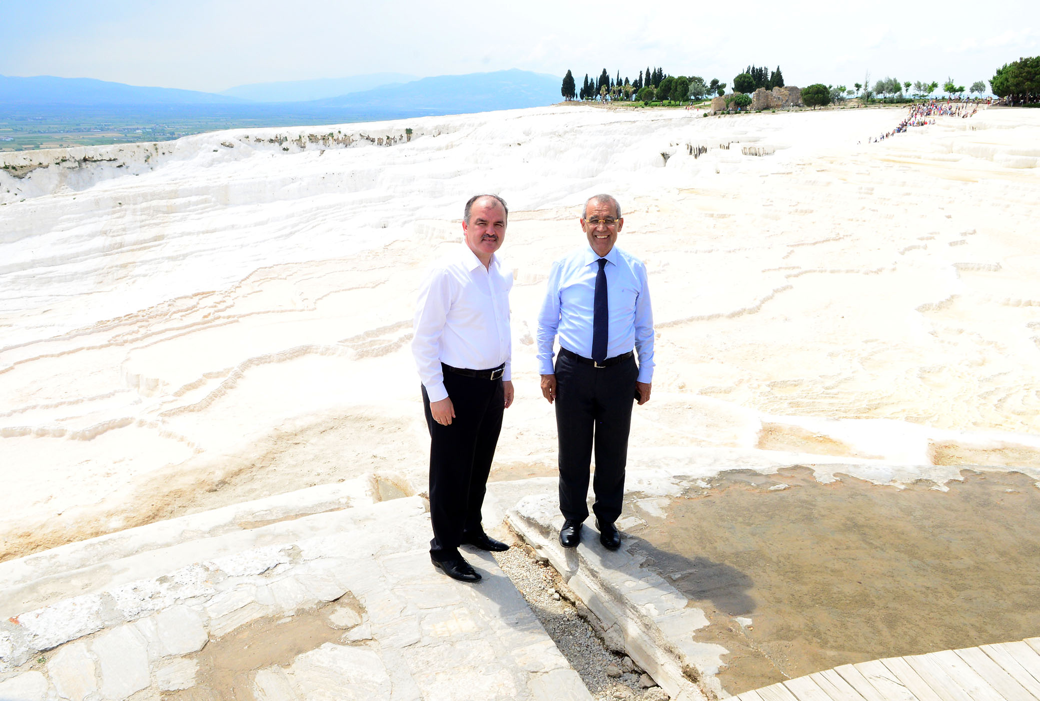 Pamukkale Belediye Baskani Hüseyin Gürlesin, dünyanin göz bebegi olan yilda 2 milyon turistin ziyaret ettigi beyaz cennet Pamukkale’nin isletmesini devir almak için geçtigimiz ay resmi basvuru yapildigini açiklamisti. Süreçle ilgili olarak Baskan Gürlesin, 30 Nisan’da Kültür ve Turizm Bakan Yardimcisi Abdurrahman Arici ile Pamukkale’de görüsmüstü. Pamukkale’nin isletmesi devir almak noktasinda girisimlerini sürdüren Baskan Gürlesin, Bakan Yardimcisi Arici’yi bir kez daha Pamukkale’ye davet ederek agirladi.