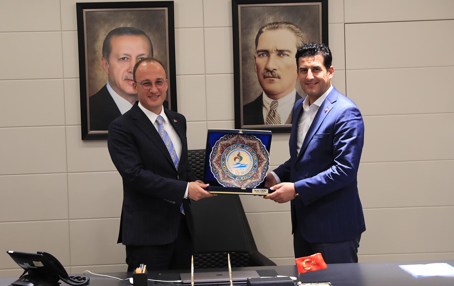 AK Parti Pamukkale İlçe Başkanı Uğur Gökbel ise Pamukkale Belediye Başkanı Avni Örki’nin yapılan hizmetlerle partinin elini güçlendirdiğini ifade ederek, “Birçok çalışmanın yapıldığı ilçemiz her geçen gün daha güzel oluyor. Pamukkale’de üst yapı çalışmaları tamamlandığında ilçemiz daha güzel olacak. Sayın Başkanımız Avni Örki de bu konuda önemli çalışmalar yapıyor. Kendisine teşekkür ediyorum. AK Parti olarak Cumhurbaşkanlığımızın liderliğinde 2023 ve 2024 seçimlerinden el birliği ile Denizli’de birinci parti olarak çıkacağımıza olan inancım tam” dedi. Pamukkale Belediye Başkanı Avni Örki ile geçmişte birlikte Denizli için çalıştıklarını ifade eden AK Parti Denizli İl Başkanı Yücel Güngör, “Kendisi o zaman da bizimle tecrübelerini paylaşmıştı. Bugün de kendisi Pamukkale Belediye Başkanlığını layıkıyla yerine getiriyor. Denizlimiz büyük bir il. Pamukkale’de buranın en büyük ilçesi. Hep birlikte hem Denizli hem de Pamukkale’de 2023 yılına hazırlanıyoruz. Seçimde cumhur ittifakımızla da gönül gönüle vererek daha büyük oy oranıyla başarımızı taçlandıracağımıza olan inancım tam. Biz bunu başarabilecek bir ekibe sahibiz. Başta büyükşehir belediye başkanımızın yaptıklarını, Pamukkale belediye başkanımızın yaptıklarını diğer ilçelerimizin yaptıkları hizmetleri gördükçe bu konudaki güvencemiz daha da artıyor. Yereldeki çalışmalarımız bizim için çok önemli. Bizler ilimizde davranışlarımızla, sorunları çözüm noktasına bakış açımızla Cumhurbaşkanımız Recep Tayyip Erdoğan’ı temsil ediyoruz. Bu yüzden çok daha dikkatli olmalıyız. Bizim odaklanmamız gereken tek nokta 2023 seçimleri olmalı” dedi. Ziyaretin ardından Pamukkale Belediye Başkanı Avni Örki, AK Parti Denizli İl Başkanı Yücel Güngör’e günün anısına hediye takdim etti.