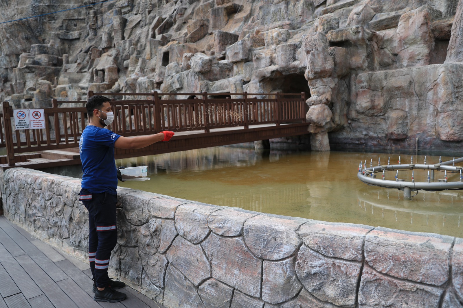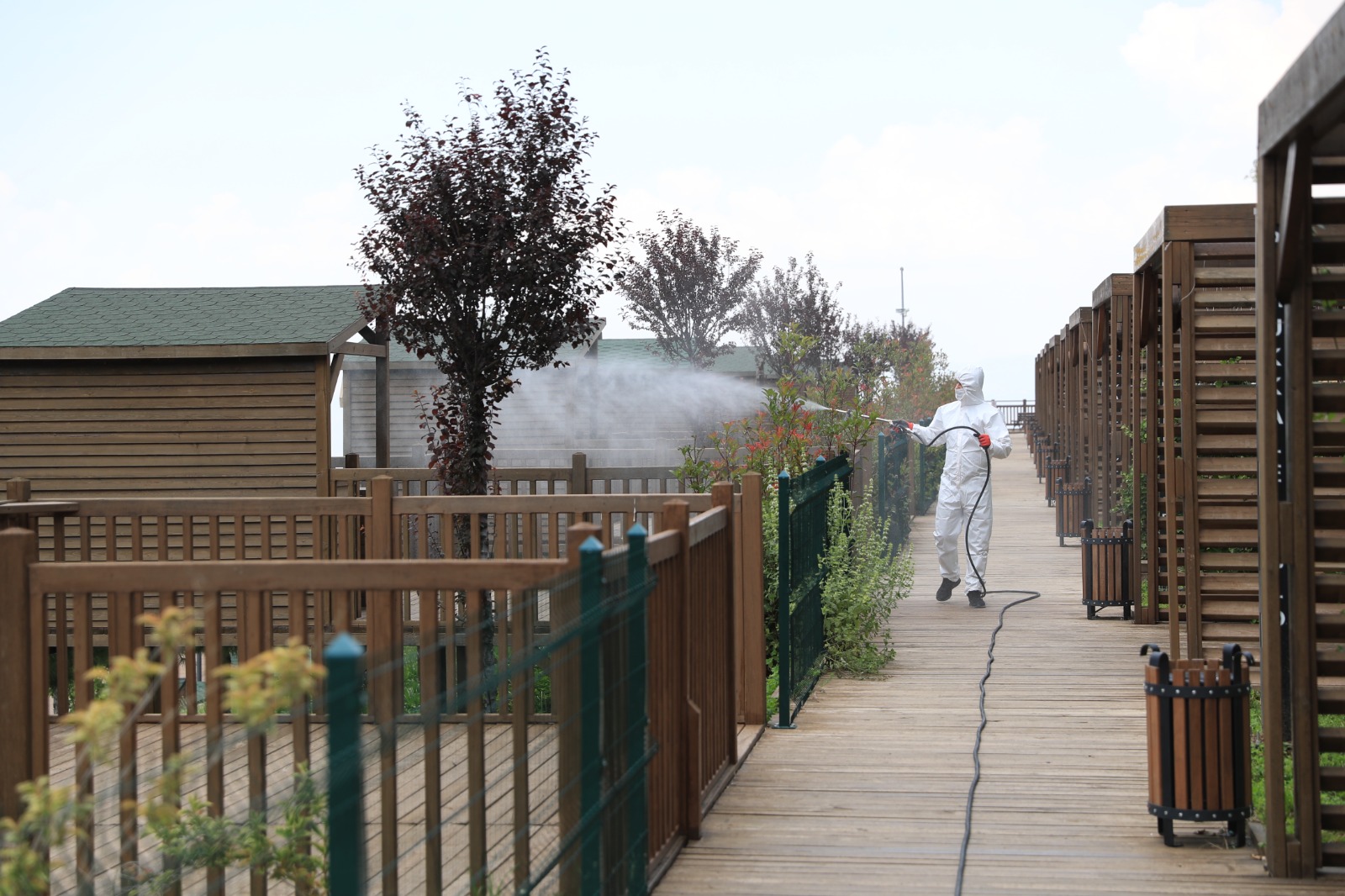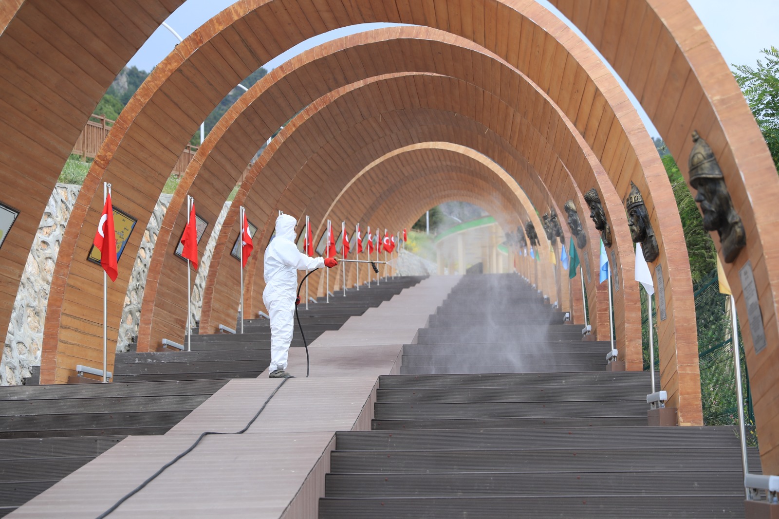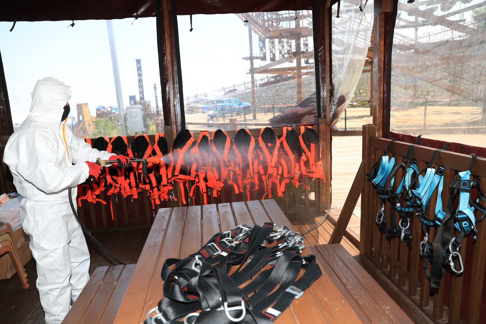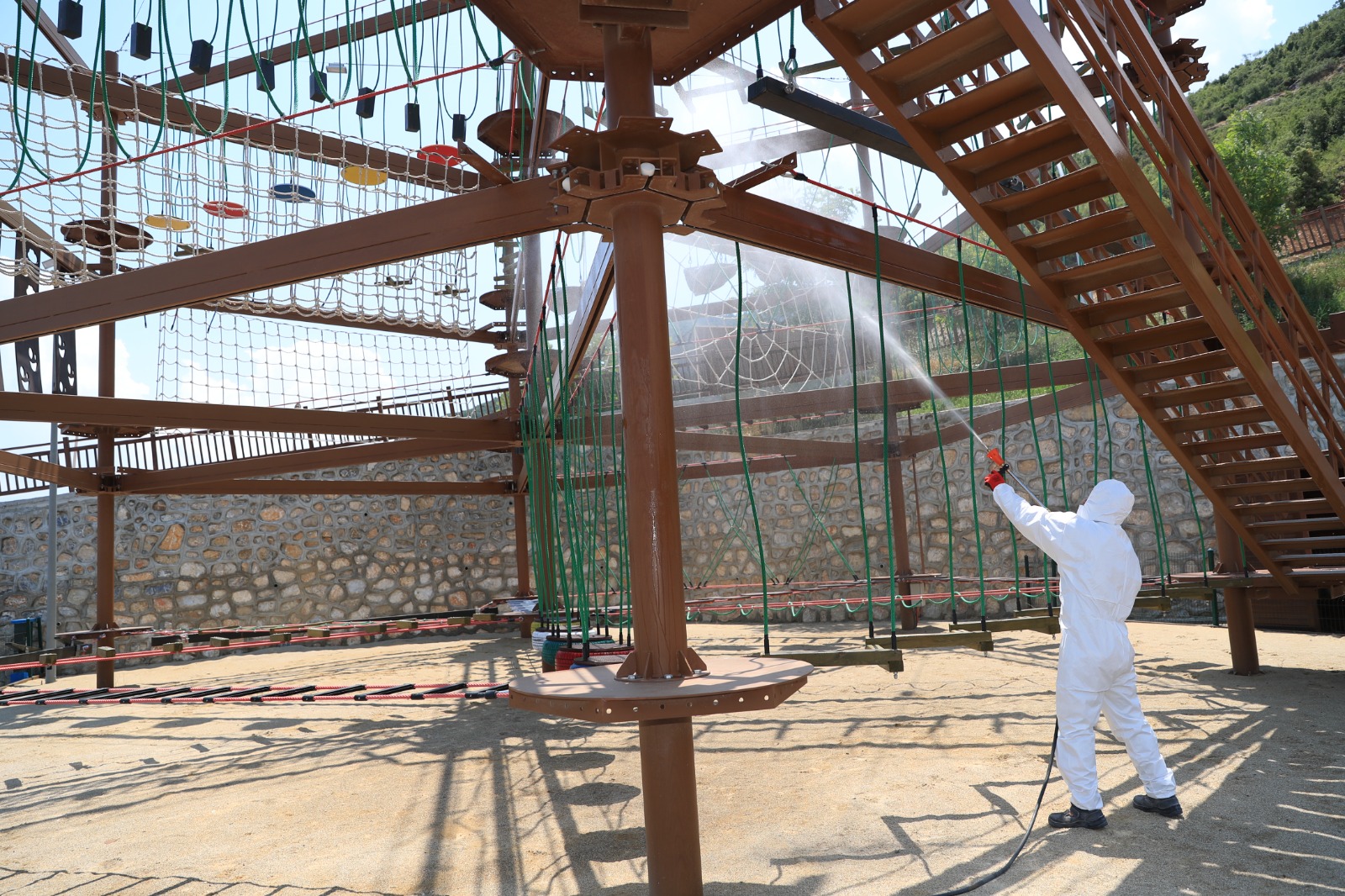 Türkiye’nin en büyük tematik kent ormanı unvanına sahip Pamukkale Belediyesi Seyir Tepesi Şehir Ormanı, vatandaşların ilgisini çekiyor. Özellikle Cumartesi günleri yoğunluk yaşanırken Pamukkale Belediyesi, vatandaşların sağlığı için gerekli tedbirleri alıyor. Günlük olarak tüm ortak alanlar dezenfekte edilerek ziyaretçiler için steril bir ortam oluşturuluyor. Pamukkale Belediyesi Sağlık İşleri Müdürlüğü ekipleri sokağa çıkma kısıtlamasının olduğu Pazar günü ise Seyir Tepesi’nde detaylı çalışma yaptı. 7 etaptan oluşan ve 405 bin metrekarelik alana sahip Pamukkale Belediyesi Seyir Tepesi Şehir Ormanı’nda ekipler tüm ortak alanlarda dezenfekte işlemi gerçekleştirdi. Bunun yanında yeşil alanlarda böceklere karşı ilaçlama yapılırken, suyun olduğu alanlarda da larva ile mücadele için gerekli işlemler uygulandı. Ayrıca dev tesiste haşere ile ilgili de ilaçlama yapılarak Seyir Tepesi Şehir Ormanı’nın dört bir yanı steril hale getirildi. Pamukkale Belediyesi Seyir Tepesi Şehir Ormanı’nda bu uygulamalar düzenli olarak gerçekleştiriliyor.