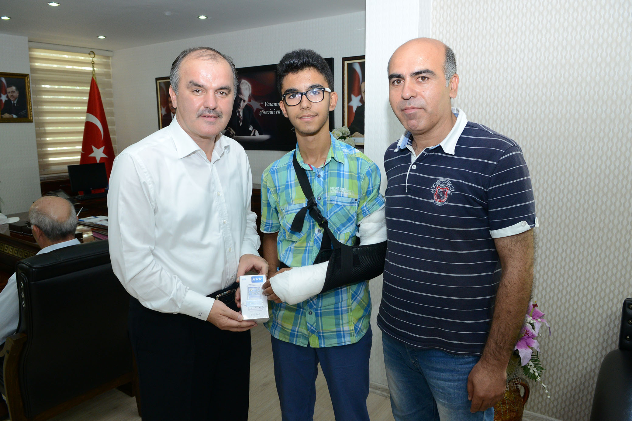 Oguzhan’in basarisini bir kez daha kutlayan Baskan Gürlesin, Oguzhan’a akilli bir cep telefonu hediye ederek, ödüllendirdi. Egitim hayatinda istedigi noktaya ulasmasi temennisinde bulunan Baskan Gürlesin, “Çocuklarimizin böylesi basarilarini gördügümüzde gururlaniyoruz. Bugünümüzde ve gelecegimizde en ihtiyaç duydugumuz sey donanimli ve egitimli bireyler. Bilimde her alanda ülkemizi daha iyi noktalara tasiyacak beyinler. Bu nedenle egitimi çok önemsiyoruz. Pamukkale Belediyesi olarak ilçemizde egitimin kalitesini daha da yukari tasimak için okullarimizin her birine dokunuyor ve fiziki ihtiyaçlarini gidermeye çalisiyoruz. Bireysel anlamda da çocuklarimizin basarilarini gördügümüzde onlari daha da motive etmek anlaminda katkilar sunuyoruz. Oguzhan’i egitim hayatindaki basarisindan dolayi kutluyorum” dedi.