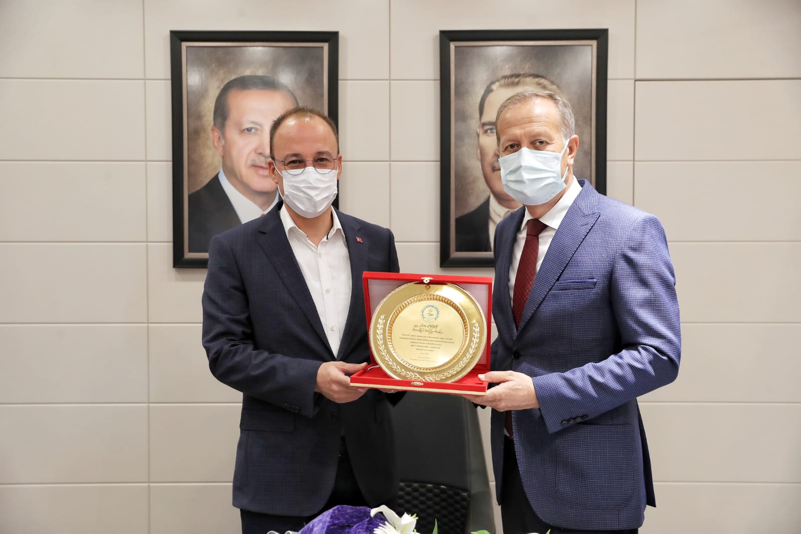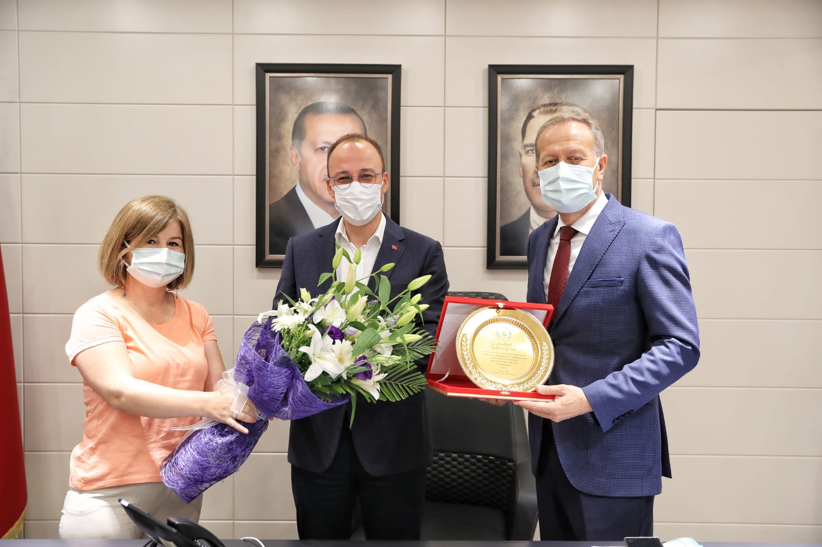 Pamukkale İlçe Milli Eğitim Müdürü Mehmet Çimen ile beraberindeki şube müdürleri Osman Ülçay, Evin Payan, Haşim Ülker, Pamukkale Belediye Başkanı Avni Örki’yi makamında ziyaret ettiler. Pamukkale Belediyesi’nin ilçe okullarına yaptığı değerli katkılarından dolayı teşekkür ziyaretine geldiklerini belirten Pamukkale İlçe Milli Eğitim Müdürü Mehmet Çimen, Pamukkale Belediye Başkanı Avni Örki’ye teşekkür plaketi ve çiçek takdim etti. “İlçemizde bulunan okullarımızda yaptığı çalışmalardan dolayı teşekkür etmek istedik” diyen Pamukkale İlçe Milli Eğitim Müdürü Mehmet Çimen, “Pamukkale Belediye Başkanı Avni Örki’ye 2020-2021 Eğitim Öğretim yılı ve koronavirüs salgını süresince ilçedeki tüm okullara verdiği destekten dolayı teşekkür ediyoruz. Belediyemiz Pamukkale’mize bağlı en ücra mahallelerimizde okullarımızdan, merkezdeki okullarımıza kadar salgın süresince düzenli olarak dezenfekte işlemi yapıldı. Bunun yanında bahçe temizliği, peyzaj çalışmaları, kalorifer tesisatlarının elden geçirilmesi, tamirat, boya ve benzeri işlerin yapılması, kütüphane kazandırılması ve mevcut kütüphanelerimize binlerce kitap kazandırılması, 2 bin öğrencimize tablet dağıtılması gibi birçok önemli konuda Pamukkale Belediye Başkanımızın katkıları oldu. Sayelerinde başarılı bir eğitim öğretim dönemi geçirdik. Pamukkale İlçe Mili Eğitim Müdürü olarak okullarımızdaki eser ve hizmetlerinizden dolayı minnettarlığımızı iletiyorum. Teşekkür ediyorum” dedi.