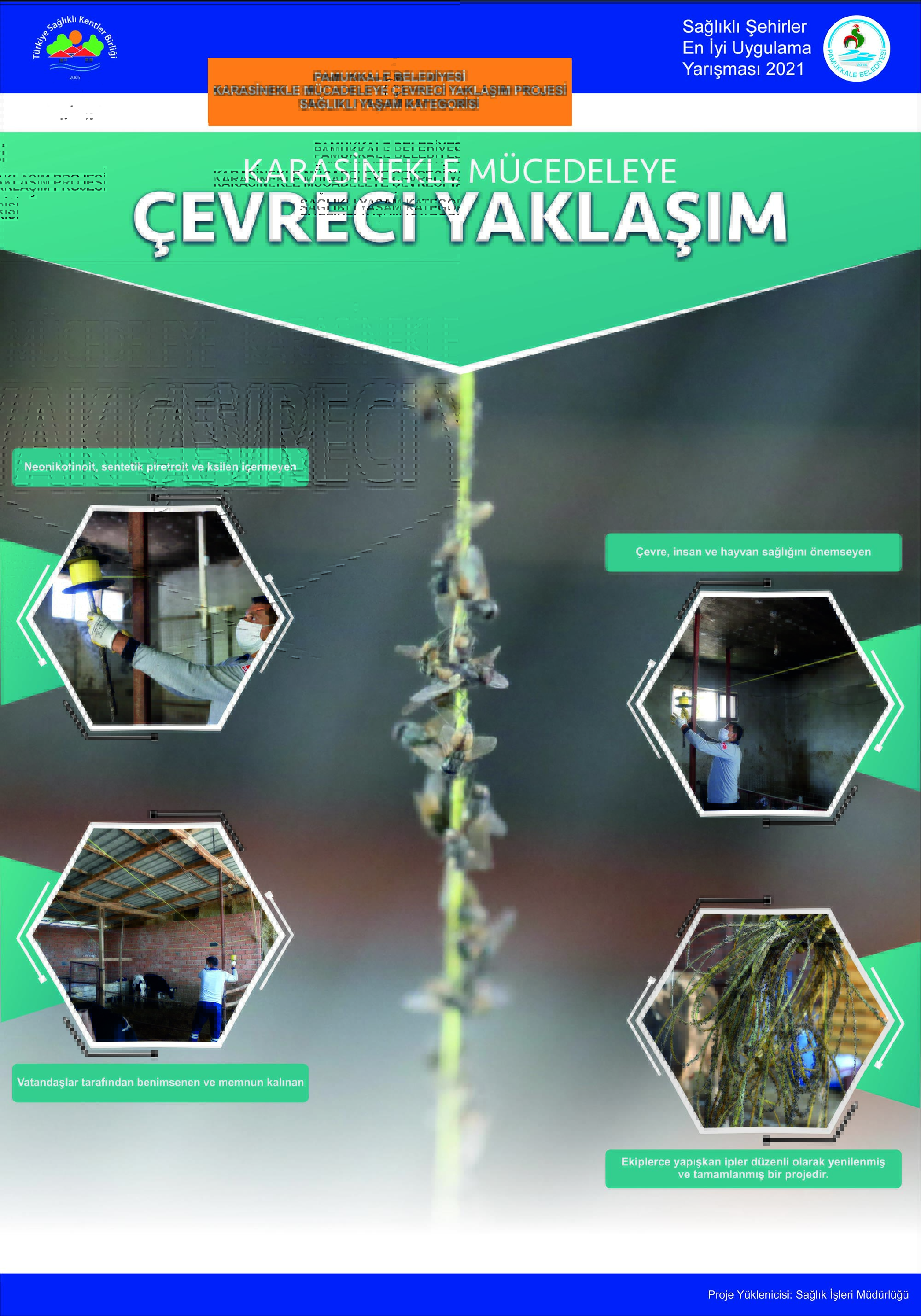 Pamukkale Belediyesine ödül getiren bir diğer yarışma ise yine Pamukkale Belediyesinin üyesi olduğu Sağlıklı Kentler Birliği’nin “2021 Sağlıklı Şehirler En İyi Uygulama Yarışması” oldu. Yarışmada, Çevre Koruma ve Alt Yapı Çalışmaları Sağlıklı Yaşam kategorisinde Pamukkale Belediyesi, “Karasinekle Mücadeleye Çevreci Yaklaşım” başlığıyla katıldığı yarışmada jüri özel ödülüne layık görüldü. Karasinekle mücadelede kimyasal içermeyen, çevreye ve hayvanlara zarar vermeyen yer altı ve yer üstü kaynaklarının kirliliğinin önüne geçen yapışkan ip kullanılması Pamukkale Belediyesinin ödül almasını sağladı. “2021 Sağlıklı Şehirler En İyi Uygulama Yarışması”nın ödül töreninin Ekim ayı içinde gerçekleşeceği açıklandı.