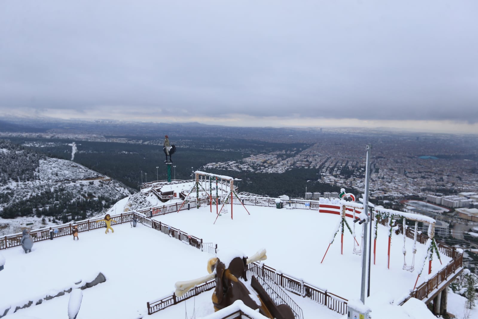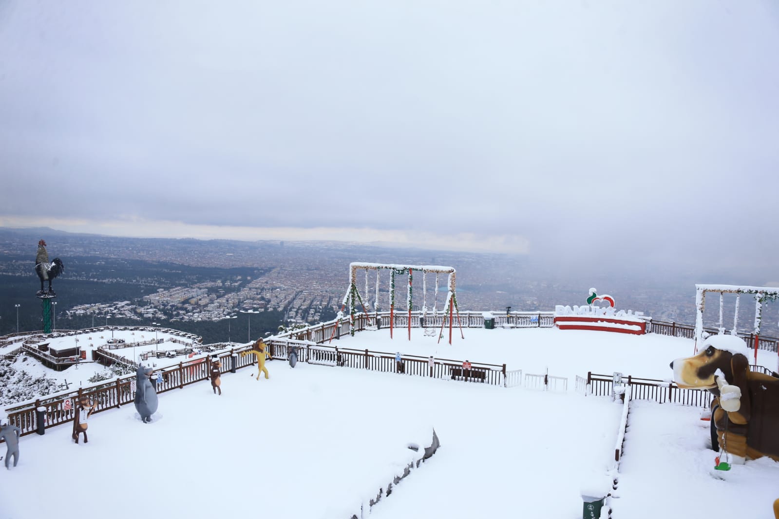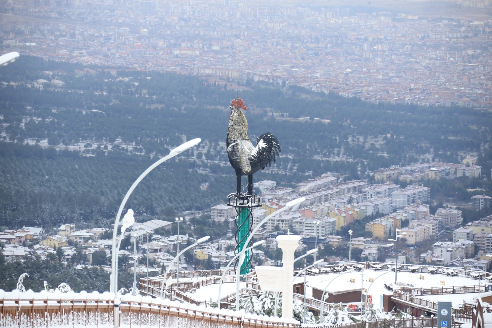 Türkiye’nin en büyük tematik kent ormanı olan Pamukkale Belediyesi Seyir Tepesi Şehir Ormanı hizmete girdiği günden beri yüzbinlerce ziyaretçiyi ağırladı. Ülkemizi ve ilimizi etkisi altına alan kar yağışı 800 rakımlı Seyir Tepesi’nde de etkili oldu. Kar yağışının olduğu dakikalarda Pamukkale Belediyesi Seyir Tepesi Şehir Ormanı’ndan Denizli manzarası görülmeye değerdi. Her yaştan vatandaşın kendi ilgi alanına göre yerleri barındıran Seyir Tepesi tamamen beyaz örtüyle kaplandı. Muhteşem görüntüsüyle dikkat çeken Pamukkale Belediyesi Seyir Tepesi Şehir Ormanı’ndan karlı Denizli manzarası da bir başka güzel. Dev Denizli Horoz’u ve şehir manzarası Pamukkale Belediyesi Seyir Tepesi Şehir Ormanı’nın sosyal medya hesaplarından paylaşıldı. Öte yandan Pamukkale Belediyesi Seyir Tepesi Şehir Ormanı vatandaşları bekliyor. Güvenlik nedeniyle özel araçla girişin izin verilmediği Seyir Tepesi Şehir Ormanı’na ulaşım ücretsiz servislerle sağlanacak. Kır kahvesi ve Seyr-Et Restoran ile birlikte tüm birimleriyle Seyir Tepesi hafta sonu 09.00-20.00, hafta içi de 10.00-19.00 saatleri arasında hizmet veriyor.