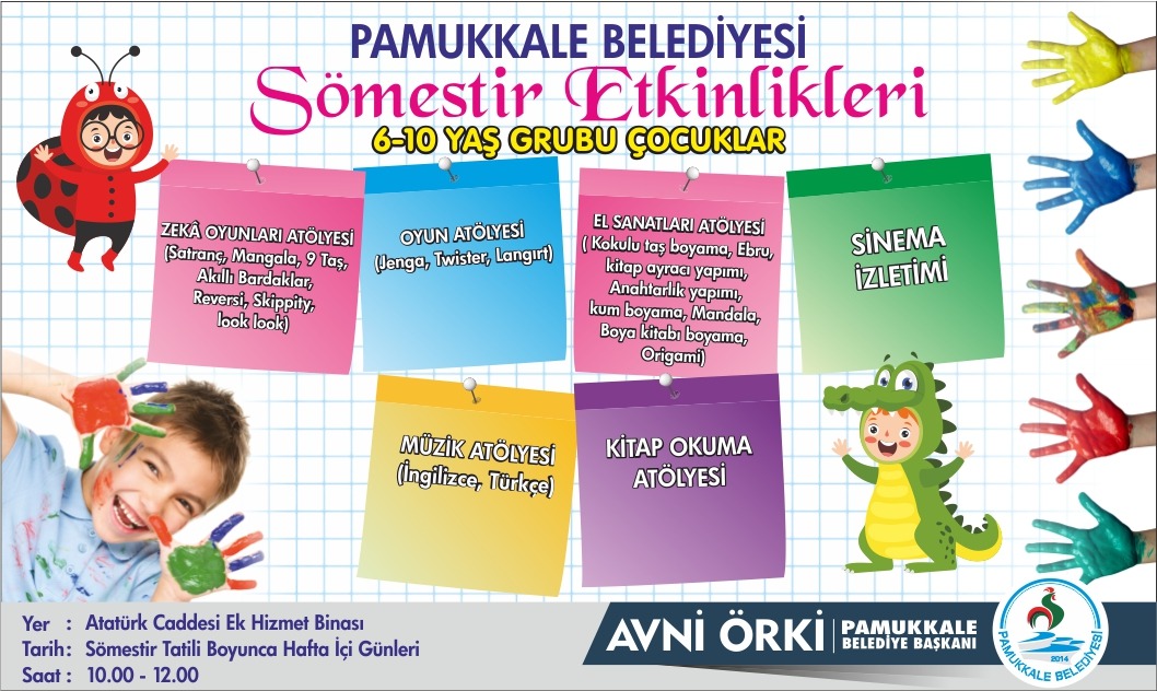 Pamukkale Belediyesi, ilçe genelinde yaşayan 6-10 yaş grubunda yer alan çocukların katılabileceği “Sömestir Atölyesi” açıyor. Pamukkale Belediye Başkanı Avni Örki, “Bu yarıyıl tatilinde çocuklarımıza yoğun bir ders programı ardından, tatil gibi tatil yaşatmak istedik” dedi.