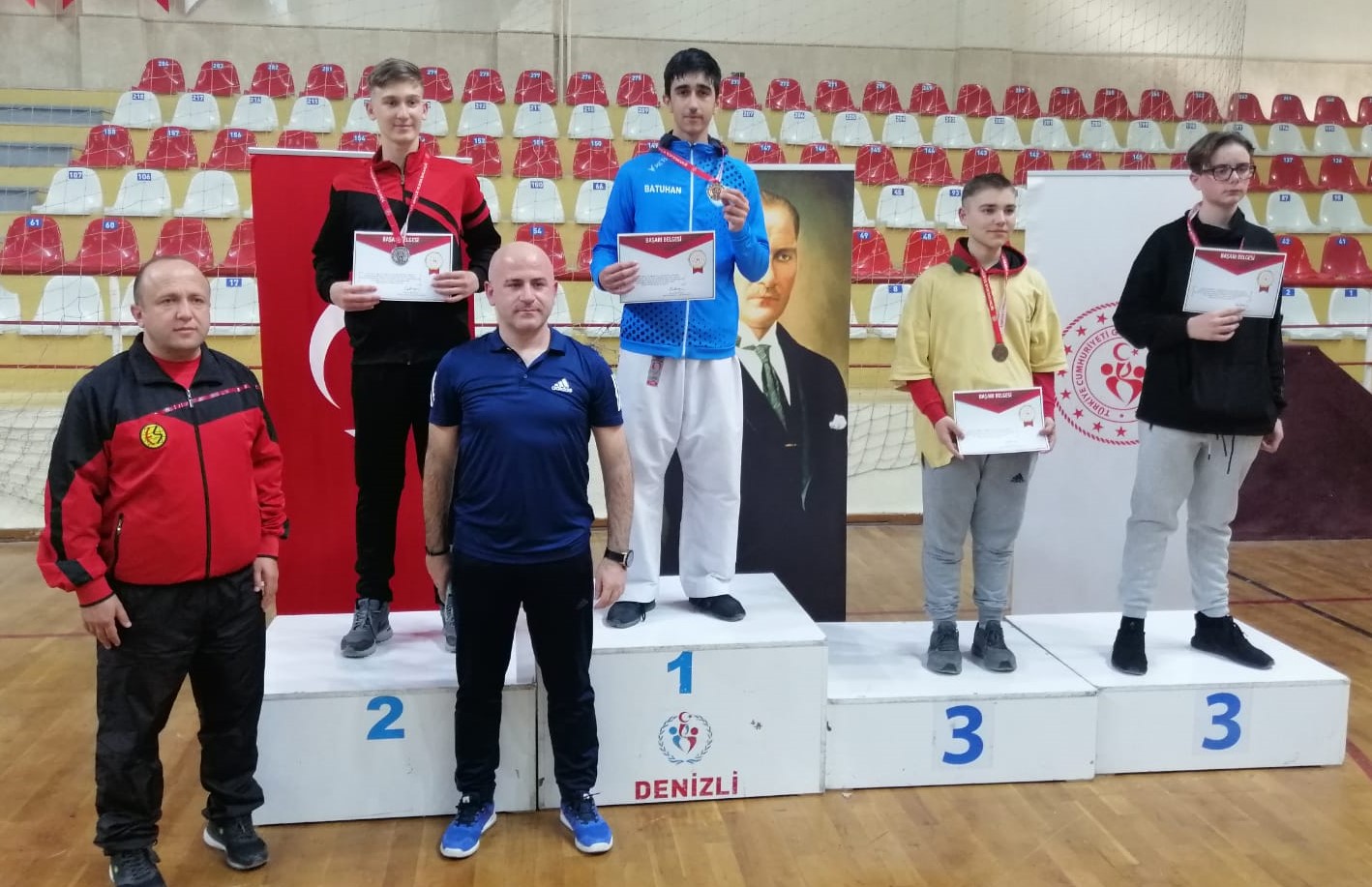Denizli’nin ev sahipliğinde gerçekleşen Okullar Arası Karate Bölge Şampiyonası’nda 12 ilden 350 sporcu mücadele verdi. Naile – Mehmet Ali Uyanık Anadolu Lisesi’nde eğitim hayatına devam eden Batuhan Doruk rakiplerini geride bırakarak bölge şampiyonu oldu ve altın madalya kazandı. Nevzat Karaalp Anadolu Lisesi takımında yer alan Aleyna Doruk ise kategorisinde bölge üçüncüsü olarak bronz madalya elde etti. Pamukkale Belediyespor Karate branşında spor yaşamını devam ettiren Batuhan Doruk ve Aleyna Doruk, 10-13 Mart 2022 tarihleri arasında Bartın’da yapılacak olan Türkiye Şampiyonası’nda boy gösterecek. Yine Pamukkale Belediyespor’un lisanslı sporcusu olan Bayram Ali Abay da Manisa’da yapılan Okullar Arası Güreş Bölge Şampiyonası’nda mücadele verdi. 16 yaşındaki sporcu Gülay Kaynak Mesleki Teknik Anadolu Lisesi’ni de temsil ettiği müsabakalarda bölge üçüncüsü olarak bronz madalya kazandı. Abay, Denizli’yi Mart ayında Tokat’ta yapılacak olan Türkiye Şampiyonası’nda temsil edecek.
