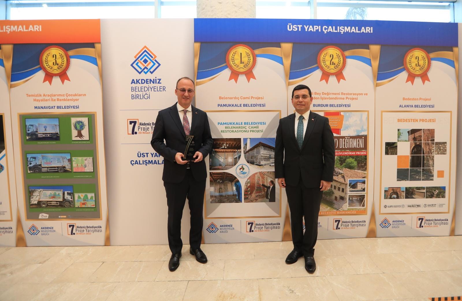 Pamukkale Belediyesi’nin ilçeye kazandırdığı projeleri ödüle doymuyor. Pamukkale Belediyesi, 7. Akdeniz Belediyecilik Proje Yarışması’nda 138 yıllık geçmişe sahip olan Tarihi Belenardıç Camii Restorasyonu ile birincilik, Pamukkale Arama Kurtarma Timi (PAKUT) kurulması projesiyle de üçüncülük ödülüne layık görüldü. Antalya’da düzenlenen törene Pamukkale Belediye Başkanı Avni Örki bizzat katılarak, Akdeniz Belediyeler Birliği Başkanı Hakan Tütüncü'den ödülü teslim aldı.