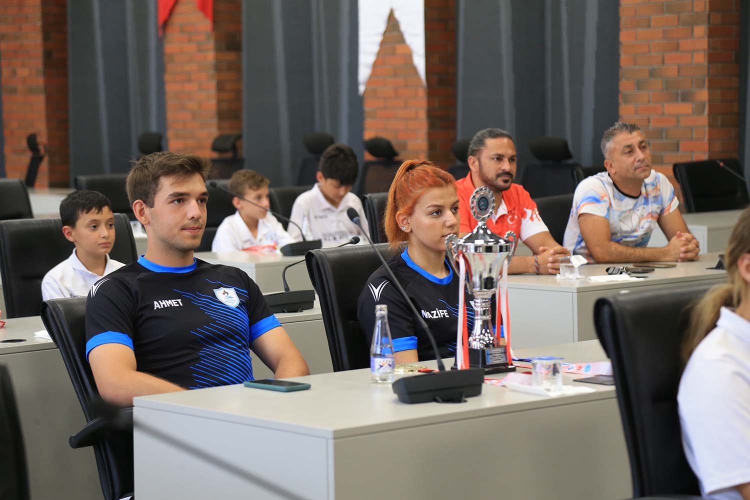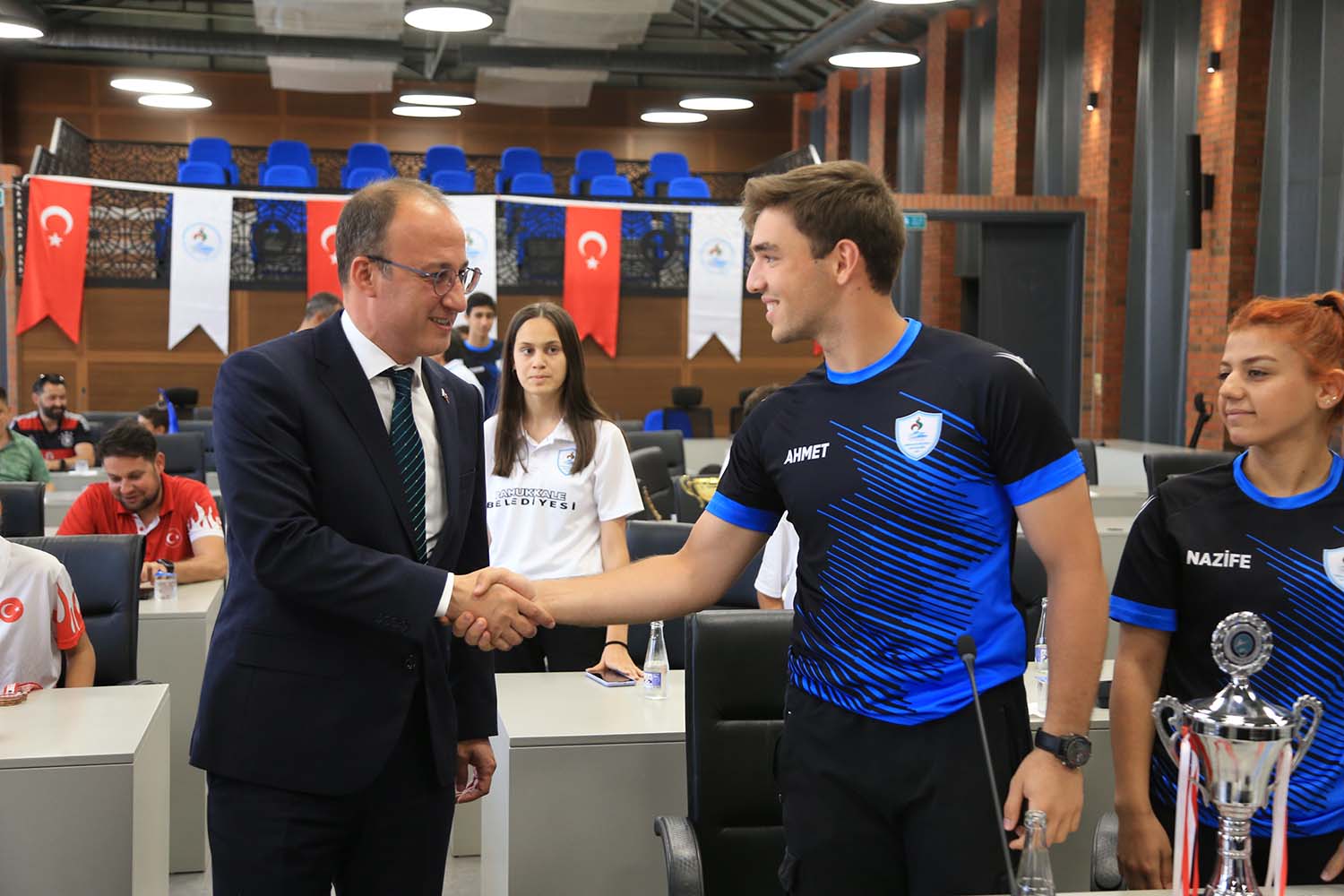 Pamukkale Belediyespor Kulübü sporcuları, 13 farklı branşta Türkiye başta olmak üzere, Denizli ve Pamukkale’nin adını başarıyla duyurmaya devam ediyor. Pamukkale Belediyespor Onursal Başkanı ve Pamukkale Belediye Başkanı Avni Örki, Belediye Meclis Salonu’nda 16'sı milli sporcu olan, kupa ve madalyalar kazanan 28 sporcuyla bir araya geldi. Mavi beyazlı kulübü yakından takip eden Pamukkale Belediye Başkanı Avni Örki, sporcularla sık sık bir araya gelmeye özen gösteriyor. Geçtiğimiz yıl Pamukkale Belediyespor’un şaha kalkacağını belirten Başkan Örki, “2022 yılına girdiğimizden bu yana sporcularımızın her biri yüzümüzü güldürüyor. Sporcularımıza destek olmak adına da spor yatırımlarımızı sürdürüyoruz” dedi.