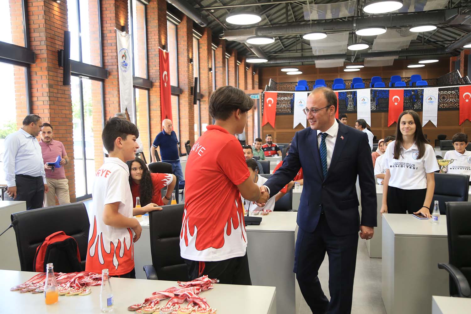 Pamukkale Belediye Meclis Salonu’nda sporcularla bir araya gelen Pamukkale Belediyespor Onursal Başkanı ve Pamukkale Belediye Başkanı Avni Örki, sporcuları, antrenörleri ve aileleri tebrik etti. Başkan Örki, “Yüzümüzü bir ayrı güldürüyorsunuz. Hepinize yürekten teşekkür ediyorum. Sizlerin güzel haberleri bizlerin motivasyonunu yükseltiyor. Bundan ötürü farkında olmadan Belediyecilik hizmetlerine yapmış olduğunuz bu destekten ötürü de teşekkür ediyorum. Her biriniz alanınızda aldığınız başarılar ile memleketimizin farklı köşelerindeki birçok genç kardeşimize de rol model oluyorsunuz. Sizi kendisine rol model yapan, sizin gibi olmaya çalışan nice genç kardeşimizin olduğunu bilmenizi istiyorum. Bu çok önemli bir sorumluluk, herkese nasip olacak bir durum değil. Bizim de hedefimiz aslında bu. Aldığınız başarılar ile ilçemizdeki gençlerimizi mutlu ettiğimizi bilmek çok güzel. Pamukkale Belediyesi olarak sporun her dalında sizin gibi genç kardeşlerimizin yanında olmaya gayret ettik, bundan sonra da arttırarak devam edeceğiz. Sizlerin başarısı için Pamukkale Belediye’mizin tüm imkânlarını seferber etmeye gayret ettik, bundan sonra da aynı şekilde arttırmak suretiyle devam edeceğiz. İnşallah yakın zamanda sizlerin hizmetine alacağımız spor tesislerimiz de olacak. Tek hedefimiz bireysel olarak sizlerin başarısı değil, sizler sayesinde sporla ilişkiyi olabildiğince geniş tabana yayabilmek. Bütün gençlerimizin sporla tanışmalarına vesile olma gayretindeyiz. Bu noktada da siz değerli yol arkadaşlarımızın çok büyük katkısına ihtiyacımız var. İşte sizlerin azimli çalışmalarıyla aldığınız bu kupalar, madalyalar bizlere en büyük katkı. Sadece Mayıs ayındaki başarılarınız ayrı bir gurur oldu. 16'sı milli sporcu olan, Mayıs ayında kupa ve madalyalar kazanan 28 sporcumuzla birlikte, Denizli'mizin, Pamukkale'mizin ve ülkemizin adını başarıyla duyuran tüm sporcularımızı tebrik ediyor, başarılarının devamını diliyorum” dedi.
