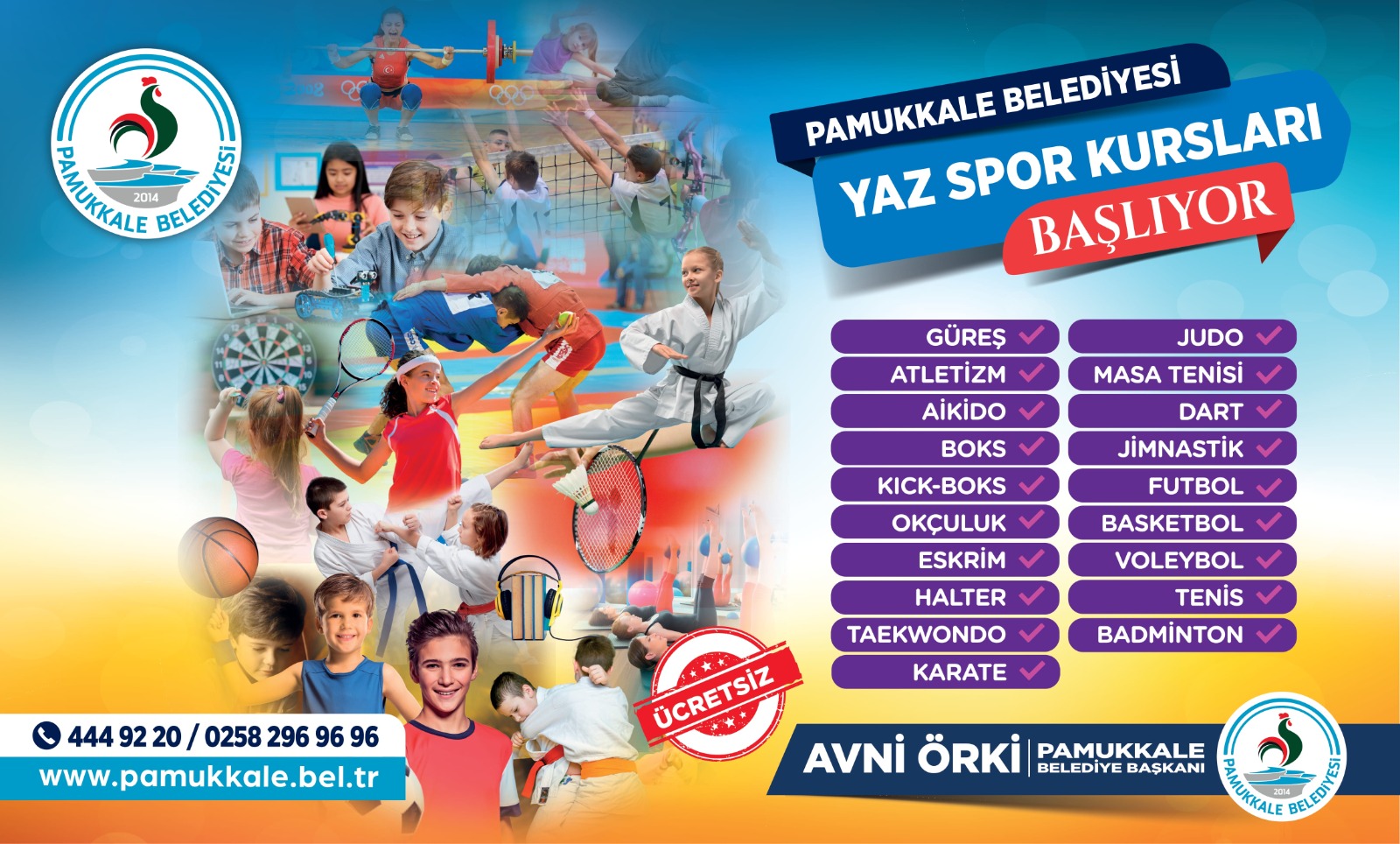Pamukkale Belediyesi geçtiğimiz yıl olduğu gibi, bu yaz tatilinde de gençlerin boş zamanlarını spor yaparak geçirmesi amacıyla Yaz Spor Kursları açıyor. 19 branşta 4-18 yaş arası gençlerin katılabileceği kurslara başvurular başladı. İlçe genelinde gençlerin yaz aylarını sporla dolu geçirmeleri amacıyla Pamukkale Belediyesi ve Pamukkale Gençlik ve Spor İlçe Müdürlüğü’nün işbirliğiyle, atletizm (8-14 yaş), aikido (06-18 yaş), badminton (6-15 yaş), basketbol (6-18 yaş), boks (8-17 yaş), jimnastik (4-7 yaş), eskrim (7-12 yaş), futbol (erkek-bayan 8-13 yaş), güreş (7-12 yaş), halter (11-18 yaş), karate (7-18 yaş), masa tenisi (6-15 yaş), judo (7-12 yaş), okçuluk (geleneksel-klasik 8-17 yaş), taekwondo (7-12 yaş), voleybol (9-16 yaş), dart (10-18 yaş), tenis (8-14 yaş), kick-boks (8-17 yaş) kursları açılıyor. İlçe’de bulunan spor salonlarında gerçekleşecek olan yaz spor kurslarına talep gelmesi halinde yeni branşlar da açılacak.