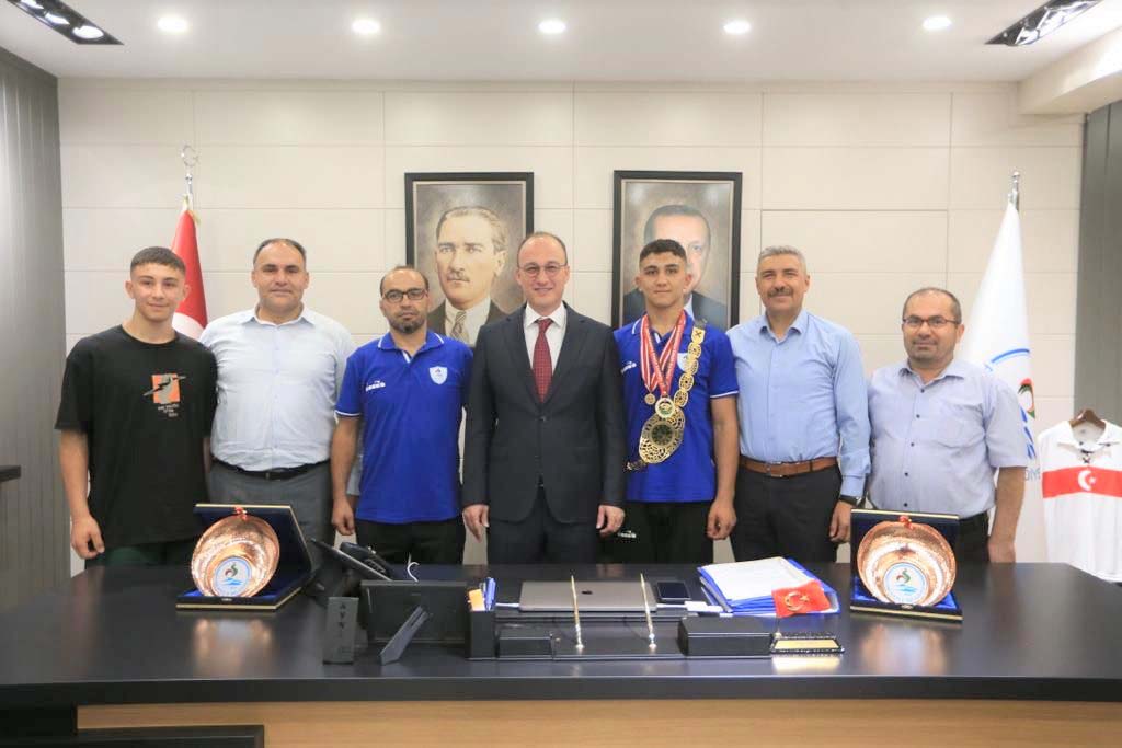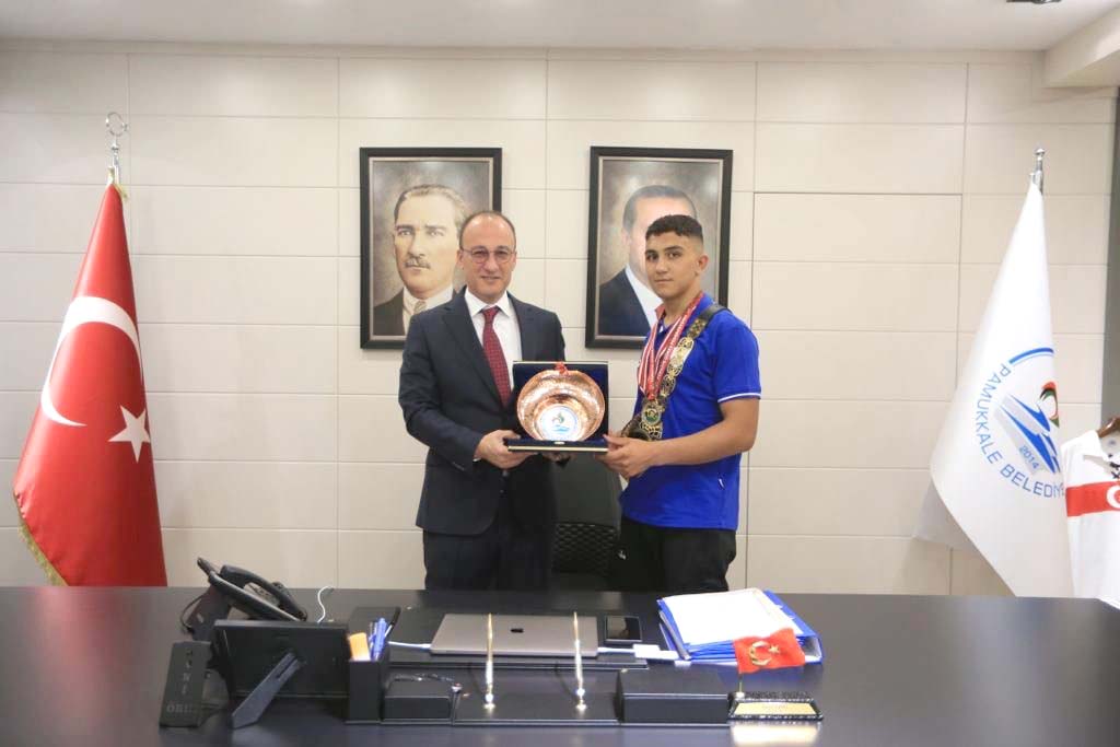 Pamukkale Belediyespor'un başarılı güreşçisi 14 yaşındaki Beytullah Sarı, Pamukkale Belediye Başkanı Avni Örki’yi ziyaret etti. Başkan Örki, “Genç pehlivanımız, katıldığı her er meydanından başarıyla çıkmasını biliyor. Son olarak Kırkpınar’da 198 rakibi arasında tozkoparan boyunda altın madalya kazandı” dedi.