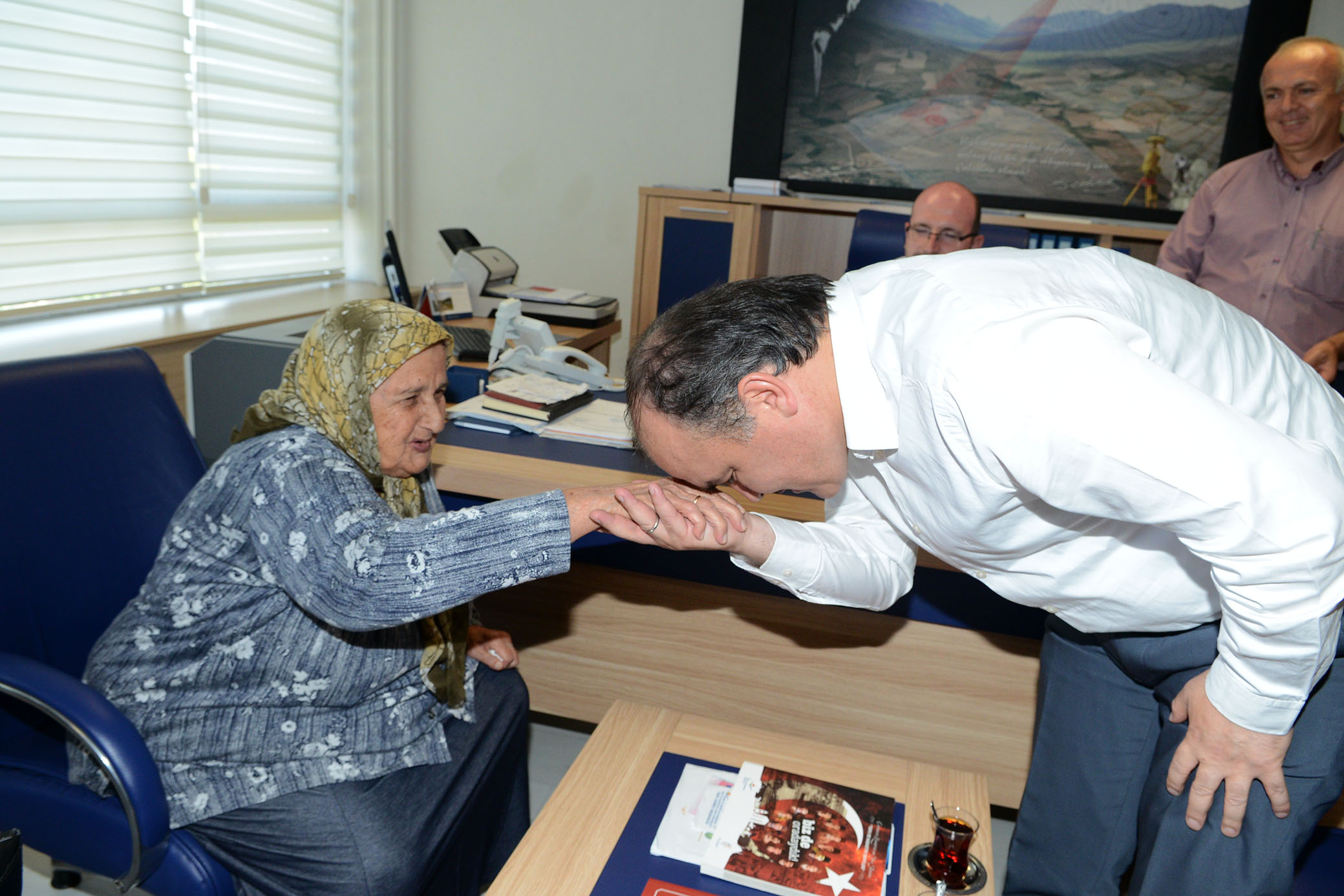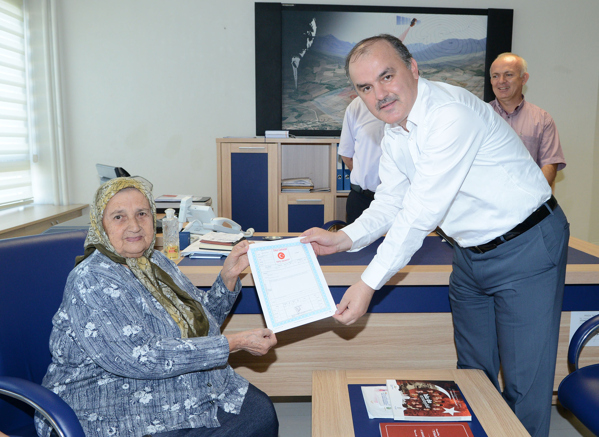 Baskan Gürlesin, Ilçe Tapu Müdürlügü’nde gerçeklesen hibe devir sonrasi Hayirsever Müserref teyzenin elini öperek bir kez daha tesekkürlerini iletti.