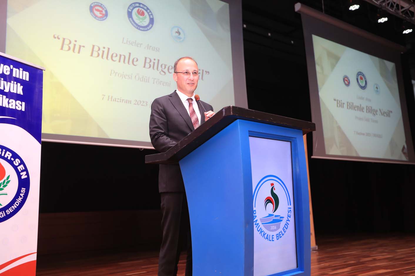 7 yıldır, 81 ilde gerçekleştirilen, öğretmen ve öğrencilerin bir arada yer aldığı “Bir Bilenle Bilge Nesil” projesinin Denizli ayağında Pamukkale Belediyesi desteğini esirgemedi. Törende konuşan Genç Memur Sen Denizli Başkanı Abdülkerim Cengiz, “Gençlerin okuma kültürünü geliştirmek, eleştirel düşünce yapılarını geliştirmek amacıyla yola çıktığımız ‘Bir Bilenle Bilge Nesil’ projemizin 7. yılını ulaştık. Türk Gençliği artık seyreden olmayı bırakıp, otomobil, uçak, insansız hava araçları başta olmak üzere genç mühendislerle ülkemiz hem mekanikte hem yazılımda dünya lideri olma yolunda emin adımlarla ilerlemektedir. Projemizin en önemli aşamalarından olan kitap temini kısmında 3 bin kitap temini ile destek olan Pamukkale Belediye Başkanımız Avni Örki’ye her zaman destekçimiz olan Eğitim Bir Sen’e, öğretmenlerimize ve emeği geçen herkese teşekkür ediyor, dereceye giren öğrencilerimizi tebrik ediyorum” diye konuştu. Eğitim-Bir-Sen Denizli 1 No'lu Şube Başkanı Feyzullah Öselmiş de “Düzenlenen ‘Bir Bilenle Bilge Nesil’ projesi 2016 yılından beri aralıksız olarak yapılıyor. Geçtiğimiz sene Pamukkale Belediye Başkanımız yine ödül programındaydı. İlk programdan itibaren 3 bin çocuğun yarışmaya katıldığını duyunca önümüzdeki sene 3 bin kitap sözü vermişti. Bu yıl sözünü yerine getirdiği için başkanımıza teşekkür ediyorum. Bu yıl 1500 öğrencimize 3 bin kitap dağıttık. Emeği geçen herkese teşekkür ediyorum” diye konuştu. Eğitim-Bir-Sen 2 nolu Şube başkanı Mehmet Baysal ise “Bir Bilenle Bilge Nesil, çok önemli bir proje. Çok önemli fikir ve düşünce insanlarının eserlerini 10 binlerce öğrenci ile buluşturan ve medeniyet coğrafyamızda yeni fikir filizlerinin oluşmasına imkân tanıyan önemli bir proje. Projeyi başlatan Eğitim Bir Sen’e, Denizli il yönetimine projeye destek veren Pamukkale Belediye Başkanımıza, İl Milli Eğitim Müdürümüze, okul yönetimlerimize teşekkür ediyorum” dedi.