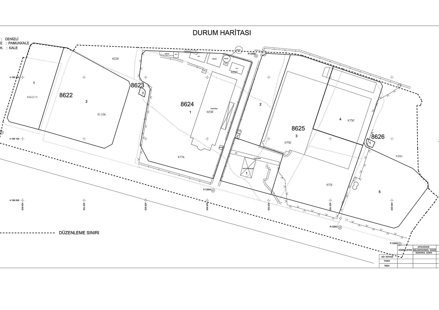 Pamukkale Belediyesi, Denizli ili Pamukkale ilçesi Kale Mahallesinde bulunan 8622 ada 1 ve 2 nolu parseller, 8623 ada 1 nolu parsel, 8624 ada 1 nolu parsel, 8625 ada 1, 2, 3, 4, 5 nolu parseller ve 8626 ada 1 nolu parsellerin bulunduğu alanı kapsayacak şekilde Arsa ve Arazi Düzenlemeleri Yönetmeliğinin 10. Maddesine göre düzenleme sınırının geçirilmesi, aynı yönetmeliğin 25. Maddesine göre ada dağıtımların ve parselasyon planın onaylanıp ilanın askıya çıkarıldığını bildirdi.