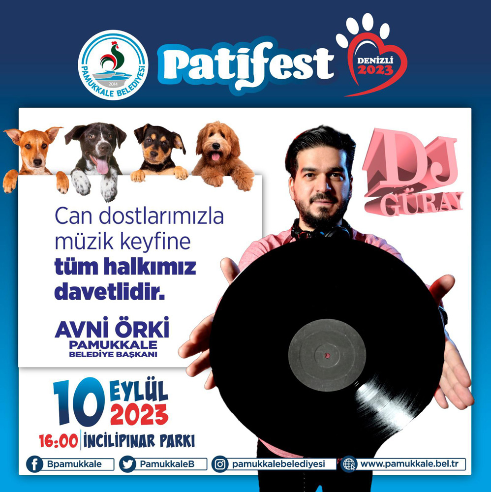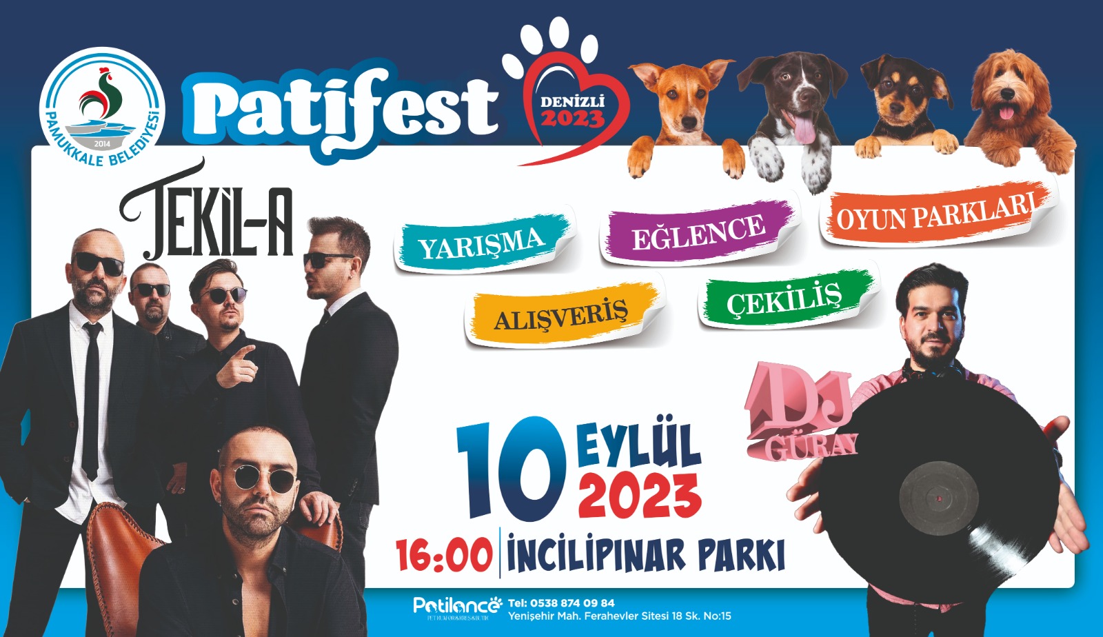 Sosyal farkındalık çalışmalarına önem veren Pamukkale Belediyesi, bu amaçla başlattığı etkinliği festivale dönüştürdü. Bu yıl dördüncüsü düzenlenecek olan “Pamukkale Belediyesi Patifest Denizli 2023” etkinliği hafta sonunda gerçekleşecek. Denizli’de hayvan dostlarının heyecanla beklediği Patifest, 10 Eylül 2023 Pazar Günü İncilipınar Parkı’nda saat 16.00’da başlayacak. Pamukkale Belediyesi Patifest Denizli 2023 kapsamında yarışmalar, eğlenceler, oyun parkları, alışveriş ve çekilişler yapılacak. Etkinlik alanında DJ Güray performansıyla katılımcıları coşturacak. Patifest 2023’de Tekil-A grubu konser verecek.